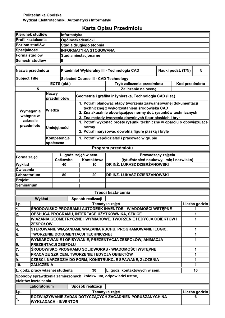 Politechnika Opolska Wydział Elektrotechniki, Automatyki i Informatyki Karta Opisu Przedmiotu Kierunek studiów Profil kształcenia Poziom studiów Specjalność Forma studiów Semestr studiów Informatyka Ogólnoakademicki Studia drugiego stopnia INFORMATYKA STOSOWANA Studia niestacjonarne II Nazwa przedmiotu Przedmiot Wybieralny III - Technologia CAD Subject Title Całk. 5 Wymagania wstępne w zakresie przedmiotu Nauki podst. (T/N) N Selected Course III - CAD Technology ECTS (pkt.) Tryb zaliczenia przedmiotu Kod przedmiotu Zaliczenie na ocenę Kont. 1,2 Prakt. 3,2 Nazwy Geometria i grafika inżynierska, Technologia CAD (I st.) przedmiotów 1. Potrafi planować etapy tworzenia zaawansowanej dokumentacji technicznej z wykorzystaniem środowiska CAD Wiedza 2. Zna aktualnie obowiązujące normy dot. rysunków technicznych 3. Zna metody tworzenia dowolnych figur płaskich i brył 1. Potrafi wykonać proste rysunki techniczne w oparciu o obowiązujące normy Umiejętności 2. Potrafi narysować dowolną figurę płaską i bryłę … Kompetencje 1. Potrafi współdziałać i pracować w grupie społeczne Program przedmiotu Forma zajęć Wykład Ćwiczenia Laboratorium Projekt Seminarium L. godz. zajęć w sem. Prowadzący zajęcia Całkowita Kontaktowa (tytuł/stopień naukowy, imię i nazwisko) 40 10 DR INŻ. LUKASZ DZIERŻANOWSKI | | 80 20 DR INŻ. LUKASZ DZIERŻANOWSKI | | | Treści kształcenia Wykład Sposób realizacji Tematyka zajęć ŚRODOWISKO PROGRAMU AUTODESK INVENTOR - WIADOMOŚCI WSTĘPNE OBSŁUGA PROGRAMU, INTERFACE UŻYTKOWNIKA, SZKICE WIĄZANIA GEOMETRYCZNE I WYMIAROWE, TWORZENIE I EDYCJA OBIEKTÓW I ZESPOŁÓW 3. STEROWANIE WIĄZANIAMI, WIĄZANIA RUCHU, PROGRAMOWANIE ILOGIC, 4. TWORZENIE DOKUMENTACJI TECHNICZNEJ 5. WYMIAROWANIE I OPISYWANIE, PREZENTACJA ZESPOŁÓW, ANIMACJA 6. PREZENTACJI ZESPOŁU ŚRODOWISKO PROGRAMU SOLIDWORKS - WIADOMOŚCI WSTĘPNE 7. PRACA ZE SZKICEM, TWORZENIE I EDYCJA OBIEKTÓW 8. CZĘSCI, NARZEDZIA DO FORM, KONSTRUKCJE SPAWANE, ZŁOŻENIA 9. 10. ZALICZENIA L. godz. pracy własnej studenta 30 L. godz. kontaktowych w sem. Sposoby sprawdzenia zamierzonych kolokwium, odpowiedzi ustne, efektów kształcenia Laboratorium Sposób realizacji Lp. Tematyka zajęć ROZWIĄZYWANIE ZADAŃ DOTYCZĄCYCH ZAGADNIEŃ PORUSZANYCH NA 1. WYKŁADACH - INVENTOR Lp. 1. 2. Liczba godzin 1 1 1 1 1 1 1 1 1 1 10 Liczba godzin 6 2. 3. 4. 5. 6. KOLOKWIUM ZALICZENIOWE - INVENTOR ROZWIĄZYWANIE ZADAŃ DOTYCZĄCYCH ZAGADNIEŃ PORUSZANYCH NA KOLOKWIUM ZALICZENIOWE - SOLIDWORKS PREZENTACJA ZAPROJEKTOWANYCH MODELI ZALICZENIA 1 8 1 2 2 L. godz. pracy własnej studenta 60 L. godz. kontaktowych w sem. 20 Sposoby sprawdzenia zamierzonych kolokwia zaliczeniowe, wykonywanie ćwiczeń, prezentacja efektów kształcenia zaprezentowanych modeli 1. Potrafi wymienić zasady modelowania parametrycznego Wiedza 2. Zna strukturę dokumentów w środowisku Inventor i Solid Works Efekty kształcenia dla przedmiotu - po zakończonym cyklu kształcenia Umiejętności 1. Potrafi utworzyć szkic, część i złożenie dla wskazanego układu mechanicznego 2. Potrafi wykonać dokumentację techczniczną dla modelu 3. Ma umiejętności samokształcenia się. Kompetencje społeczne 1. Rozumie potrzebę ciągłego dokształcania się 2. Potrafi odpowiednio określić priorytety służące realizacji określonego przez siebie lub innych zadania. … Metody dydaktyczne: Prezentacje multimedialne wykładowcy, dyskusje, rozwiązywanie zadań praktycznych w środowisku Inventor. Forma i warunki zaliczenia przedmiotu: Przedstawienie do oceny modelu narysowanego zgodnie z przedstawionymi założeniami. Literatura podstawowa: [1] Inventor 2010 Help – pomoc programu [2] Noga B., Kosma Z., Parczewski J.: Inventor. Pierwsze kroki, Helion 2009 [3] Stasiak F.: Autodesk Inventor 11. Zbiór ćwiczeń, Expertbooks 2006 [4] Babiuch M.: SolidWorks 2009 PL. Ćwiczenia [5] Kapias K.: SolidWorks 2001 Plus. Podstawy [6] [7] [8] Literatura uzupełniająca: [1] Waguespack C., Jahraus L.: Mastering Autodesk Inventor 2010, Sybex 2009 [2] Samuel S.M., Robbins K.E., Paul N.: Beginning to Advanced SolidWorks 2011 [3] [4] [5] [6] [7] ______________ * niewłaściwe przekreślić ………………………………………………….. ………………………………………………………. (kierownik jednostki organizacyjnej/bezpośredni przełożony: pieczęć/podpis (Dziekan Wydziału pieczęć/podpis)