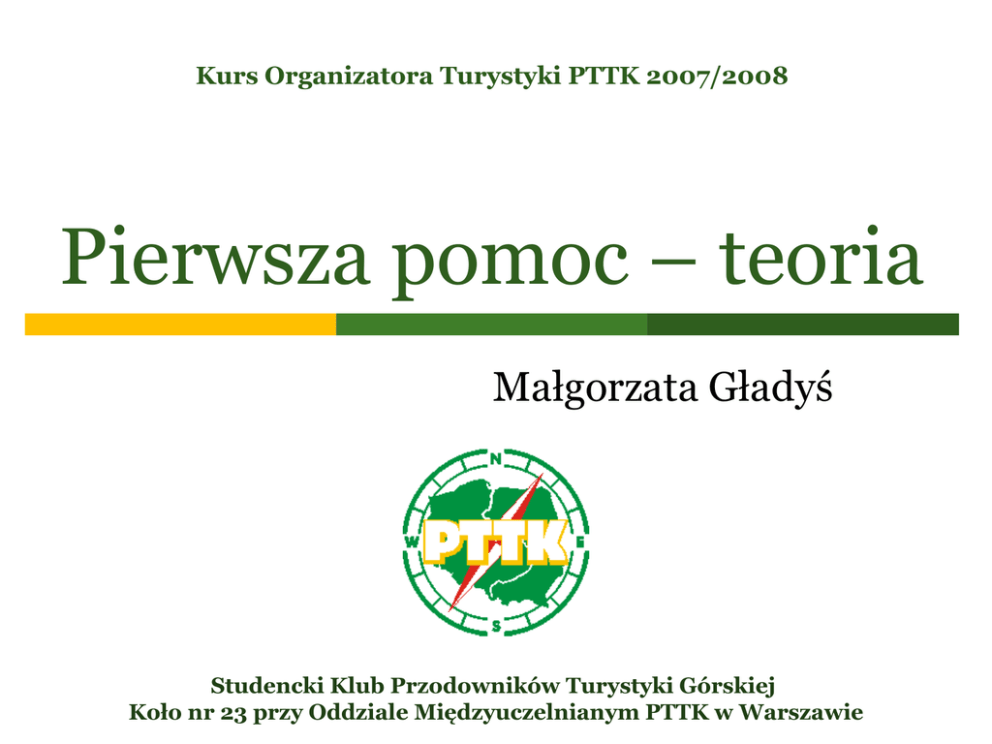 Kurs Organizatora Turystyki PTTK 2007/2008 Pierwsza pomoc – teoria Małgorzata Gładyś Studencki Klub Przodowników Turystyki Górskiej Koło nr 23 przy Oddziale Międzyuczelnianym PTTK w Warszawie Zakres materiału - teoria • • • • • Zasady bezpiecznego zachowania Profilaktyka zdrowotna Sposoby wzywania pomocy Organizacja miejsca wypadku Apteczka Studencki Klub Przodowników Turystyki Górskiej Koło nr 23 przy Oddziale Międzyuczelnianym PTTK w Warszawie Zakres materiału - praktyka • Pierwsza pomoc w najczęstszych przypadkach: • • • • • • • • • Resuscytacja krążeniowo-oddechowa Omdlenia Skaleczenia, krwotoki Złamania, zwichnięcia, skręcenia Udar słoneczny Odmrożenia i oparzenia Zatrucia pokarmowe Ukąszenia i użądlenia Ciała obce Studencki Klub Przodowników Turystyki Górskiej Koło nr 23 przy Oddziale Międzyuczelnianym PTTK w Warszawie Zasady bezpiecznego zachowania Bezpieczne zachowanie na drogach Bezpieczne zachowanie w terenie Bezpieczne zachowanie podczas burzy Bezpieczne zachowanie podczas wycieczek zimowych Studencki Klub Przodowników Turystyki Górskiej Koło nr 23 przy Oddziale Międzyuczelnianym PTTK w Warszawie Zachowanie na drogach • Zgodnie z kodeksem ruchu drogowego: • • • Grupa <10 osób lewą stroną drogi pojedynczo Grupa >10 osób prawą stroną drogi kolumną dwuosobową lub trzyosobową (w zależności od natężenia ruchu) Po zmroku i w trudnych warunkach oświetlenie grupy (z przodu białe, z tyłu czerwone, jeśli kolumna długa to z boku pomarańczowe) Studencki Klub Przodowników Turystyki Górskiej Koło nr 23 przy Oddziale Międzyuczelnianym PTTK w Warszawie Zachowanie w terenie • Przygotowanie do wycieczki: • • • Poznanie trasy i jej niebezpieczeństw przed wyruszeniem Zapoznanie się z prognozą pogody Prowadzenie wycieczki: • • • • Tempo marszu dostosowane do najsłabszego uczestnika Przechodzenie przez przeszkody – zatrzymujemy się w niedalekiej odległości po przejściu przez przeszkodę Podczas wspinania 3 punkty podparcia Nie zbiegać Studencki Klub Przodowników Turystyki Górskiej Koło nr 23 przy Oddziale Międzyuczelnianym PTTK w Warszawie Zachowanie w czasie burzy • • • • W przypadku pierwszych oznak burzy zawracamy lub skracamy trasę Niebezpieczne uderzenie pioruna w niedalekiej odległości (powoduje zaburzenia akcji serca) Większość burz w letnie popołudnia po upalnym dniu Odległość burzy (w metrach) liczba sekund pomiędzy błyskiem a grzmotem x 330 Studencki Klub Przodowników Turystyki Górskiej Koło nr 23 przy Oddziale Międzyuczelnianym PTTK w Warszawie Zachowanie w czasie burzy NIE • • • • • • • • Otwarta przestrzeń Szczyty górskie Przebywanie w i na wodzie Wysokie, samotne drzewa Kijki trekkingowe, czekan Metalowe siatki, przewody wysokiego napięcia Rozmowy przez telefon komórkowy Kładzenie się na ziemi TAK • • • • • • Schronienie w budynku, jaskini Schronienie w obniżeniu terenu (np. dolina, wąwóz) Poruszanie się małymi krokami Rozproszenie grupy Siadanie na plecaku (odizolowanie od podłoża) W przypadku poczucia naelektryzowania powietrza należy przykucnąć Studencki Klub Przodowników Turystyki Górskiej Koło nr 23 przy Oddziale Międzyuczelnianym PTTK w Warszawie Wycieczki zimowe • Przygotowanie do niskiej temperatury: • • • • • zdjęcie metalowych zegarów, kolczyków, okularów – ryzyko odmrożenia ubiór zapobiegający wychłodzeniu – szczególnie podczas postojów krem ochronny na zimę (pamiętamy o uszach!) bardziej kaloryczne posiłki gorące napoje na drogę Studencki Klub Przodowników Turystyki Górskiej Koło nr 23 przy Oddziale Międzyuczelnianym PTTK w Warszawie Wycieczki zimowe • Zabezpieczenie przed wilgocią • • • • • zaimpregnowane buty nieprzemakalne spodnie stuptuty lżejszy ubiór podczas marszu, cieplejszy na postoju suche skarpetki i rękawiczki Studencki Klub Przodowników Turystyki Górskiej Koło nr 23 przy Oddziale Międzyuczelnianym PTTK w Warszawie Wycieczki zimowe • Przygotowanie do utrudnionych warunków związanych z zimą i ze śniegiem: • • • • • wolniejsze tempo marszu nieprzetarte szlaki utrudnienie orientacji w terenie krótszy dzień zagrożenie lawinami o o o dowiadywanie się o stopniu zagrożenia, unikanie stoków nachylonych >30˚, południowych ostrożne przechodzenie przez płaty śniegu o każdej porze roku Studencki Klub Przodowników Turystyki Górskiej Koło nr 23 przy Oddziale Międzyuczelnianym PTTK w Warszawie Profilaktyka zdrowotna Odpowiednia dieta Higiena Odpowiedni ubiór Odpowiedni sprzęt i akcesoria Odpowiednia trasa Studencki Klub Przodowników Turystyki Górskiej Koło nr 23 przy Oddziale Międzyuczelnianym PTTK w Warszawie Odpowiednia dieta • • • • Kaloryczność posiłków Regularność posiłków Zróżnicowana dieta Witaminy i mikroelementy Studencki Klub Przodowników Turystyki Górskiej Koło nr 23 przy Oddziale Międzyuczelnianym PTTK w Warszawie Higiena • • • • Higiena osobista Higiena przygotowania posiłków Odpowiednie przechowywanie produktów spożywczych Czysta woda Studencki Klub Przodowników Turystyki Górskiej Koło nr 23 przy Oddziale Międzyuczelnianym PTTK w Warszawie Odpowiedni ubiór • Dobór ubrań do warunków pogodowych • • • • • • Ochrona przed słońcem Ochrona przed zimnem Ochrona przed wiatrem Ochrona przed deszczem Wygodne, rozchodzone, suche buty Czapka, szalik rękawiczki – nie tylko zimą Studencki Klub Przodowników Turystyki Górskiej Koło nr 23 przy Oddziale Międzyuczelnianym PTTK w Warszawie Odpowiedni sprzęt i akcesoria • • • • • Okulary przeciwsłoneczne – nie tylko latem Wygodny plecak Odpowiednio dobrany śpiwór Latem – krem z filtrem, zimą – krem ochronny Warto zawsze mieć przy sobie: • • • Latarkę Scyzoryk Linkę Studencki Klub Przodowników Turystyki Górskiej Koło nr 23 przy Oddziale Międzyuczeln
