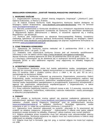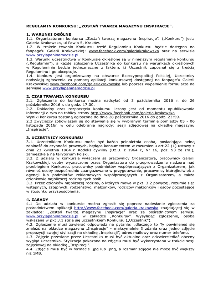 REGULAMIN KONKURSU: „ZOSTAŃ TWARZĄ MAGAZYNU INSPIRACJE". 1. WARUNKI OGÓLNE 1.1. Organizatorem konkursu „Zostań twarzą magazynu Inspiracje”. („Konkurs”) jest: Galeria Krakowska, ul Pawia 5, Kraków. 1.2. W trakcie trwania Konkursu treść Regulaminu Konkursu będzie dostępna na fanpage'u Galerii Krakowskiej: www.facebook.com/galeriakrakowska oraz na serwisie www.przylapaninamodzie.pl. 1.3. Warunki uczestnictwa w Konkursie określone są w niniejszym regulaminie konkursu („Regulamin”), a każde zgłoszenie Uczestnika do konkursu na warunkach określonych w Regulaminie będzie jednoznaczne z faktem, iż Uczestnik zapoznał się z treścią Regulaminu i go akceptuje. 1.4. Konkurs jest organizowany na obszarze Rzeczypospolitej Polskiej, Uczestnicy nadsyłają zgłoszenia za pomocą aplikacji konkursowej dostępnej na fanpage'u Galerii Krakowskiej www.facebook.com/galeriakrakowska lub poprzez wypełnienie formularza na serwisie www.przylapaninamodzie.pl 2. CZAS TRWANIA KONKURSU 2.1. Zgłoszenia do konkursu można nadsyłać od 3 października 2016 r. do 26 października 2016 r. do godz. 17.00. 2.2. Dokładny czas rozpoczęcia konkursu liczony jest od momentu opublikowania informacji o tym na tablicy strony http://www.facebook.com/galeria.krakowska Wyniki konkursu zostaną ogłoszone do dnia 28 października 2016 do godz. 23:59. 2.3 Zwycięzcy zobowiązani są do stawienia się w wybranym terminie pomiędzy 05 - 06 listopada 2016r. w celu odebrania nagrody: sesji zdjęciowej na okładkę magazynu „Inspiracje”. 3. UCZESTNICY KONKURSU 3.1. Uczestnikiem Konkursu może być każda pełnoletnia osoba, posiadająca pełną zdolność do czynności prawnych, będąca konsumentem w rozumieniu art.22 (1) ustawy z dnia 23 kwietnia 1964 r. Kodeks cywilny (Dz.U. z 1964 r., Nr 16, poz. 93 ze zm.), zamieszkała na terytorium Polski. 3.2. Z udziału w konkursie wyłączeni są pracownicy Organizatora, pracownicy Galerii Krakowskiej, osoby wyznaczone przez Organizatora do przeprowadzenia nadzoru nad przebiegiem Konkursu, pracownicy podmiotów współpracujących z Organizatorem, jak również osoby bezpośrednio zaangażowane w przygotowanie, pracownicy którejkolwiek z agencji lub podmiotów reklamowych współpracujących z Organizatorem, a także członkowie najbliższej rodziny tych osób. 3.3. Przez członków najbliższej rodziny, o których mowa w pkt. 3.2 powyżej, rozumie się: wstępnych, zstępnych, rodzeństwo, małżonków, rodziców małżonków i osoby pozostające w stosunku przysposobienia. 4. ZASADY 4.1 Do udziału w konkursie można zgłosić się poprzez nadesłanie zgłoszenia za pośrednictwem aplikacji http://www.facebook.com/galeria.krakowska znajdującej się w zakładce: „Zostań twarzą magazynu Inspiracje” oraz za pośrednictwem serwisu www.przylapaninamodzie.pl w zakładce „Konkursy”. Wysyłając zgłoszenie, osoba wskazana w pkt 3.1 staje się uczestnikiem Konkursu („Uczestnik”). 4.2. Zgłoszenie musi zawierać odpowiedź na pytanie: „dlaczego to Ty powinieneś się znaleźć na okładce magazynu „Inspiracje” - maksymalnie 3 zdania oraz jedno zdjęcie propozycji swojej stylizacji na okładkę „Inspiracji”, adres mailowy oraz numer telefonu. 4.3. Zdjęcie przesłane przez Uczestnika musi być aktualne oraz odzwierciedlać obecny wygląd Uczestnika. Stylizacja pokazana na zdjęciu musi być wykorzystana w trakcie sesji zdjęciowej na okładkę „Inspiracji”. 4.4. Zdjęcie musi być w formacie .jpg lub .png, a rozmiar zdjęcia nie może być większy niż 1MB. 4.5. Zdjęcia nie mogą zawierać treści erotycznych, niecenzuralnych, naruszających powszechnie panujące zasady moralności, godności osobistej, nawiązań do symboli religijnych, etnicznych lub rasowych. Zdjęcia nie mogą również przedstawiać nagości (ukazywać narządów płciowych). 4.6. Nadsyłając zdjęcia Uczestnicy zaświadczają, że posiadają pełne prawa do tego zdjęcia oraz, że nie jest to zdjęcie celebryty lub jakiejś innej powszechnie znanej osoby. Jeśli na zdjęciu znajdują się członkowie rodziny Uczestnika lub też jego przyjaciele, Uczestnik musi mieć ich wcześniejszą zgodę na użycie tej fotografii w Konkursie. Na nadesłanych zdjęciach nie może być widocznego logo lub znaku towarowego (np. herb drużyny sportowej lub logo marki odzieżowej). Zdjęcie, co do którego Organizator poweźmie wątpliwość, że może ono naruszać prawa osób trzecich, w szczególności prawa autorskie nie będzie uwzględnione i zostanie zdyskwalifikowane. 4.7. Czas nadsyłania zgłoszeń jest rejestrowany przez aplikację. 4.8. Zwycięzcy mają obowiązek przed sesją zdjęciowa podpisać zgodę na bezpłatne wykorzystanie swojego wizerunku. 4.9. Zwycięzcy zgadzają się na prezentację własnego wizerunku na serwisie przylapaninamodzie.pl, stronie www oraz na wszystkich kanałach społecznościowych: Galerii Krakowskiej. 4.10. Jury w składzie: Dyrekcja Galerii Krakowskiej wybierze 50 najciekawszych odpowiedzi oraz najlepszych stylizacji i ich autorów nagrodzi. 4.11. Informację o wygranej Zwycięzcy otrzymają telefonicznie. Dodatkowo wyniki Konkursu będą ogłaszane na stronie http://www.facebook.com/galeria.krakowska oraz serwisie www.przylapaninamodzie.pl. 4.12. Jeżeli po trzykrotnej próbie Organizator nie będzie mógł się skontaktować z którymś ze Zwycięzców, wybierze inną osobę. 4.13. W Konkursie wezmą udział wyłącznie zgłoszenia, które dotrą do Organizatora w okresie trwania zgłoszeń określonym w pkt. 2.2, spełniające warunki Regulaminu. 4.14. Ilekroć w Regulaminie jest mowa o dotarciu zgłoszenia do Organizatora, należy przez to rozumieć wpływ zadania konkursowego zarejestrowanego przez aplikację. Data i godzina wpływu odpowiedzi na pytania konkursowe zostanie ustalona na podstawie informacji zarejestrowanej przez aplikację. 4.15. Organizator nie ponosi odpowiedzialności za zgłoszenia zagubione przez system inf