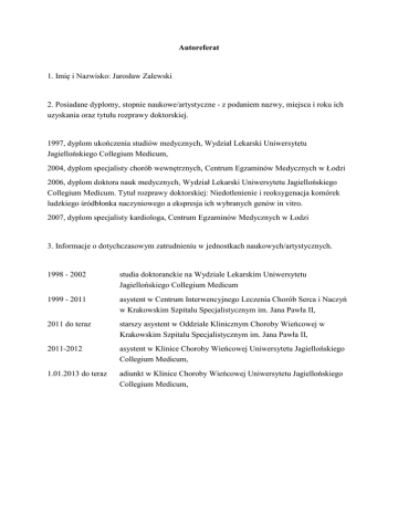 Autoreferat 1. Imię i Nazwisko: Jarosław Zalewski 2. Posiadane dyplomy, stopnie naukowe/artystyczne - z podaniem nazwy, miejsca i roku ich uzyskania oraz tytułu rozprawy doktorskiej. 1997, dyplom ukończenia studiów medycznych, Wydział Lekarski Uniwersytetu Jagiellońskiego Collegium Medicum, 2004, dyplom specjalisty chorób wewnętrznych, Centrum Egzaminów Medycznych w Łodzi 2006, dyplom doktora nauk medycznych, Wydział Lekarski Uniwersytetu Jagiellońskiego Collegium Medicum. Tytuł rozprawy doktorskiej: Niedotlenienie i reoksygenacja komórek ludzkiego śródbłonka naczyniowego a ekspresja ich wybranych genów in vitro. 2007, dyplom specjalisty kardiologa, Centrum Egzaminów Medycznych w Łodzi 3. Informacje o dotychczasowym zatrudnieniu w jednostkach naukowych/artystycznych. 1998 - 2002 studia doktoranckie na Wydziale Lekarskim Uniwersytetu Jagiellońskiego Collegium Medicum 1999 - 2011 asystent w Centrum Interwencyjnego Leczenia Chorób Serca i Naczyń w Krakowskim Szpitalu Specjalistycznym im. Jana Pawła II, 2011 do teraz starszy asystent w Oddziale Klinicznym Choroby Wieńcowej w Krakowskim Szpitalu Specjalistycznym im. Jana Pawła II, 2011-2012 asystent w Klinice Choroby Wieńcowej Uniwersytetu Jagiellońskiego Collegium Medicum, 1.01.2013 do teraz adiunkt w Klinice Choroby Wieńcowej Uniwersytetu Jagiellońskiego Collegium Medicum, 4. Wskazanie osiągnięcia* wynikającego z art. 16 ust. 2 ustawy z dnia 14 marca 2003 r. o stopniach naukowych i tytule naukowym oraz o stopniach i tytule w zakresie sztuki (Dz. U. nr 65, poz. 595 ze zm.): a) tytuł osiągnięcia naukowego/artystycznego: Nowe prozakrzepowe mechanizmy towarzyszące upośledzonej nasierdziowej i tkankowej reperfuzji w świeżym zawale serca oraz zakrzepicy w stencie. b) (autor/autorzy, tytuł/tytuły publikacji, rok wydania, nazwa wydawnictwa): Jaroslaw Zalewski, Krzysztof Nycz, Tadeusz Przewłocki, Monika Durak, Michał Cul, Wojciech Zajdel, Krzysztof Zmudka. Evolution of myocardial perfusion during primary angioplasty in spontaneously reperfused infarct-related artery. Impact on long-term clinical outcomes and left ventricular function recovery. International Journal of Cardiology 2011; 147: 25-31 (IF 7,078). Jarosław Zalewski, Anetta Undas, Jacek Godlewski, Ewa Stepien, Krzysztof Zmudka. No-reflow phenomenon after acute myocardial infarction is associated with reduced clot permeability and susceptibility to lysis. Arteriosclerosis Thrombosis and Vascular Biology 2007; 27: 2258-2265 (IF 7,221). Jarosław Zalewski, Monika Durak, Piotr Lech, Grzegorz Gajos, Anetta Undas, Jadwiga Nessler, Agnieszka Rosławiecka, Krzysztof Żmudka. Platelet activation and microvascular injury in patients with ST-segment elevation myocardial infarction. Kardiologia Polska 2012; 70: 677-684 (IF 0,536). Anetta Undas*, Jaroslaw Zalewski*, Marek Krochin, Zbigniew Siudak, Marcin Sadowski, Jerzy Pregowski, Dariusz Dudek, Marianna Janion, Adam Witkowski, Krzysztof Zmudka. Altered plasma fibrin clot properties are associated with in-stent thrombosis. Arteriosclerosis Thrombosis and Vascular Biology 2010; 30: 276-82 (IF 7,215). *A.U. and J.Z. equally contributed to this work. c) omówienie celu naukowego ww. prac i osiągniętych wyników wraz z omówieniem ich ewentualnego wykorzystania. Pomimo aspiracji skrzepliny i przywrócenia pełnego przepływu nasierdziowego, mechaniczna reperfuzja w ostrym zawale mięśnia sercowego (myocardial infarction, MI) wiąże się z uszkodzeniem mikrokrążenia wieńcowego, obrzękiem przestrzeni międzykomórkowej i martwicą kardiomiocytów (Braunwald E, Kloner RA, J Clin Invest 1985), które w konsekwencji prowadzą do zaburzenia perfuzji tkankowej tzw. zjawiska braku reperfuzji (noreflow phenomenon, Kloner RA. J Clin Invest 1974). Dotyczy ono do 30% pacjentów poddawanych pierwotnej przezskórnej interwencji wieńcowej (primary percutaneous coronary intervention, PPCI) (Gibson CM i wsp. Circulation 2000, Rezkalla SH i wsp. J Interv Cardiol 2010). Z kolei niepełna reperfuzja łożyska wieńcowego podczas MI wiąże się z większą strefa zawału (Feldman LJ i wsp. JACC 2000), gorszą kurczliwością lewej komory (left ventricle, LV), większą śmiertelnością i częstszym występowaniem objawów niewydolności serca będących konsekwencją niekorzystnej przebudowy LV (Rezkalla SH i wsp. J Interv Cardiol 2010). Nawet niewielkie uszkodzenie mikrokrążenia można zidentyfikować przy pomocy rezonansu magnetycznego jako tzw. obstrukcja mikrokrążenia (microvascular obstruction, MVO) (Bogaert J i wsp. Eur Radiol 2007). Histopatologiczna charakterystyka MVO jest obecnie intensywnie badana (Robbers LF i wsp. Eur Heart J 2013) a samo wystąpienie MVO u pacjentów z MI wiąże się gorszym przebiegiem klinicznym, tworzeniem cienkiej blizny i przebudową LV, w sposób niezależny od wielkości strefy zawału (Wu KC i wsp. Circulation 1998, Ørn S i wsp. Eur Heart J 2009). Dlatego zmniejszenie strefy uszkodzenia mikrokrążenia w warunkach klinicznych stało się istotnym celem terapeutycznym (Kloner RA Circ Res 2013). Szybkie przywrócenie przepływu nasierdziowego jest warunkiem koniecznym dla uratowania jak największego obszaru objętego niedokrwieniem a także dla dobrego wyniku klinicznego (Stone GW i wsp. Am J Cardiol 2007). Spontaniczna, pełna TIMI-3 (Thrombolysis in Myocardial Infarciton) repefuzja nasierdziowa występuje u 10-30% pacjentów z zawałem przebiegającym z uniesieniem odcinka ST (ST-segment elevation myocardial infarction, STEMI) (Stone GW i wsp. Circulation 2001, Bainey KR i wsp. Am Heart J 2008). Niemniej drożna tętnica dozawałowa często wypełniona jest świeżymi zakrzepami o różnych rozmiarach i dlatego wczesna interwencja w prozakrzepowym środowisku już drożnej tętnicy może wiązać się z wysokim ryzykiem dystalnej embolizacji i pogorszeniem perfuzji tkankowej (De Luca G i wsp. J Thromb Thrombolysis 2007). W konsekwencji, korzyści wynikające z wczesnej, sponta