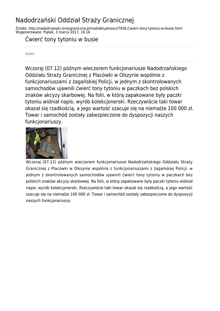 Nadodrzański Oddział Straży Granicznej Źródło: http://nadodrzanski.strazgraniczna.pl/nad/aktualnosci/7926,Cwierc-tony-tytoniu-w-busie.html Wygenerowano: Piątek, 3 marca 2017, 16:16 Ćwierć tony tytoniu w busie Autor: Wczoraj (07.12) późnym wieczorem funkcjonariusze Nadodrzańskiego Oddziału Straży Granicznej z Placówki w Olszynie wspólnie z funkcjonariuszami z żagańskiej Policji, w jednym z skontrolowanych samochodów ujawnili ćwierć tony tytoniu w paczkach bez polskich znaków akcyzy skarbowej. Na folii, w którą zapakowane były paczki tytoniu widniał napis: wyrób kolekcjonerski. Rzeczywiście taki towar okazał się rzadkością, a jego wartość szacuje się na niemalże 100 000 zł. Towar i samochód zostały zabezpieczone do dyspozycji naszych funkcjonariuszy. Wczoraj (07.12) późnym wieczorem funkcjonariusze Nadodrzańskiego Oddziału Straży Granicznej z Placówki w Olszynie wspólnie z funkcjonariuszami z żagańskiej Policji, w jednym z skontrolowanych samochodów ujawnili ćwierć tony tytoniu w paczkach bez polskich znaków akcyzy skarbowej. Na folii, w którą zapakowane były paczki tytoniu widniał napis: wyrób kolekcjonerski. Rzeczywiście taki towar okazał się rzadkością, a jego wartość szacuje się na niemalże 100 000 zł. Towar i samochód zostały zabezpieczone do dyspozycji naszych funkcjonariuszy.