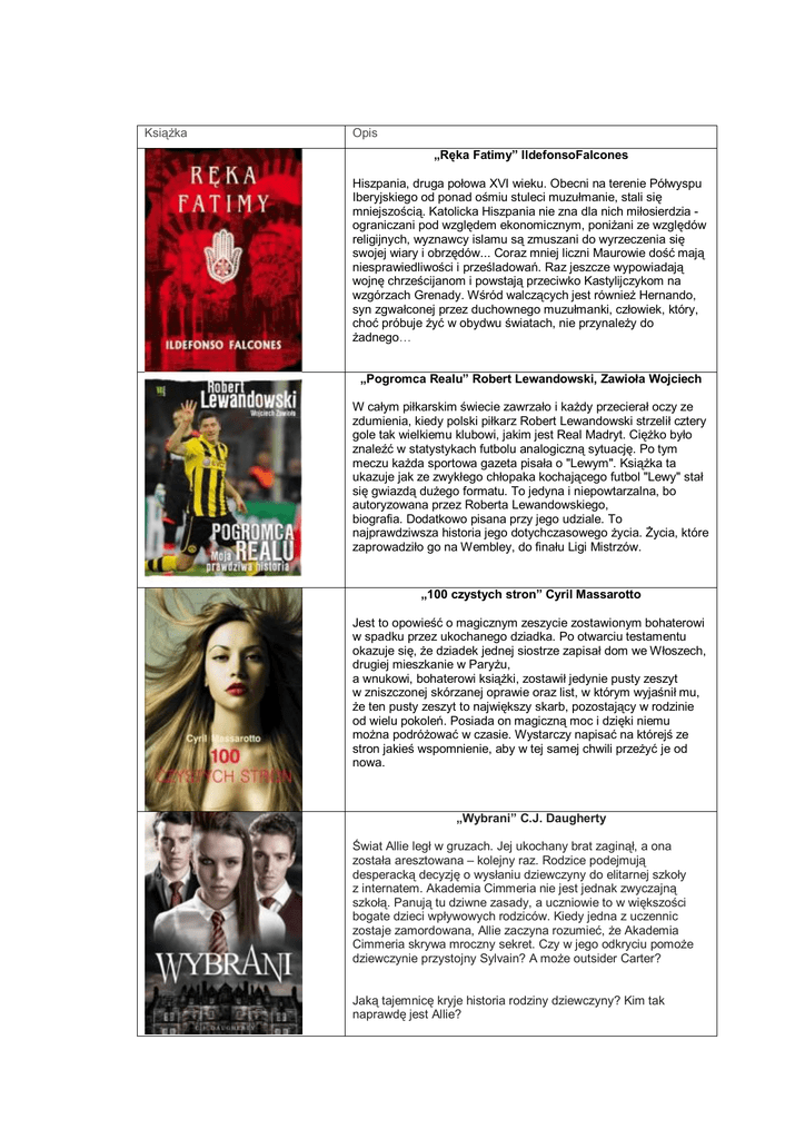 Książka Opis „Ręka Fatimy” IldefonsoFalcones Hiszpania, druga połowa XVI wieku. Obecni na terenie Półwyspu Iberyjskiego od ponad ośmiu stuleci muzułmanie, stali się mniejszością. Katolicka Hiszpania nie zna dla nich miłosierdzia ograniczani pod względem ekonomicznym, poniżani ze względów religijnych, wyznawcy islamu są zmuszani do wyrzeczenia się swojej wiary i obrzędów... Coraz mniej liczni Maurowie dość mają niesprawiedliwości i prześladowań. Raz jeszcze wypowiadają wojnę chrześcijanom i powstają przeciwko Kastylijczykom na wzgórzach Grenady. Wśród walczących jest również Hernando, syn zgwałconej przez duchownego muzułmanki, człowiek, który, choć próbuje żyć w obydwu światach, nie przynależy do żadnego… „Pogromca Realu” Robert Lewandowski, Zawioła Wojciech W całym piłkarskim świecie zawrzało i każdy przecierał oczy ze zdumienia, kiedy polski piłkarz Robert Lewandowski strzelił cztery gole tak wielkiemu klubowi, jakim jest Real Madryt. Ciężko było znaleźć w statystykach futbolu analogiczną sytuację. Po tym meczu każda sportowa gazeta pisała o "Lewym". Książka ta ukazuje jak ze zwykłego chłopaka kochającego futbol "Lewy" stał się gwiazdą dużego formatu. To jedyna i niepowtarzalna, bo autoryzowana przez Roberta Lewandowskiego, biografia. Dodatkowo pisana przy jego udziale. To najprawdziwsza historia jego dotychczasowego życia. Życia, które zaprowadziło go na Wembley, do finału Ligi Mistrzów. „100 czystych stron” Cyril Massarotto Jest to opowieść o magicznym zeszycie zostawionym bohaterowi w spadku przez ukochanego dziadka. Po otwarciu testamentu okazuje się, że dziadek jednej siostrze zapisał dom we Włoszech, drugiej mieszkanie w Paryżu, a wnukowi, bohaterowi książki, zostawił jedynie pusty zeszyt w zniszczonej skórzanej oprawie oraz list, w którym wyjaśnił mu, że ten pusty zeszyt to największy skarb, pozostający w rodzinie od wielu pokoleń. Posiada on magiczną moc i dzięki niemu można podróżować w czasie. Wystarczy napisać na którejś ze stron jakieś wspomnienie, aby w tej samej chwili przeżyć je od nowa. „Wybrani” C.J. Daugherty Świat Allie legł w gruzach. Jej ukochany brat zaginął, a ona została aresztowana – kolejny raz. Rodzice podejmują desperacką decyzję o wysłaniu dziewczyny do elitarnej szkoły z internatem. Akademia Cimmeria nie jest jednak zwyczajną szkołą. Panują tu dziwne zasady, a uczniowie to w większości bogate dzieci wpływowych rodziców. Kiedy jedna z uczennic zostaje zamordowana, Allie zaczyna rozumieć, że Akademia Cimmeria skrywa mroczny sekret. Czy w jego odkryciu pomoże dziewczynie przystojny Sylvain? A może outsider Carter? Jaką tajemnicę kryje historia rodziny dziewczyny? Kim tak naprawdę jest Allie? „Dziedzictwo” C.J. Daugherty Drugi tom bestsellerowej sagi Wybrani zabierze Was ponownie do najbardziej ekskluzywnej szkoły w Wielkiej Brytanii i odkryje jej kolejne sekrety. Czy Allie pozna wreszcie największą tajemnicę swojego życia i rozwiąże zagadkę Nocnej Szkoły? Kim jest tajemniczy szpieg działający w Akademii Cimmeria? Czy szkoła jest gotowa na kolejny atak Nathaniela? „Inferno” Dan Brown Robert Langdon, światowej sławy specjalista w dziedzinie symboli, budzi się w zupełnie obcym miejscu w szpitalnym łóżku. Nie pamięta, jak i dlaczego znalazł się w szpitalu, ani skąd się wziął tajemniczy przedmiot, który znajduje w swojej marynarce. Nie ma jednak czasu na rozmyślania. Ledwie odzyskuje przytomność, już ktoś usiłuje go zabić. Bohater w pośpiechu opuszcza szpital w towarzystwie młodej lekarki. Ścigany przez wrogów przemierza uliczki Florencji, próbując rozwikłać tajemniczą zagadkę. Podąża śladem wskazówek zawartych w słynnym poemacie Dantego... „Zaginiony symbol” Dan Brown Co zaginęło, zostanie odnalezione… Waszyngton. Harvardzki specjalista od symboliki, Robert Langdon na prośbę swego przyjaciela i mentora, Petera Solomona, ma wygłosić wykład na Kapitolu. Kiedy dociera na miejsce, okazuje się, że ... na wieczór nie zaplanowano żadnego odczytu, a po chwili na środku rotundy odkryte zostaje makabryczne znalezisko, niepokojąco naznaczone pięcioma tajemniczymi symbolami. Jego przesłanie jest dla Langdona oczywiste – to zaproszenie do dawno zaginionego świata skrywającego ezoteryczną mądrość. „Jack Reacher. 61 godzin” Lee Child Życie bez bagażu ma swoje plusy, ale może okazać się bolesne, gdy jest minus dwadzieścia stopni, z powodu śnieżycy zamknięto autostradę i nie można się szybko przenieść w cieplejsze klimaty. Taki los spotyka byłego wojskowego policjanta, Jacka Reachera, od lat prowadzącego życie nomady, kiedy autokar, którym podróżował, wpada w poślizg i ląduje w rowie. W końcu po długich perypetiach udaje się przetransportować pasażerów do pobliskiego miasteczka Bolton, gdzie Reacher odkrywa, że miejscowy komisariat policji jest w stanie paranoi. W więzieniu kilka mil dalej, siedzi przywódca motocyklowego gangu handlującego metamfetaminą. Przemarznięty do szpiku kości Reacher staje się w Bolton kimś w rodzaju męża opatrznościowego. „Kilka sekund od śmierci” HarlanCoben Mieszkający teraz z Myronem chłopak powoli odnajduje swoje miejsce w nowej szkole, ale wciąż wpada w nowe kłopoty. Zaledwie kilka dni po wydarzeniach opisanych w pierwszej książce zostaje zamieszany w podpalenie i morderstwo, ponadto wciąż szuka śladów Rzeźnika z Łodzi i tajemniczej organizacji, jaką jest Schronienie Abeona, a także usiłuje odkryć prawdę o śmierci swojego ojca. „Lament” MaggieStiefvater Utalentowaną szesnastoletnią harfistkę, DeirdreMonghan, która regularnie grywa na konkursach i różnych imprezach, dręczy niepokojący rodzaj tremy przed publicznymi występami. Ataki strachu paraliżują ją do tego stopnia, że czas tuż przed występem spędza najczęściej w toaleci