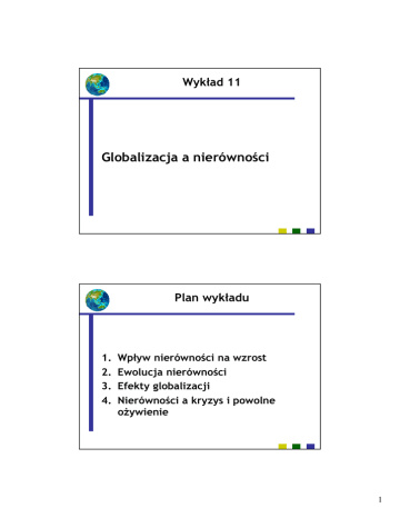 Wykład 11 Globalizacja a nierówności Plan wykładu 1. 2. 3. 4. Wpływ nierówności na wzrost Ewolucja nierówności Efekty globalizacji Nierówności a kryzys i powolne ożywienie 1 1. Wpływ nierówności na wzrost 1/7 Nierówności dochodowe oddziałują na wzrost kilkoma kanałami: Bogaci mają większą skłonność do oszczędzania, nierówności pozwalają na akumulację kapitału. Nierówności dochodowe umożliwiają inwestycje, gdy na rynku finansowym występują ograniczenia płynności. Nierówności zachęcają do wysiłku innowacyjnego i do inwestycji. 1. Wpływ nierówności na wzrost 2/7 W przypadku ograniczeń płynności biedni nie mogą inwestować w edukację. Zasób kapitału ludzkiego maleje. Władza polityczna może być rozdzielona w sposób bardziej egalitarny niż dochód i kontrola nad zasobami. Władza polityczna może być wykorzystana do redystrybucji za pośrednictwem podatków wprowadzających zakłócenia. Nierówności mogą prowadzić do niestabilności politycznej i zwiększyć niepewność gospodarowania. 2 1. Wpływ nierówności na wzrost 3/7 Nierówności wpływają na kompozycję zagregowanego popytu: Ludzie bogaci zgłaszają popyt na dobra luksusowe, których produkcja nie generuje wzrostu produktywności Ludzie biedni zgłaszają popyt na dobra produkowane masowo, których produkcja charakteryzuje się rosnącymi korzyściami skali Duża klasa średnia umożliwi wykorzystanie efektów aglomeracji – gospodarka dokonuje „wielkiego skoku”. 1. Wpływ nierówności na wzrost 4/7 Nierówności a wzrost – wyniki empiryczne Szybki wzrost obserwowany był w latach 19451973, kiedy malała nierówność w krajach uprzemysłowionych i niektórych rozwiniętych. W ostatnich trzech dekadach nierówności rosną, osiągając poziom nieobserwowany od lat 20 XX w. Jest to okres wolniejszego wzrostu, który zakończył się kryzysem 2008 (pogoń za zyskiem najbogatszych, wysoki poziom zadłużenia najbiedniejszych). 3 1. Wpływ nierówności na wzrost 5/7 Nierówności a wzrost – wyniki empiryczne c.d. Ujemny związek między wzrostem a nierównościami został potwierdzony. Nie wszystkie kanały wydają się jednakowo ważne. Zależność między nierównością a wzrostem nie jest silniejsza w demokracjach. Nierówność oddziałuje przez polityczną niestabilność, niższe inwestycje w edukację i decyzje dotyczące liczby dzieci. Nierówność nie oddziałuje na wzrost przez redystrybucję dochodu. 1. Wpływ nierówności na wzrost 6/7 Równość zwiększa prawdopodobieństwo wydłużenia okresu szybkiego wzrostu (wysokość słupka pokazuje wydłużenie okresu szybkiego wzrostu (w%) w wyniku wzrostu wartości zmiennej z 50 do 60 centyla) 4 1. Wpływ nierówności na wzrost 7/7 UWAGA: wzrost oddziałuje też na nierówności Wpływ wzrostu gospodarczego (rozwoju) na nierówności jest nieliniowy. Krzywa Kuznetsa ma kształt . W początkowym stadium industrializacji i urbanizacji nierówności rosną z migracjami pracowników do miast do pracy w sektorach o wysokiej produktywności. Mechanizacja rolnictwa i migracje powodują wzrost produktywności rolnictwa i spadek nierówności. 2. Ewolucja nierówności 1/11 Istnieją dwie główne miary podziału dochodu: Podział funkcjonalny: podział dochodu między czynniki produkcji Podział indywidualny: podział dochodu między gospodarstwa domowe i ich członków, niezależnie od źródeł dochodu. Podział funkcjonalny wpływa na podział indywidualny, bo własność kapitału jest skoncentrowana i wzrost udziału w dochodzie tego czynnika zwiększa nierówności (ale trzeba uwzględnić zyski niepodzielone i inne źródła dochodów). 5 2. Ewolucja nierówności 2/11 Funkcjonalny podziału dochodu: udział płac w PKB 2. Ewolucja nierówności 3/11 Od lat 1980 udział płac w dochodzie maleje w wielu krajach rozwiniętych i wschodzących W krajach rozwiniętych wynikało to z polityki podtrzymywania konkurencyjności (Niemcy) oraz rosnącej dominacji sektora finansowego. W krajach transformacji udział płac malał w wyniku restrukturyzacji. W krajach wschodzących udział wahał się w wyniku zmian poziomu zatrudnienia i siły przetargowej pracowników (recesje, inflacja, zmiany polityczne). 6 2. Ewolucja nierówności 4/11 Udział płac w dochodzie krajach rozwiniętych 2. Ewolucja nierówności 5/11 Udział płac w dochodzie krajach wschodzących 7 2. Ewolucja nierówności 6/11 Podział indywidualny dochodu: do 1980 nierówności maleją (wcześniej rosły, co jest zgodne z hipotezą Kuznetzsa). W krajach rozwijających się obserwujemy większe zróżnicowanie. Nierówności malały z przyczyn politycznych (lewicowe rządy ARG i BRA w 1950, CHL 1970 i PER w 1985) lub parcelacji gruntów (Korea, Tajwan) Na rosnące nierówności od 1980 złożyły się: malejący udział pracy w dochodzie oraz rosnące nierówności w wysokości płac. 2. Ewolucja nierówności 7/11 Gini 8 2. Ewolucja nierówności 8/11 Współczynnik Giniego (pomarańczowy – dochód po opodatkowaniu) 2. Ewolucja nierówności 9/11 Współczynnik Giniego (pomarańczowy – dochód po opodatkowaniu) 9 2. Ewolucja nierówności 10/11 Współczynnik Giniego (pomarańczowy – dochód po opodatkowaniu) 2. Ewolucja nierówności 11/11 Współczynnik Giniego w krajach OECD obecnie 10 3. Efekty globalizacji 1/6 Globalizacja i zmiany technologiczne są powiązane i łącznie wpłynęły na nierówności dochodowe. Zgodnie ze standardową teorią handlu, otwarcie gospodarki faworyzuje czynniki, w które kraj jest relatywnie zasobny. W krajach rozwiniętych stwierdzono jednak, że (a) zmiana cen dóbr i czynników produkcji nastąpiła wewnątrz sektorów, nie zaś między nimi; (b) „skill premium” wystąpiło się także w krajach rozwijających się, musiało więc wynikać z postępu technicznego. 3. Efekty globalizacji 2/6 W krajach rozwiniętych, handel i zmiany technologiczne doprowadziły do polaryzacji: spadku popytu na pr
