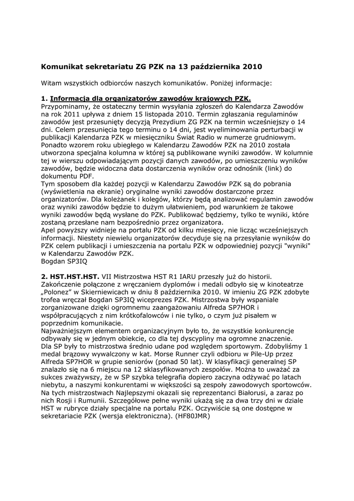 Komunikat sekretariatu ZG PZK na 13 pa dziernika 2010