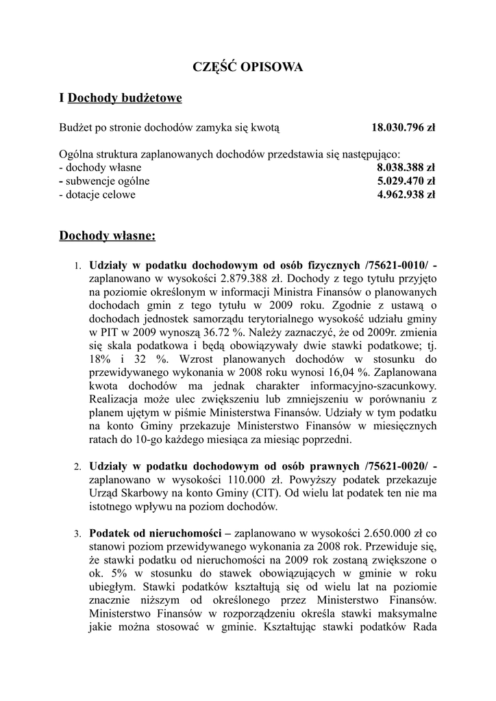 CZĘŚĆ OPISOWA I Dochody budżetowe Budżet po stronie dochodów zamyka się kwotą 18.030.796 zł Ogólna struktura zaplanowanych dochodów przedstawia się następująco: - dochody własne 8.038.388 zł - subwencje ogólne 5.029.470 zł - dotacje celowe 4.962.938 zł Dochody własne: 1. Udziały w podatku dochodowym od osób fizycznych /75621-0010/ - zaplanowano w wysokości 2.879.388 zł. Dochody z tego tytułu przyjęto na poziomie określonym w informacji Ministra Finansów o planowanych dochodach gmin z tego tytułu w 2009 roku. Zgodnie z ustawą o dochodach jednostek samorządu terytorialnego wysokość udziału gminy w PIT w 2009 wynoszą 36.72 %. Należy zaznaczyć, że od 2009r. zmienia się skala podatkowa i będą obowiązywały dwie stawki podatkowe; tj. 18% i 32 %. Wzrost planowanych dochodów w stosunku do przewidywanego wykonania w 2008 roku wynosi 16,04 %. Zaplanowana kwota dochodów ma jednak charakter informacyjno-szacunkowy. Realizacja może ulec zwiększeniu lub zmniejszeniu w porównaniu z planem ujętym w piśmie Ministerstwa Finansów. Udziały w tym podatku na konto Gminy przekazuje Ministerstwo Finansów w miesięcznych ratach do 10-go każdego miesiąca za miesiąc poprzedni. 2. Udziały w podatku dochodowym od osób prawnych /75621-0020/ - zaplanowano w wysokości 110.000 zł. Powyższy podatek przekazuje Urząd Skarbowy na konto Gminy (CIT). Od wielu lat podatek ten nie ma istotnego wpływu na poziom dochodów. 3. Podatek od nieruchomości – zaplanowano w wysokości 2.650.000 zł co stanowi poziom przewidywanego wykonania za 2008 rok. Przewiduje się, że stawki podatku od nieruchomości na 2009 rok zostaną zwiększone o ok. 5% w stosunku do stawek obowiązujących w gminie w roku ubiegłym. Stawki podatków kształtują się od wielu lat na poziomie znacznie niższym od określonego przez Ministerstwo Finansów. Ministerstwo Finansów w rozporządzeniu określa stawki maksymalne jakie można stosować w gminie. Kształtując stawki podatków Rada -2- Miejska bierze pod uwagę sytuację gospodarczą podmiotów i osób fizycznych działających i zamieszkujących na terenie gminy. Taki poziom obowiązujących stawek podatków ma negatywny wpływ na niższy poziom subwencji wyrównawczej jaką otrzymuje gmina z Ministerstwa Finansów. 4. Podatek rolny – zaplanowano na 2008 rok w kwocie 210.000 zł. Zakłada się, ze Rada Miejska obniży średnią cenę skupu żyta za okres trzech kwartałów 2007 roku z kwoty 55,80 zł za kwintal do kwoty 35,00 za kwintal. Wzrost dochodów w 2009 roku w stosunku do wykonania 2008 będzie związany ze spłatą zaległości w tym podatku. Rolnikom w roku 2008 była udzielana pomoc z budżetu państwa w postaci zwrotu części podatku akcyjnego zawartego w zakupionym paliwie rolniczym. Wypłaty dokonywał Urząd Miasta na wniosek zainteresowanych rolników. 5. Podatek leśny – zaplanowano w wysokości 40.000 zł. Głównym płatnikiem tego podatku jest Nadleśnictwo Świdnica, które posiada na terenie naszej gminy lasy o powierzchni około 2.400 ha i są to lasy ochronne. Zgodnie z obowiązującymi przepisami podstawa naliczania podatku jest cena 1m 3 drewna ogłoszonego przez GUS za 9 m-cy 2008 roku i wynosi 152,53 zł. W podatku leśnym gmina przyjęła maksymalną cenę drewna do obliczenia podatku na 2009 rok. 6. Podatek od środków transportu – zaplanowano w wysokości 70.000 zł. Zakłada się, że rada Miejska uchwali stawki tego podatku na poziomie 2008 roku. Dochody z tego podatku będą się kształtowały na poziomie przewidywanego wykonania za rok ubiegły. 7. Podatek dochodowy od osób fizycznych opłacony w formie karty podatkowej – zaplanowano w wysokości 20.000 zł. Podatek ten pobiera Urząd Skarbowy i przekazuje dochody na rachunek gminy. Powyższa forma opodatkowania dotyczy tylko małych przedsiębiorstw. Planowane dochody ustalono na podstawie informacji z Urzędu Skarbowego. 8. Podatek od spadków i darowizn – zaplanowano w wysokości 30.000 zł. Podatek pobiera Urząd Skarbowy i przekazuje na konto gminy. Wysokość dochodów jest zależna od zaistniałych zdarzeń. 9. Podatek od czynności cywilnoprawnych – plan 270.000 zł. Podatek pobiera Urząd Skarbowy i przekazuje na konto gminy. Poziom dochodów ustalano na podstawie uzyskanych informacji z Urzędu Skarbowego. -310. Wpływy z opłaty skarbowej – zaplanowano w wysokości 45.000 zł. Opłatę skarbową pobiera Gmina od podań i zaświadczeń w formie gotówkowej lub zapłaty na konto gminy. 11. Wpływy z opłaty targowej – plan 10.000 zł. Plan ustalono na podstawie przewidywanego wykonania za 2008 rok. Przewiduje się, że stawki opłaty targowej pozostaną na poziomie z roku 2008. 12. Dochody z majątku gminy – zaplanowano w wysokości 1.400.000 zł w tym: - wpływy z opłat za zarząd i wieczyste użytkowanie 16.000 zł - dochody z najmu i dzierżawy składników majątku 20.000 zł - wpływy z tytułu przekształcenia prawa wieczystego użytkowania 10.000 zł - wpływy z tytułu sprzedaży majątku gminy 1.354.000 zł 13. Pozostałe dochody – zaplanowano w wysokości 304.000 zł. Pozostałe dochody obejmują: - wpływy z opłat za zezwolenia na sprzedaż napojów alkoholowych - odpłatność ośrodka Pomocy Społecznej za usługi opiekuńcze - sprzedaż biletów na basen otwarty - sprzedaż biletów na wieżę na Wielkiej Sowie - część wpływów ze świadczeń alimentacyjnych - prowizja za wydanie dowodów osobistych - opłaty za zajęcie pasa jezdni - odsetki od lokat terminowych - odsetki od zaległości podatkowych - inne opłaty (działalności gospodarcze, pozwolenia, koncesje itp.) 90.000 zł 18.000 zł 13.000 zł 80.000 zł 6.000 zł 2.000 zł 10.000 zł 35.000 zł 30.000 zł 20.000 zł Subwencja ogólna: Planowana subwencja ogólna na 2009 rok wynosi 5.029.470 zł co stanowi 30,0 % dochodów budżetu Gminy Pieszyce na 2009 rok. 1. Subwencja wyrównawcza – na 2009 rok wynosi 2.853.947 zł. Subwencję otrzymuj