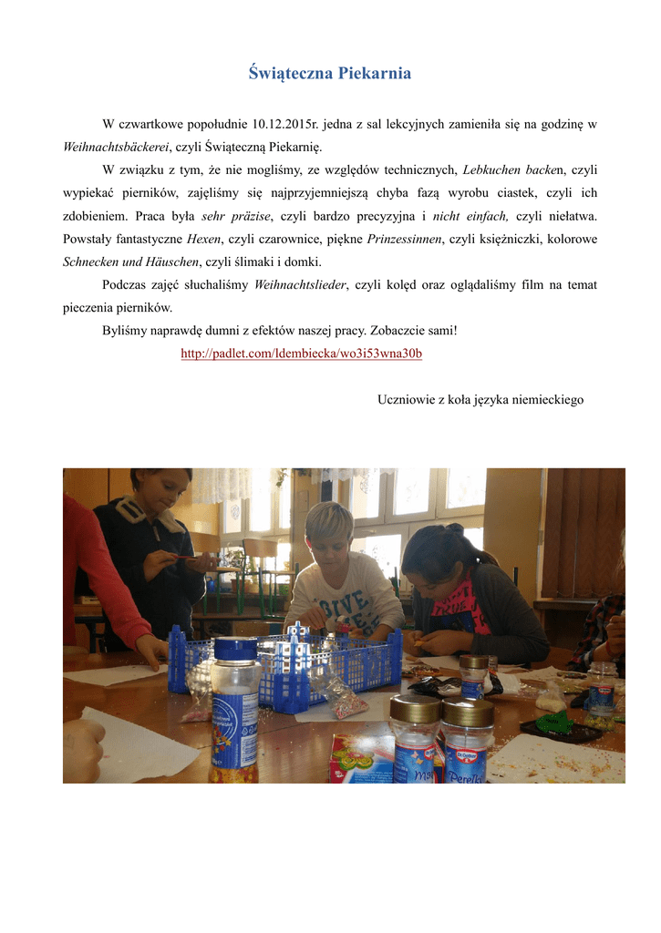 Świąteczna Piekarnia W czwartkowe popołudnie 10.12.2015r. jedna z sal lekcyjnych zamieniła się na godzinę w Weihnachtsbäckerei, czyli Świąteczną Piekarnię. W związku z tym, że nie mogliśmy, ze względów technicznych, Lebkuchen backen, czyli wypiekać pierników, zajęliśmy się najprzyjemniejszą chyba fazą wyrobu ciastek, czyli ich zdobieniem. Praca była sehr präzise, czyli bardzo precyzyjna i nicht einfach, czyli niełatwa. Powstały fantastyczne Hexen, czyli czarownice, piękne Prinzessinnen, czyli księżniczki, kolorowe Schnecken und Häuschen, czyli ślimaki i domki. Podczas zajęć słuchaliśmy Weihnachtslieder, czyli kolęd oraz oglądaliśmy film na temat pieczenia pierników. Byliśmy naprawdę dumni z efektów naszej pracy. Zobaczcie sami! http://padlet.com/ldembiecka/wo3i53wna30b Uczniowie z koła języka niemieckiego