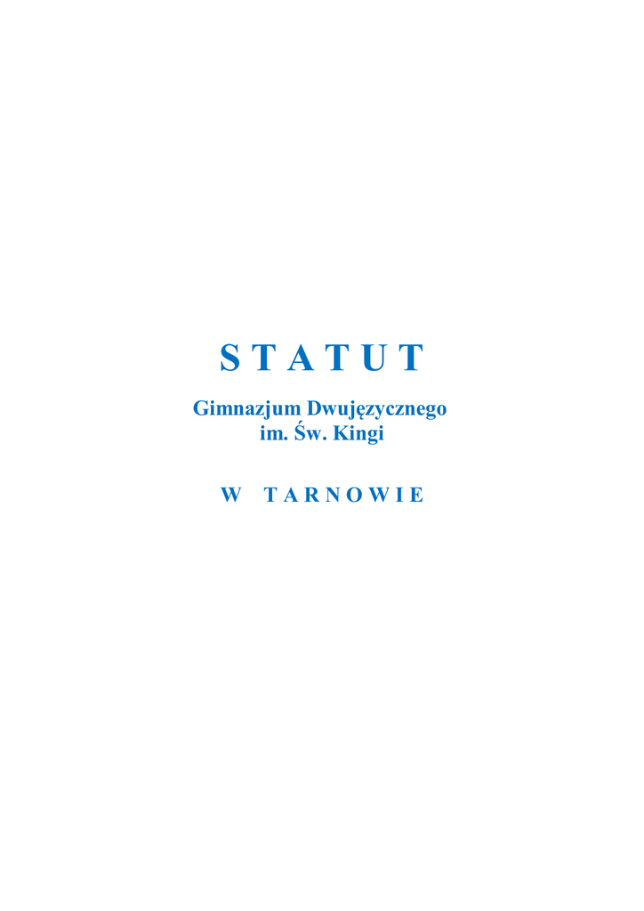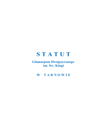 STATUT Gimnazjum Dwujęzycznego im. Św. Kingi W TARNOWIE - Statut Gimnazjum Dwujęzycznego w Tarnowie – I. INFORMACJE OGÓLNE §1 1. Określa się pełną nazwę Gimnazjum Dwujęzyczne w brzmieniu: Zespół Szkół Ogólnokształcących nr 2 w Tarnowie – Gimnazjum Dwujęzyczne im. Św. Kingi, zwane dalej „Gimnazjum” 2. Nazwa Gimnazjum jest używana w pełnym brzmieniu. Na pieczęciach może być używany skrót nazwy. 3. Gimnazjum jest szkołą publiczną. 4. Gimnazjum mieści się przy ulicy Mickiewicza 16 w Tarnowie. §2 1. Gimnazjum nadaje imię organ prowadzący na wniosek Rady Zespołu Szkół Ogólnokształcących Nr 2 lub wspólny wniosek Rady Pedagogicznej, Rady Rodziców i Samorządu Uczniowskiego. 2. Zmiany imienia dokonuje się w tym samym trybie. II. PODSTAWOWE INFORMACJE O GIMNAZJUM §3 Organem prowadzącym Gimnazjum jest Gmina Miasta Tarnowa. Nadzór pedagogiczny sprawuje Małopolski Kurator Oświaty. Cykl kształcenia w Gimnazjum trwa 3 lata. Czas rozpoczynania i kończenia zajęć dydaktycznych oraz przerw i ferii określa Minister Edukacji Narodowej i Sportu w drodze rozporządzenia w sprawie organizacji roku szkolnego. 5. Dopuszcza się prowadzenie innowacji pedagogicznych w klasach Gimnazjum np. prowadzenie zajęć według własnych wewnątrzszkolnych programów autorskich zatwierdzonych przez Radę Pedagogiczną. 1. 2. 3. 4. III. CELE I ZADANIA GIMNAZJUM §4 Cele i zadania Gimnazjum są określone w statucie Zespołu. IV. ORGANY GIMNAZJUM 2 - Statut Gimnazjum Dwujęzycznego w Tarnowie – §5 1. Zgodnie ze Statutem Zespołu organami Gimnazjum są: 1) Dyrektor Zespołu; 2) Wicedyrektorzy; 3) Koordynator MYP-u; 4) Rada Pedagogiczna Zespołu; 5) Samorząd uczniowski Gimnazjum. V. KOMPETENCJE ORGANÓW GIMNAZJUM §6 Szczegółowe kompetencje Dyrektora, Rady Pedagogicznej, Rady Rodziców, Wicedyrektora oraz Samorządu Uczniowskiego określa Statut Zespołu. VI. ORGANIZACJA GIMNAZJUM §7 Podstawową jednostką organizacyjną Zespołu jest oddział. Liczba uczniów w oddziale gimnazjum nie powinna być większa niż 28. Nie tworzy się nowego oddziału tej samej klasy, jeśli liczba uczniów jest mniejsza od 24. Podział uczniów na grupy jest uzależniony od możliwości finansowych Zespołu, liczebności oddziału oraz wielkości sal i pomieszczeń dydaktycznych i dokonywany jest na zajęciach wymagających specjalnych warunków nauki i bezpieczeństwa z uwzględnieniem zasad BHP. 5. Nauczanie języków obcych w gimnazjum może być organizowane w grupach z uwzględnieniem poziomu umiejętności językowych uczniów. 6. W gimnazjum przedmioty: matematyka, fizyka, biologia i geografia prowadzone są w dwóch językach tj. w języku polskim i języku angielskim. 1. 2. 3. 4. §8 Organizacje stałych, obowiązkowych i nadobowiązkowych zajęć dydaktycznych i wychowawczych określa tygodniowy rozkład zajęć ustalony przez wicedyrektora na podstawie arkusza organizacyjnego dla każdej ze szkół, z uwzględnieniem zasad ochrony zdrowia i higieny pracy uczniów i nauczycieli. §8A Klasa z programem Middle Years Programme (MYP) 1. Klasa MYP wchodzi w skład Gimnazjum Dwujęzycznego. MIDDLE YEARS PROGRAMME program 4-letni obejmujący 3 lata gimnazjum oraz pierwszą klasę liceum. W klasie MYP realizowany jest narodowy program nauczania, a uczniowie po ukończeniu trzech lat gimnazjum zdają polski egzamin gimnazjalny. MYP zapewnia ciągłość przygotowania do Matury Międzynarodowej – Diploma Programme oraz wszystkich klas polskiego liceum. 2. W szkole zostało utworzone stanowisko koordynatora Middle Years Programme (MYP), który: 1) realizuje zadania związanych z programem Middle Years Programme zgodnie z zaleceniami organizacji IB; 2) nadzoruje dokumentację prowadzoną przez nauczycieli; 3) koordynuje rekrutację do klasy MYP; 4) typuje nauczycieli na szkolenia IB; 5) pełni dyżury jako koordynator MYP; 6) prowadzi cotygodniowe spotkania nauczycieli (collaborative meetings); 7) sprawuje opiekę nad klasą MYP- gimnazjum; 8) prowadzi dokumentację zgodnie z zaleceniami IB; 9) kontroluje realizację programów zajęć edukacyjnych podlegających jego nadzorowi; 10) bierze udział w konferencjach dla koordynatorów MYP; 11) koordynuje działania promocyjne klasy MYP; 12) umożliwia dostęp do podręczników, materiałów i pomocy naukowych wymaganych programem MYP; 13) nadzoruje i rozlicza godziny zrealizowane przez nauczycieli; 14) utrzymuje stały kontakt z przedstawicielami IB; 15) przedstawia Dyrektorowi Szkoły sprawozdania ze sprawowanego przez siebie nadzoru; 16) organizuje i prowadzi spotkania z rodzicami kandydatów do klasy MYP; 17) zapoznaje uczniów i rodziców z wymaganiami i warunkami realizacji programu MYP. 3. Nauka w klasie z programem MYP to nauka według jednolitych, międzynarodowych standardów nauczania, obowiązujących we wszystkich szkołach IB na świecie. MYP to aktywne metody nauczania, rozwój umiejętności uczniów z zakresu strategii nauki. MYP wyposaża zarówno w wiedzę jak i umiejętności niezbędne do funkcjonowania w dzisiejszym dynamicznym i zmieniającym się świecie. 4. Filozofia MYP to: 1) nauczanie holistyczne, które dotyczy całej osoby. Rozwój poznawczy/naukowy musi iść w parze ze społecznym, emocjonalnym i fizycznym. IB zachęca uczniów do stawania się aktywnymi, wrażliwymi oraz opiekuńczymi członkami społeczności lokalnych, krajowych i globalnych, uczącymi się przez całe życie; 2) świadomość międzykulturowa - uczy szacunku i poszanowania dla tradycji i kultury ojczystej oraz szacunku i otwartości na zrozumienie innych kultur; program promuje otwartą komunikację opartą na zrozumieniu i szacunku, która pomaga uczniom kształtować świadomość międzynarodową i która wspiera efektywną pracę zespołową i współpracę; 3) komunikacja - wspiera dialog między ludźmi, jest sposobem na okazywanie empatii i życzliwości wobec każdego człowieka bez względu na ich status; 4) rozwój ucznió