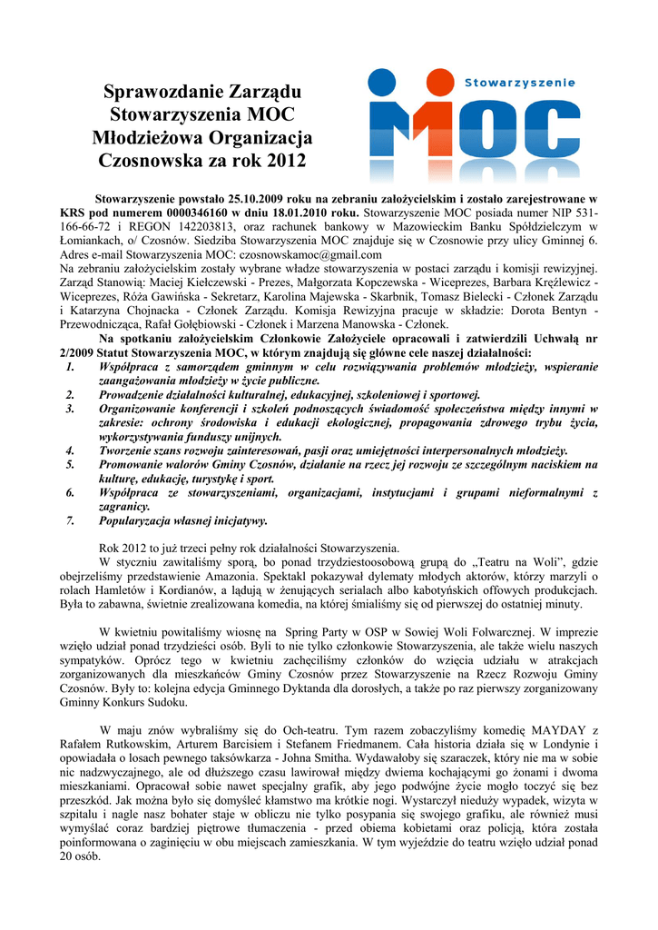 Sprawozdanie z działalności Stowarzyszenia MOC za 2012 rok