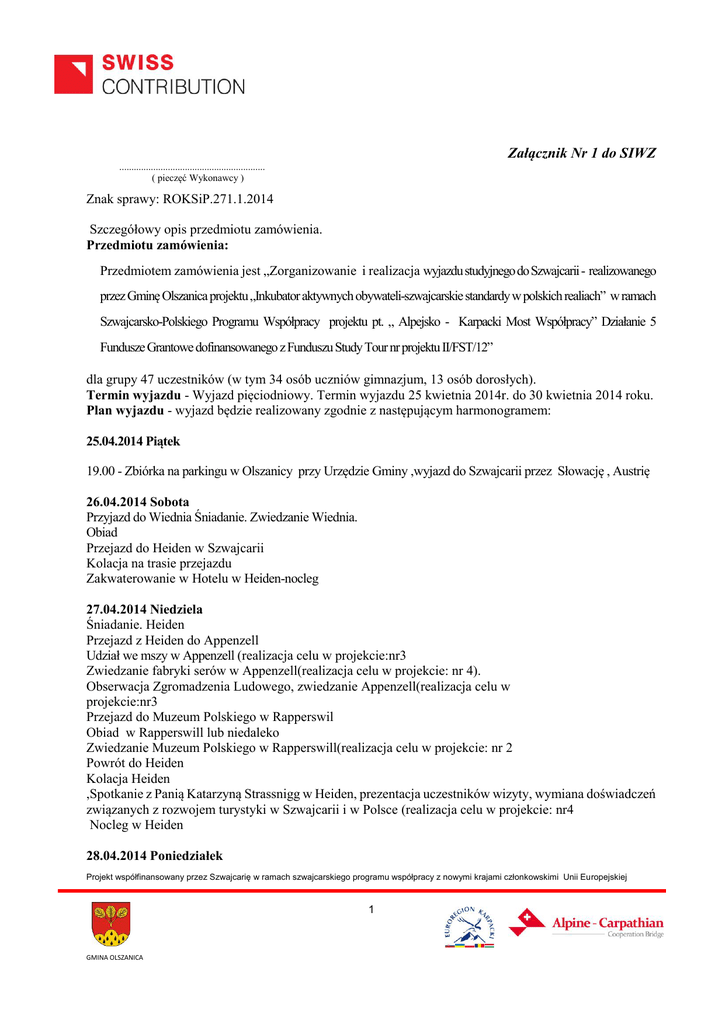 Załącznik Nr 1 do SIWZ ............................................................ ( pieczęć Wykonawcy ) Znak sprawy: ROKSiP.271.1.2014 Szczegółowy opis przedmiotu zamówienia. Przedmiotu zamówienia: Przedmiotem zamówienia jest „Zorganizowanie i realizacja wyjazdu studyjnego do Szwajcarii - realizowanego przez Gminę Olszanica projektu „Inkubator aktywnych obywateli-szwajcarskie standardy w polskich realiach” w ramach Szwajcarsko-Polskiego Programu Współpracy projektu pt. „ Alpejsko - Karpacki Most Współpracy” Działanie 5 Fundusze Grantowe dofinansowanego z Funduszu Study Tour nr projektu II/FST/12” dla grupy 47 uczestników (w tym 34 osób uczniów gimnazjum, 13 osób dorosłych). Termin wyjazdu - Wyjazd pięciodniowy. Termin wyjazdu 25 kwietnia 2014r. do 30 kwietnia 2014 roku. Plan wyjazdu - wyjazd będzie realizowany zgodnie z następującym harmonogramem: 25.04.2014 Piątek 19.00 - Zbiórka na parkingu w Olszanicy przy Urzędzie Gminy ,wyjazd do Szwajcarii przez Słowację , Austrię 26.04.2014 Sobota Przyjazd do Wiednia Śniadanie. Zwiedzanie Wiednia. Obiad Przejazd do Heiden w Szwajcarii Kolacja na trasie przejazdu Zakwaterowanie w Hotelu w Heiden-nocleg 27.04.2014 Niedziela Śniadanie. Heiden Przejazd z Heiden do Appenzell Udział we mszy w Appenzell (realizacja celu w projekcie:nr3 Zwiedzanie fabryki serów w Appenzell(realizacja celu w projekcie: nr 4). Obserwacja Zgromadzenia Ludowego, zwiedzanie Appenzell(realizacja celu w projekcie:nr3 Przejazd do Muzeum Polskiego w Rapperswil Obiad w Rapperswill lub niedaleko Zwiedzanie Muzeum Polskiego w Rapperswill(realizacja celu w projekcie: nr 2 Powrót do Heiden Kolacja Heiden ,Spotkanie z Panią Katarzyną Strassnigg w Heiden, prezentacja uczestników wizyty, wymiana doświadczeń związanych z rozwojem turystyki w Szwajcarii i w Polsce (realizacja celu w projekcie: nr4 Nocleg w Heiden 28.04.2014 Poniedziałek Projekt współfinansowany przez Szwajcarię w ramach szwajcarskiego programu współpracy z nowymi krajami członkowskimi Unii Europejskiej 1 GMINA OLSZANICA Śniadanie - Heiden Heiden - Spotkanie z burmistrzem, urząd gminy itp (realizacja celu w projekcie: nr 1 i 2 Wizyta w szkole -spotkanie z rówieśnikami, (realizacja celu w projekcie: nr 1 i 2 Obiad -Heiden Appenzel- zwiedzanie Appenzel w tym Warsztatu Wyrobu Mosiężnych Pasów - (realizacja celu w projekcie: nr 4). Przejazd do Zürich-u Zwiedzanie fabryki czekolady w Zürich(realizacja celu w projekcie nr 2 i 4) Zwiedzanie Zürich-u Przejazd z Zürich-u do Heiden Kolacja. Nocleg Heiden 29.04.2014 wtorek Śniadanie -Heiden Wyjazd do Pragi Obiad Pilzno czeskie Zwiedzanie Pragi Kolacja , nocleg Praga 30.04.2013 środa Śniadanie Przejazd do Olszanicy Obiad w drodze w Polsce Kolacja w drodze w Polsce Przyjazd do Olszanicy Zamawiający zastrzega sobie prawo zmiany kolejności odwiedzanych miejsc. Wyżywienie -śniadania, obiady i kolacje Zakwaterowanie uczestników: - lokalizacja hotelu w Szwajcarii w Heiden , pokoje z łazienkami 1 i 2 osobowe w standardzie europejskim, wyposażone w tv, pościel, ręczniki - w całym okresie pobytu (4 noclegi – 3 w Szwajcarii, 1 w Czechach-Praga) pokoje z łazienkami 1 i 2 osobowe w standardzie europejskim, wyposażone w tv, pościel, ręczniki - liczba pokoi jednoosobowych powinna wynosić co najmniej 2, - pokoje dwuosobowe z oddzielnymi łóżkami; - wyposażenie i standard obiektu powinien zapewniać uczestnikom dobre warunki pobytu. Środek transportu - Wykonawca zapewni transport 50 osób (w tym tłumacz i 2 kierowców) z Olszanicy do Szwajcarii (przez Słowację ,Austrię), oraz na miejscu do wszystkich odwiedzanych miejsc Projekt współfinansowany przez Szwajcarię w ramach szwajcarskiego programu współpracy z nowymi krajami członkowskimi Unii Europejskiej 2 GMINA OLSZANICA Wykonawca zapewni transfer osób: - Z Olszanicy do Szwajcarii (Heiden) przez Słowację i Austrię, - Z Szwajcarii (Heiden) do Olszanicy przez Czechy - Transfer osób po terytorium Szwajcarii w ramach realizowanego programu. Transfer powinien odbywać się autokarem min. klasy LUX. Pojazd powinien być wyposażony w co najmniej komfortowe fotele uchylno - rozsuwane z podłokietnikiem na montażu szynowym, pasy bezpieczeństwa, klimatyzację, ogrzewanie, półki na bagaż podręczny; indywidualne nawiewy i oświetlenia, nagłośnienie, oświetlenie sufitowe dzienne i nocne oraz wyodrębnione miejsce na bagaż o poj. min. 1.5 m3, WC oraz urządzenie GPS. Pojazd ma być sprawny technicznie oraz posiadać miejsca siedzące dla wszystkich uczestników wyjazdu. Wykonawca podstawia pojazd w stanie czystym, zarówno na zewnątrz jak i wewnątrz oraz zobowiązuje się do dbania o czystość autokaru podczas podróży. Na wyraźną prośbę przedstawiciela uczestników wyjazdu kierujący pojazdem ma uruchamiać klimatyzację lub ogrzewanie w celu zapewnienia komfortowych warunków podróży. W przypadku awarii technicznej pojazdu w trakcie realizacji zamówienia, Wykonawca zobowiązany jest zapewnić zastępczy środek transportu o takich samych lub lepszych parametrach, zgodnych ze specyfikacją istotnych warunków zamówienia, który pozwoli na planowe kontynuowanie programu wizyty. Wykonawca pokrywa koszty opłat drogowych i parkingowych oraz koszty uzyskania wszelkich innych pozwoleń niezbędnych do prawidłowego wykonania zadania. Wykonawca zapewni transport na miejscu w celu dojazdu do wszelkich obiektów odwiedzanych przez uczestników. Sporządzając ofertę należy przyjąć, że w/w pojazdem zostanie pokonana trasa o długości do 3300,00 km. Tłumaczenia - w trakcie wyjazdu grupie będzie towarzyszył biegły tłumacz konferencyjno/konsekutywny z języka niemieckiego, zapewniony przez Wykonawcę. Tłumacza zabezpieczy Wykonawca. Tłumacz odpowiedzialny będzie za przeprowadzenie tłumaczeń ustnych (konsekutywnych) z języka niemieckiego na język polski (i odwrotnie) również w trakcie realizacji wizyt i spotkań na terenie odw