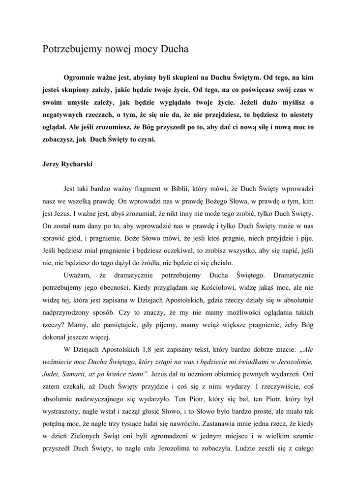 Potrzebujemy nowej mocy Ducha Ogromnie ważne jest, abyśmy byli skupieni na Duchu Świętym. Od tego, na kim jesteś skupiony zależy, jakie będzie twoje życie. Od tego, na co poświęcasz swój czas w swoim umyśle zależy, jak będzie wyglądało twoje życie. Jeżeli dużo myślisz o negatywnych rzeczach, o tym, że się nie da, że nie przejdziesz, to będziesz to niestety oglądał. Ale jeśli zrozumiesz, że Bóg przyszedł po to, aby dać ci nową siłę i nową moc to zobaczysz, jak Duch Święty to czyni. Jerzy Rycharski Jest taki bardzo ważny fragment w Biblii, który mówi, że Duch Święty wprowadzi nasz we wszelką prawdę. On wprowadzi nas w prawdę Bożego Słowa, w prawdę o tym, kim jest Jezus. I ważne jest, abyś zrozumiał, że nikt inny nie może tego zrobić, tylko Duch Święty. On został nam dany po to, aby wprowadzić nas w prawdę i tylko Duch Święty może w nas sprawić głód, i pragnienie. Boże Słowo mówi, że jeśli ktoś pragnie, niech przyjdzie i pije. Jeśli będziesz miał pragnienie i będziesz oczekiwał, to zrobisz wszystko, aby się napić, jeśli nie, nie będziesz do tego dążył do źródła, nie będzie ci się chciało. Uważam, że dramatycznie potrzebujemy Ducha Świętego. Dramatycznie potrzebujemy jego obecności. Kiedy przyglądam się Kościołowi, widzę jakąś moc, ale nie widzę tej, która jest zapisana w Dziejach Apostolskich, gdzie rzeczy działy się w absolutnie nadprzyrodzony sposób. Czy to znaczy, że my nie mamy możliwości oglądania takich rzeczy? Mamy, ale pamiętajcie, gdy pijemy, mamy wciąż większe pragnienie, żeby Bóg dokonał jeszcze więcej. W Dziejach Apostolskich 1,8 jest zapisany tekst, który bardzo dobrze znacie: „Ale weźmiecie moc Ducha Świętego, który zstąpi na was i będziecie mi świadkami w Jerozolimie, Judei, Samarii, aż po krańce ziemi”. Jezus dał tu uczniom obietnicę pewnych wydarzeń. Oni zatem czekali, aż Duch Święty przyjdzie i coś się z nimi wydarzy. I rzeczywiście, coś absolutnie nadzwyczajnego się wydarzyło. Ten Piotr, który się bał, ten Piotr, który był wystraszony, nagle wstał i zaczął głosić Słowo, i to Słowo było bardzo proste, ale miało tak potężną moc, że nagle trzy tysiące ludzi się nawróciło. Zastanawia mnie jedna rzecz, że kiedy w dzień Zielonych Świąt oni byli zgromadzeni w jednym miejscu i w wielkim szumie przyszedł Duch Święty, to nagle cała Jerozolima to zobaczyła. Ludzie zeszli się z całego miasta. Manifestacja Ducha Świętego była tak potężna, że aż całe miasto zostało poruszone. Jerozolima położona jest na górach, widziałem, jak to wygląda i wierzcie mi, że to niemożliwe, aby całe miasto normalnie rzecz biorąc to widziało. Było to możliwe tylko dlatego, że Duch święty tak potężnie zadziałał. To było nadnaturalne przyjście Boga na ziemię, nadnaturalna inwazja Ducha Bożego na ziemię. I moje serce płonie, bo chce oglądać nadnaturalną inwazję Boga na to miasto, na ten naród, i na ten kraj, aby działy się rzeczy tak potężne, żeby wyszły spod kontroli człowieka, a człowiek został przyobleczony taką mocą z wysokości, że dokonywałby niezwykłych rzeczy. I chciałbym, aby w moim i twoim sercu powstało tak gorące pragnienie, żebyśmy zaczęli naprawdę szukać obecności Ducha Świętego, aby On zstąpił do naszego życia z większą mocą niż kiedykolwiek wcześniej. Wierzę, że wciąż potrzebujemy napełniania się Nim. Zostaliśmy ochrzczeni Duchem Świętym, mówimy językami, wiele razy byliśmy Nim napełniani, ale wiecie, czego nie widzę? Nie widzę tej manifestacji mocy, o jakiej czytam w Dziejach Apostolskich. Dlatego oczekuję właśnie na takie przyjście Ducha Świętego. Chcę być w miejscu, gdzie taka moc się zamanifestuje, że ludzie będą tłumami się nawracać, że będą oddawać swoje życie Bogu. To nie znaczy, że mamy czekać na ten moment i nie głosić. Także teraz mamy pracować, także teraz mamy mówić o Jezusie. Ten fragment mówi też, że apostołowie mieli wziąć moc Ducha Świętego, który zstąpi na nich i być Mu świadkami. Znaczy to, że wcześniej nimi nie byli. Znaczy to też, że wcześniej nikt nie zainteresował się tą grupą ok. 120 osób, bo tak naprawdę niczego jeszcze nie zrobili, nic nie mogli. Zanim nie zstąpił Duch Święty byli tylko grupką, która została z wielkiej rzeszy. Grupką wierzącą w Jezusa, oglądającą go zmartwychwstałego, ale grupką ludzi bez żadnej mocy. Tyle, że oni postanowili zostać i oczekiwać, co będzie dalej. Zostało ich 120 z około 1000 ludzi i mieli wielką determinację, aby być razem i czekać na Ducha Świętego. Postanowili razem trwać, jak napisano - WSZYSCY, nie niektórzy, ale WSZYSCY. Przestudiujcie sobie w Słowie Bożym, że kiedykolwiek są WSZYSCY, dzieją się niezwykłe rzeczy (Dz. Ap. 2,44; 5,12), ale gdy są NIEKTÓRZY, nie dzieje się nic. Oni wszyscy razem byli jednego serca, jednej myśli i wołali do Pana oczekując, że on przyjdzie. Dlaczego? Bo wierzyli w to, co Jezus im obiecał. Byli skupieni wokół słowa Jezusa i tylko wokół tego. Wiedzieli, że stanie się coś niezwykłego, że przyjdzie nowa moc, że zostaną ochrzczeni, zanurzeni całkowicie w Duchu Świętym. I tego potrzebujemy. Marzeniem każdego przywódcy jest to, aby kościół stawał do różnych wyzwań w całości, nie tylko częściowo, bo przywódcy wiedzą, że tylko wtedy może wydarzyć się coś wielkiego. Potrzebujemy być świadkami, a nie będziemy, jeśli nie zostaniemy zanurzeni w Duchu. Świadek to ten, który mówi, o tym, co widział, co przeżył i nie możesz nim być bez mocy Ducha Świętego. Często jako kościoły organizujemy ewangelizacje i bardzo dobrze, że to robimy, ale dlaczego często z tak małym skutkiem? Bo zapominamy o Duchu Świętym, bo w tym nie ma mocy, jaka była w dzień Zielonych Świąt. Zobaczcie, że Piotr nawet nie musiał wiele 