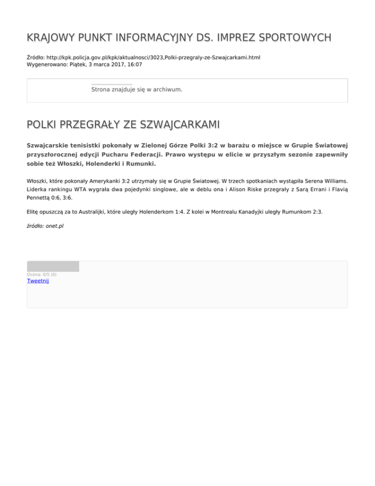 KRAJOWY PUNKT INFORMACYJNY DS. IMPREZ SPORTOWYCH Źródło: http://kpk.policja.gov.pl/kpk/aktualnosci/3023,Polki-przegraly-ze-Szwajcarkami.html Wygenerowano: Piątek, 3 marca 2017, 16:07 Strona znajduje się w archiwum. POLKI PRZEGRAŁY ZE SZWAJCARKAMI Szwajcarskie tenisistki pokonały w Zielonej Górze Polki 3:2 w barażu o miejsce w Grupie Światowej przyszłorocznej edycji Pucharu Federacji. Prawo występu w elicie w przyszłym sezonie zapewniły sobie też Włoszki, Holenderki i Rumunki. Włoszki, które pokonały Amerykanki 3:2 utrzymały się w Grupie Światowej. W trzech spotkaniach wystąpiła Serena Williams. Liderka rankingu WTA wygrała dwa pojedynki singlowe, ale w deblu ona i Alison Riske przegrały z Sarą Errani i Flavią Pennettą 0:6, 3:6. Elitę opuszczą za to Australijki, które uległy Holenderkom 1:4. Z kolei w Montrealu Kanadyjki uległy Rumunkom 2:3. źródło: onet.pl Ocena: 0/5 (0) Tweetnij