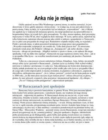 godło: Paul Anka Anka nie je mięsa Gdyby spojrzeć na nos Olka Wiadernego z prawej strony, to można zauważyć, że jest skrzywiony w lewo; gdyby spojrzeć z lewej strony – to wydaje się, że nos jest zakrzywiony w prawą stronę. Fakty są takie, że w przeszłości był on lokalnym „wojownikiem” – kto z Olkiem nie zgadzał się w większej lub mniejszej sprawie, ten mógł spodziewać się sprawiedliwości w bezpośredniej bójce; jej wynik był z góry przesądzony. To silny, mocno opalony, dość przystojny mężczyzna w wieku 48 lat, choć wygląda na dużo starszego. W życiu, oprócz picia, zajmował się tylko leśnictwem; natomiast obecnie pracuje jako rolnik w jednym z gospodarstw w Niemczech, acz co jakiś czas przyjeżdża do swego ojca. Rodzeństwo szeptało między sobą, że wyjechał z Polski z powodu stanu, w jakim pozostawił przepisane na niego przez ojca gospodarstwo. „Wszystko rozprzedał, rozpieprzył, nie zostało nic. Tylko dom jeszcze stoi”. Że otworzono niemiecki rynek pracy dla Polaków i dlatego on, „Europejczyk”, jak siebie określa, z tego korzysta – nikogo nie przekonuje. „Mógłbyś siedzieć z ojcem w domu, a nie opłacać dla niego opiekunkę. I tak się słabo nim zajmuje”, tłumaczyła mo jego najstarsza siostra Ania, choć – jak to w przypadku Olka bywa – na wszelkie moralizowanie jest zamknięty jak puszka z Pasztetem Podlaskim. Tylko on, a ma jeszcze czworo rodzeństwa (Juliusz, Klaudiusz, Ania, Julita), nie potrafił ułożyć sobie życia i pozostał w Buraczanach. „Zamiast życia czy kobiety Olek wybrał wódkę”, mówiono w rodzinie i powtarzano i w całej wsi. Taka deklaracja nie brzmi dość dramatycznie. Gdyby jednak przekonać się, na czym polegał wybór wódki jako celu życia w przypadku Olka i do czego taki wybór doprowadził, to można stwierdzić, że pijaństwo człowieka to „naprawdę obrzydliwa, niebezpieczna sprawa”. „Ja ci, Juliusz, powiem”, zwrócił się do brata podczas wigilii w 2008 roku, „że dla mnie picie zaczyna się po ósmym piwie”. Juliusz chwycił się za głowę, głośno, by inni usłyszeli, wypuścił z płuc powietrze i skomentował lapidarnie: „Oj, chłopie...”. „No co? Tradycję trzeba pielęgnować”, odpowiedział spokojnie. W Buraczanach jest spokojnie Buraczany leżą w powiecie łomżyńskim, w gminie Wizna. Wieś jest otoczona łąkami, które kiedyś były polami uprawnymi, i samotnymi lasami, nie wiadomo do kogo dzisiaj należącymi – najpewniej do państwa. W Buraczanach dzisiaj nie ma już nic, co jest warte zobaczenia. Działały tu kiedyś: mała szkoła, sklepik spożywczy, przystanek, na którym o wiele częściej niż dzisiaj zatrzymywały się autobusy (łączące Buraczany z Wizną, Jedwabnem czy Łomżą). Warto jeszcze odnotować remizę strażacką – i to tyle. Dzisiaj natomiast o tym, że ktoś we wsi w ogóle mieszka, przypominają szczekanie psów, krowie i końskie łajno leżące tu i tam, zatrzymujący się dwa razy w dniu autobusy i szesnaście pomalowanych na pstrokate kolory uli. Ojciec Olka – Mieczysław Wiaderny – pozostał wierny swoim Buraczanom, wciąż tam mieszka i powoli przygotowuje się do „ostatniej podróży”, jaką jest spotkanie z Bogiem. Jakiekolwiek próby przeniesienia go do Białegostoku, gdzie byłby pod opieką swoich dzieci czy wnuków, zawsze kończą się niepowodzeniem. Nawet to, że dość często żądlą do pszczoły (gdy udaje się do wychodka, choć od kilku lat ma w domu małą łazienkę), na co bardzo narzeka, czy też to, że w swoim domu tylko siedzi ze swoim synem, i właściwie nie ma co robić, nie jest w stanie 1 nakłonić go do przeprowadzki. Zawsze tłumaczy, że nie, że nie jest tak, że nie ma co robić sam w domu. Dni mu przecież mijają na modlitwie, odpoczywaniu, przechadzaniu się po gospodarstwie czy zabawach z uwiązanym na łańcuchu psem. Może też porozmawiać z opiekunką, która odwiedza go dość nieregularnie, czy też pooglądać telewizję i dowiedzieć się co „w wielkim świecie”. Nieregularnie odwiedza go też wnuczka, której 30 lat temu nadano imię Anka. Kiedyś usłyszał od niej pytanie: „Jak dziedzio sądzi, czy można powiedzieć coś naprawdę konkretnego o tym świecie?”. Dziedzio odpowiedział: „Owszem, jest przecież kilka prostych zasad”. Ona przeczesała palcami krótkie jak u chłopca włosy i powiedziała: „Cholera, nawet to nie brzmi zbyt konkretnie”. Męsko-kobieca uroda Anki… Olek był zamknięty w sobie do czasu, gdy 30 lat temu ogłosił nowinę: ma dwoje dzieci. Jego bracia i siostry najpierw doznali szoku, a później zasypali go pytaniami: „gdzie”, „kiedy”, „co teraz” i „kto jest matką”. Nieślubnym dzieciom nadano imiona Krzysztof i Anna, które z czasem społeczność Buraczanów przemianowała na Śmiesznego Krzysia i Ankę. Próby dowiedzenia się, kto jest ich matką – a taka wiedza zawsze jest pożądana w społeczności wsiowej – kończyła się niepowodzeniem. Gdy pewnego razu Olka „sąsiad do tańca i różańca” próbował nakłonić go do seksualno-ojcowskich zwierzeń poprzez wlanie mu do gardła litra wódki i kilku butelek wina, skończył z połamanymi żebrami, a potem musiał uciekać jak zając przed myśliwym. Wątłe światło podejrzeń padło kiedyś na opiekunkę Mieczysława, innym razem na kochankę Niemca, u którego pracował. Olek gasił je szybko. Urodę jego córki – Anki – najlepiej charakteryzują słowa: męsko-kobieca. Ma niebanalnie-inteligentne i czasami wulgarne poczucie humoru, zawsze się uśmiecha i tkwi w niej nieustanna ciekawość świata. Dodać należy umiejętność jednania sobie ludzi i rozwiązywania konfliktów, jakkolwiek obie strony by się poróżniły. Wszystkie te cechy rozbłysnęły pełnym blaskiem, gdy opuściła Buraczany, „w których nic się nie dzieje” i które „są pozbawione rozkoszy intelektualnych”. Dla ich zazn