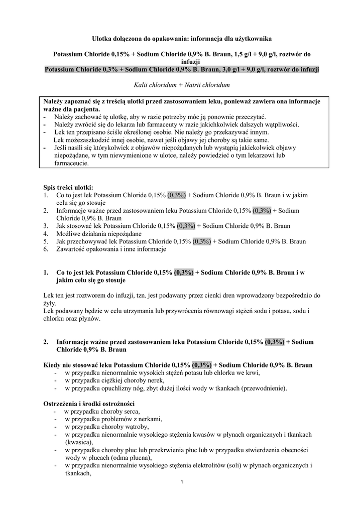 Ulotka dołączona do opakowania: informacja dla użytkownika Potassium Chloride 0,15% + Sodium Chloride 0,9% B. Braun, 1,5 g/l + 9,0 g/l, roztwór do infuzji Potassium Chloride 0,3% + Sodium Chloride 0,9% B. Braun, 3,0 g/l + 9,0 g/l, roztwór do infuzji Kalii chloridum + Natrii chloridum Należy zapoznać się z treścią ulotki przed zastosowaniem leku, ponieważ zawiera ona informacje ważne dla pacjenta. - Należy zachować tę ulotkę, aby w razie potrzeby móc ją ponownie przeczytać. - Należy zwrócić się do lekarza lub farmaceuty w razie jakichkolwiek dalszych wątpliwości. - Lek ten przepisano ściśle określonej osobie. Nie należy go przekazywać innym. Lek możezaszkodzić innej osobie, nawet jeśli objawy jej choroby są takie same. - Jeśli nasili się którykolwiek z objawów niepożądanych lub wystąpią jakiekolwiek objawy niepożądane, w tym niewymienione w ulotce, należy powiedzieć o tym lekarzowi lub farmaceucie. Spis treści ulotki: 1. Co to jest lek Potassium Chloride 0,15% (0,3%) + Sodium Chloride 0,9% B. Braun i w jakim celu się go stosuje 2. Informacje ważne przed zastosowaniem leku Potassium Chloride 0,15% (0,3%) + Sodium Chloride 0,9% B. Braun 3. Jak stosować lek Potassium Chloride 0,15% (0,3%) + Sodium Chloride 0,9% B. Braun 4. Możliwe działania niepożądane 5. Jak przechowywać lek Potassium Chloride 0,15% (0,3%) + Sodium Chloride 0,9% B. Braun 6. Zawartość opakowania i inne informacje 1. Co to jest lek Potassium Chloride 0,15% (0,3%) + Sodium Chloride 0,9% B. Braun i w jakim celu się go stosuje Lek ten jest roztworem do infuzji, tzn. jest podawany przez cienki dren wprowadzony bezpośrednio do żyły. Lek podawany będzie w celu utrzymania lub przywrócenia równowagi stężeń sodu i potasu, sodu i chlorku oraz płynów. 2. Informacje ważne przed zastosowaniem leku Potassium Chloride 0,15% (0,3%) + Sodium Chloride 0,9% B. Braun Kiedy nie stosować leku Potassium Chloride 0,15% (0,3%) + Sodium Chloride 0,9% B. Braun - w przypadku nienormalnie wysokich stężeń potasu lub chlorku we krwi, - w przypadku ciężkiej choroby nerek, - w przypadku opuchlizny nóg, zbyt dużej ilości wody w tkankach (przewodnienie). Ostrzeżenia i środki ostrożności - w przypadku choroby serca, - w przypadku problemów z nerkami, - w przypadku choroby wątroby, - w przypadku nienormalnie wysokiego stężenia kwasów w płynach organicznych i tkankach (kwasica), - w przypadku choroby płuc lub przekrwienia płuc lub w przypadku stwierdzenia obecności wody w płucach (odma płucna), - w przypadku nienormalnie wysokiego stężenia elektrolitów (soli) w płynach organicznych i tkankach, 1 - w przypadku zaburzeń funkcjonowania nadnerczy. W przypadku podawania tego leku dzieciom należy zachować szczególną ostrożność i dokładnie kontrolować stężenie soli i poziomy płynów. Inne leki i Potassium Chloride 0,15% (0,3%) + Sodium Chloride 0,9% B. Braun Należy powiedzieć lekarzowi lub farmaceucie o wszystkich lekach przyjmowanych obecnie lub ostatnio a także o lekach, które pacjent planuje przyjmować. W szczególności należy poinformować lekarza w przypadku przyjmowania niżej wymienionych leków, aby odpowiednio ustalić dawkę leku Potassium Chloride 0,15% (0,3%) + Sodium Chloride 0,9% B. Braun: - digoksyna (lek stosowany w chorobach serca), - leki zatrzymujące w organizmie sól, np. glikokortykosteroidy, takie jak hydrokortyzon lub prednizon, - leki moczopędne oszczędzające potas, np. leki zawierające spironolakton lub triamteren, - inne substancje mogące wpływać na wzrost stężenia potasu, takie jak pewne leki stosowane do leczenia nadciśnienia (tzw. inhibitory ACE), cyklosporyna lub suksametonium. Ciąża i karmienie piersią W ciąży i w okresie karmienia piersią lub gdy istnieje podejrzenie, że kobieta jest w ciąży, lub gdy planuje ciążę, przed zastosowaniem tego leku należy poradzić się lekarza lub farmaceuty. Ciąża Jeśli istnieje podejrzenie ciąży, należy natychmiast skontaktować się z lekarzem. Lek ten może być podawany kobietom w ciąży, jeśli tak zadecyduje lekarz. Karmienie piersią Należy natychmiast poinformować lekarza o karmieniu piersią. Lek ten może być podawany kobietom karmiącym piersią, jeśli tak zadecyduje lekarz. 3. Jak stosować lek Potassium Chloride 0,15% (0,3%) + Sodium Chloride 0,9% B. Braun Sposób podawania Lek ten będzie podawany na drodze infuzji bezpośrednio do żyły. W butelce znajduje się duża ilość powietrza. Aby uniknąć ryzyka zatoru powietrznego, nie należy podawać leku metodą infuzji ciśnieniowej. Dawkowanie Wielkość dawki ustalana będzie przez lekarza w zależności od wieku, wagi i stanu klinicznego pacjenta. W trakcie podawania tego leku stężenie elektrolitów (soli) oraz równowaga wodna będą rutynowo kontrolowane. Normalna maksymalna wielkość dawki dla pacjenta dorosłego wynosi 40 ml/kg masy ciała/dobę. Wielkość dawki dla dzieci będzie ustalana w zależności od wieku dziecka. Zastosowanie większej niż zalecana dawki leku Potassium Chloride 0,15% (0,3%) + Sodium Chloride 0,9% B. Braun Przyjęcie zbyt dużej dawki leku nie jest prawdopodobne, ponieważ infuzja będzie nadzorowana przez lekarza lub pielęgniarkę. Jeśli jednak dojdzie do przedawkowania leku, możliwe objawy to zaburzenia równowagi płynów oraz elektrolitów, opuchlizna oraz zaburzenia serca i układu krążenia. Inne objawy przedawkowania opisane zostały w dalszej części ulotki (patrz punkt 4). Sposób leczenia, mający na celu unormowanie stanu pacjenta, ustali lekarz. Możliwe jest zatrzymanie infuzji i podanie stosownych leków. W ekstremalnych przypadkach konieczne może okazać się dializowanie pacjenta. 2 W razie jakichkolwiek dalszych wątpliwości związanych ze stosowaniem tego leku należy zwrócić się do lekarza lub farmaceuty. 4. Możliwe działania niepożądane Jak każdy lek, lek ten może powodować działania niepożądane, chociaż nie u każd