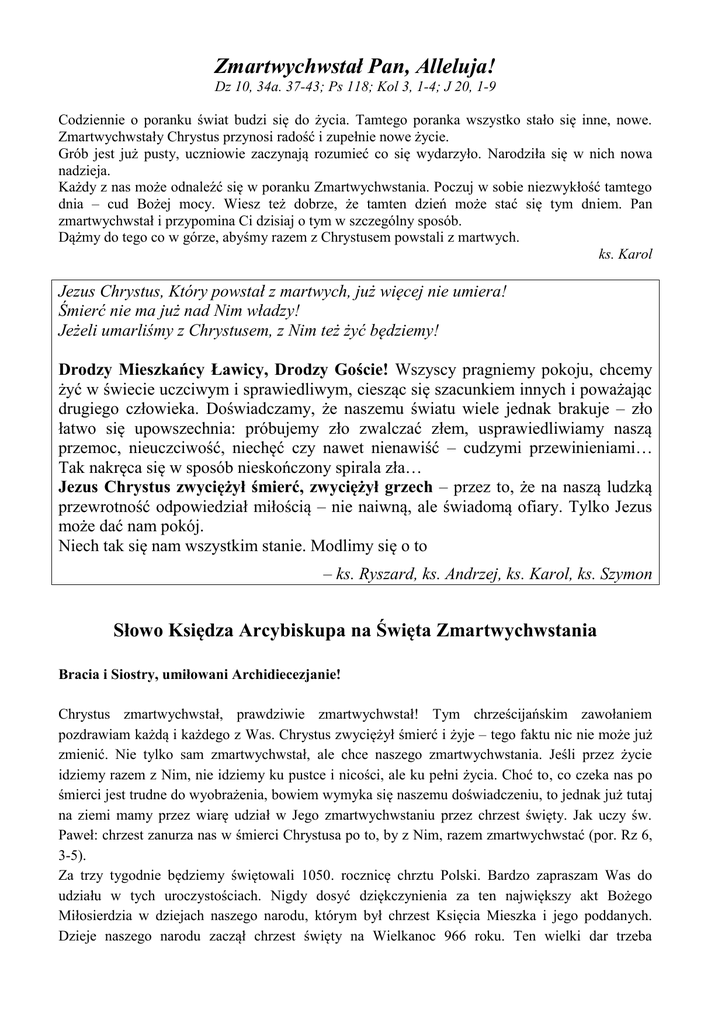 Zmartwychwstał Pan, Alleluja! Dz 10, 34a. 37-43; Ps 118; Kol 3, 1-4; J 20, 1-9 Codziennie o poranku świat budzi się do życia. Tamtego poranka wszystko stało się inne, nowe. Zmartwychwstały Chrystus przynosi radość i zupełnie nowe życie. Grób jest już pusty, uczniowie zaczynają rozumieć co się wydarzyło. Narodziła się w nich nowa nadzieja. Każdy z nas może odnaleźć się w poranku Zmartwychwstania. Poczuj w sobie niezwykłość tamtego dnia – cud Bożej mocy. Wiesz też dobrze, że tamten dzień może stać się tym dniem. Pan zmartwychwstał i przypomina Ci dzisiaj o tym w szczególny sposób. Dążmy do tego co w górze, abyśmy razem z Chrystusem powstali z martwych. ks. Karol Jezus Chrystus, Który powstał z martwych, już więcej nie umiera! Śmierć nie ma już nad Nim władzy! Jeżeli umarliśmy z Chrystusem, z Nim też żyć będziemy! Drodzy Mieszkańcy Ławicy, Drodzy Goście! Wszyscy pragniemy pokoju, chcemy żyć w świecie uczciwym i sprawiedliwym, ciesząc się szacunkiem innych i poważając drugiego człowieka. Doświadczamy, że naszemu światu wiele jednak brakuje – zło łatwo się upowszechnia: próbujemy zło zwalczać złem, usprawiedliwiamy naszą przemoc, nieuczciwość, niechęć czy nawet nienawiść – cudzymi przewinieniami… Tak nakręca się w sposób nieskończony spirala zła… Jezus Chrystus zwyciężył śmierć, zwyciężył grzech – przez to, że na naszą ludzką przewrotność odpowiedział miłością – nie naiwną, ale świadomą ofiary. Tylko Jezus może dać nam pokój. Niech tak się nam wszystkim stanie. Modlimy się o to – ks. Ryszard, ks. Andrzej, ks. Karol, ks. Szymon Słowo Księdza Arcybiskupa na Święta Zmartwychwstania Bracia i Siostry, umiłowani Archidiecezjanie! Chrystus zmartwychwstał, prawdziwie zmartwychwstał! Tym chrześcijańskim zawołaniem pozdrawiam każdą i każdego z Was. Chrystus zwyciężył śmierć i żyje – tego faktu nic nie może już zmienić. Nie tylko sam zmartwychwstał, ale chce naszego zmartwychwstania. Jeśli przez życie idziemy razem z Nim, nie idziemy ku pustce i nicości, ale ku pełni życia. Choć to, co czeka nas po śmierci jest trudne do wyobrażenia, bowiem wymyka się naszemu doświadczeniu, to jednak już tutaj na ziemi mamy przez wiarę udział w Jego zmartwychwstaniu przez chrzest święty. Jak uczy św. Paweł: chrzest zanurza nas w śmierci Chrystusa po to, by z Nim, razem zmartwychwstać (por. Rz 6, 3-5). Za trzy tygodnie będziemy świętowali 1050. rocznicę chrztu Polski. Bardzo zapraszam Was do udziału w tych uroczystościach. Nigdy dosyć dziękczynienia za ten największy akt Bożego Miłosierdzia w dziejach naszego narodu, którym był chrzest Księcia Mieszka i jego poddanych. Dzieje naszego narodu zaczął chrzest święty na Wielkanoc 966 roku. Ten wielki dar trzeba przekazywać następnym pokoleniom. Uczynimy to wtedy, gdy sami będziemy żyli duchowością chrzcielną, kiedy będziemy żyli wolnością dzieci Bożych, do której wyswobodził nas Chrystus. To wolność od grzechu i siła do czynienia dobra, do miłości większej i bez granic. To świadomość godności dzieci Bożych, którą na chrzcie otrzymaliśmy. Razem z Chrystusem możemy do Boga wołać: Ojcze! Tej duchowej radości życzę z całego serca. Modlę się za Was i proszę o modlitwę. Módlmy się wszyscy za naszą Ojczyznę. Niech nigdy nie utraci żywej wiary. Niech pozostanie wierna Chrystusowi i Ewangelii. Niech różne trudności, których doświadczamy, zostaną pokonane z Bożą pomocą i dobrą wolą nas wszystkich. Z serca Wam wszystkim b ł o g o s ł a w i ę + Stanisław Gądecki, Arcybiskup Metropolita Poznański Ogłoszenia duszpasterskie 1. Dzisiaj Niedziela Zmartwychwstania Pańskiego - Msze Święte o 9:30, 11:00, 12:30 i 18:00 (nie będzie Mszy o 8:00 i o 14:00). - Koronkę do Miłosierdzia Bożego odmówimy po Mszy Świętej o 9:30. 2. Poniedziałek Wielkanocny – II Święto Zmartwychwstania Pańskiego – 28 marca - Msze Święte o 8:00, 9:30, 11:00, 12:30 i 18:00 (nie ma Mszy o 14:00). Przed kościołem zbiórka ofiar na potrzeby Katolickiego Uniwersytetu Lubelskiego, poznańskiego Wydziału Teologicznego UAM oraz naszych szkół katolickich. W poniedziałek na Mszy o 8:00 chcemy szczególnie polecać Panu Bogu Siostrę Przełożoną Krystynę, z racji niedawnych imienin. Koronkę do Bożego Miłosierdzia odmówimy w drugie święto o 17:45 a w dni powszednie po Mszy Świętej o 18:00. 3. Biuro parafialne w tym tygodniu będzie czynne we wtorek (od 16:00 do 17:30) i w czwartek (od 18:40 do 20:00). 4. Różaniec w niedzielę i Święta o 9:00, w dni powszednie o 17:30. Nowenna do Matki Bożej Nieustającej Pomocy – w środę ok. 18:30. W czwartek zapraszamy na Adorację Najświętszego Sakramentu rano – do 9:00 i wieczorem o 18:30; Godzinki o Niepokalanym Poczęciu Matki Bożej – w niedzielę o 7:30. 5. Przypominamy, że w tym tygodniu przypada pierwszy piątek miesiąca – zachęcamy dzieci, młodzież i dorosłych, aby w tym dniu przyjąć do serca Pana Jezusa w Komunii Świętej (na Mszy Świętej o 18:00); jeżeli nie jesteśmy w stanie łaski uświęcającej, w piątek od 17:00 będzie można skorzystać ze spowiedzi świętej. 6. W pierwszą sobotę miesiąca zapraszamy na Mszę Świętą wynagradzającą o 7:30 oraz na Adorację Najświętszego Sakramentu z „nabożeństwem pierwszych sobót” (do 9:30). Ponieważ osoby chore i starsze odwiedziliśmy w miniony piątek, kolejne odwiedziny będą na początku maja. natomiast już dzisiaj zapraszamy wszystkich na co dzień pozostających w domach na Mszę Świętą z Księdzem Biskupem Damianem Brylem – pragnie on ofiarować Mszę Świętą w intencji wszystkich Seniorów naszej parafii w środę, 20 kwietnia o 10:00 (w ramach wizytacji naszej parafii). 7. W sobotę, 2 kwietnia przypada 5-a rocznica śmierci naszego Pierwszego Proboszcza, ś.p. Księdza Tomasza Maćkowiaka – chcemy 
