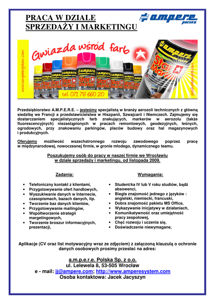PRACA W DZIALE SPRZEDAśY I MARKETINGU Przedsiębiorstwo A.M.P.E.R.E. – jesteśmy specjalistą w branŜy aerozoli technicznych z główną siedzibę we Francji a przedstawicielstwa w Hiszpanii, Szwajcarii i Niemczech. Zajmujemy się dostarczaniem specjalistycznych farb znakujących, markerów w aerozolu (takŜe fluorescencyjnych) niezastąpionych w pracach remontowych, geodezyjnych, leśnych, ogrodowych, przy znakowaniu parkingów, placów budowy oraz hal magazynowych i produkcyjnych. Oferujemy moŜliwość wszechstronnego rozwoju zawodowego poprzez w międzynarodowej, nowoczesnej firmie, w gronie młodego, dynamicznego teamu. pracę Poszukujemy osób do pracy w naszej firmie we Wrocławiu w dziale sprzedaŜy i marketingu, od listopada 2009. Zadania: • • • • • • • Telefoniczny kontakt z klientami, Przygotowywanie ofert handlowych, Wyszukiwanie danych w Internecie, czasopismach, bazach danych, itp. Tworzenie baz danych klientów, Przygotowywanie mailingów, Współtworzenie strategii margetingowych, Tworzenie broszur informacyjnych, prezentacji, Wymagania: • • • • • • • Student/ka IV lub V roku studiów, bądź absowenci, Biegła znajomość jednego z języków : angielski, niemiecki, francuski, Dobra znajomość pakietu MS Office, Wykazywanie inicjatywy w działaniach, Komunikatywność oraz umiejętność pracy zespołowej, Chęć rozwoju i uczenia się, Doświadczenie niewymagane, Aplikacje (CV oraz list motywacyjny wraz ze zdjęciem) z załączoną klauzulą o ochronie danych osobowych prosimy przesłać na adres: a.m.p.e.r.e. Polska Sp. z o.o. ul. Lelewela 8, 53-505 Wrocław e - mail: [email protected]; http://www.amperesystem.com Osoba kontaktowa: Jacek Jacyszyn