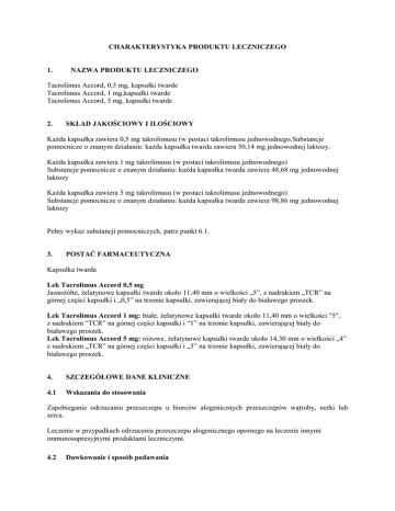 CHARAKTERYSTYKA PRODUKTU LECZNICZEGO 1. NAZWA PRODUKTU LECZNICZEGO Tacrolimus Accord, 0,5 mg, kapsułki twarde Tacrolimus Accord, 1 mg,kapsułki twarde Tacrolimus Accord, 5 mg, kapsułki twarde 2. SKŁAD JAKOŚCIOWY I ILOŚCIOWY Każda kapsułka zawiera 0,5 mg takrolimusu (w postaci takrolimusu jednowodnego.Substancje pomocnicze o znanym działaniu: każda kapsułka twarda zawiera 50,14 mg jednowodnej laktozy. Każda kapsułka zawiera 1 mg takrolimusu (w postaci takrolimusu jednowodnego) Substancje pomocnicze o znanym działaniu: każda kapsułka twarda zawiera 48,68 mg jednowodnej laktozy Każda kapsułka zawiera 5 mg takrolimusu (w postaci takrolimusu jednowodnego) Substancje pomocnicze o znanym działaniu: każda kapsułka twarda zawiera 98,86 mg jednowodnej laktozy Pełny wykaz substancji pomocniczych, patrz punkt 6.1. 3. POSTAĆ FARMACEUTYCZNA Kapsułka twarda Lek Tacrolimus Accord 0,5 mg Jasnożółte, żelatynowe kapsułki twarde około 11,40 mm o wielkości „5”, z nadrukiem „TCR” na górnej części kapsułki i „0,5” na trzonie kapsułki, zawierającej biały do białawego proszek. Lek Tacrolimus Accord 1 mg: białe, żelatynowe kapsułki twarde około 11,40 mm o wielkości "5", z nadrukiem “TCR” na górnej części kapsułki i “1” na trzonie kapsułki, zawierającej biały do białawego proszek. Lek Tacrolimus Accord 5 mg: różowe, żelatynowe kapsułki twarde około 14,30 mm o wielkości „4” z nadrukiem „TCR” na górnej części kapsułki i „5” na trzonie kapsułki, zawierającej biały do białawego proszek. 4. SZCZEGÓŁOWE DANE KLINICZNE 4.1 Wskazania do stosowania Zapobieganie odrzucaniu przeszczepu u biorców alogenicznych przeszczepów wątroby, nerki lub serca. Leczenie w przypadkach odrzucenia przeszczepu alogenicznego opornego na leczenie innymi immunosupresyjnymi produktami leczniczymi. 4.2 Dawkowanie i sposób podawania Dawkowanie Terapia takrolimusem wymaga starannego monitorowania przez odpowiednio przeszkolony i wyposażony personel. Ten produkt leczniczy mogą przepisywać oraz wprowadzać zmiany w leczeniu immunosupresyjnym, wyłącznie lekarze, którzy posiadają doświadczenie w leczeniu immunosupresyjnym oraz postępowaniu z pacjentami po przeszczepieniu narządów. Nieumyślna, niezamierzona lub nienadzorowana przez lekarza zamiana postaci farmaceutycznych o szybkim uwalnianiu lub o przedłużonym uwalnianiu takrolimusu jest niebezpieczna. Może ona prowadzić do odrzucania przeszczepionego narządu lub zwiększenia częstości działań niepożądanych, w tym niewystarczającej lub nadmiernej immunosupresji, w wyniku klinicznie znaczących różnic w ogólnoustrojowej ekspozycji na takrolimus. Pacjent powinien otrzymywać jedną postać farmaceutyczną produktu leczniczego zawierającego takrolimus, zgodnie z odpowiadającym mu dobowym schematem dawkowania. Zmiana postaci farmaceutycznej produktu leczniczego zawierającego takrolimus lub zmiana schematu dawkowania powinny odbywać się wyłącznie pod wnikliwym nadzorem specjalisty transplantologa (patrz punkt 4.4 i 4.8). Podczas zamiany na jakikolwiek inny produkt leczniczy zawierający takrolimus konieczne jest monitorowanie stężenia leku we krwi i dostosowanie dawki, aby mieć pewność, że ogólnoustrojowa ekspozycja na takrolimus pozostała niezmieniona. Uwagi ogólne Przedstawione poniżej zalecenia dotyczące dawek początkowych należy traktować wyłącznie jako wskazówkę. Dawkowanie produktu leczniczego Tacrolimus Accord należy ustalać indywidualnie na podstawie klinicznej oceny odrzucania i tolerowania przeszczepu ,wspomagając się monitorowaniem stężenia leku we krwi (patrz poniżej „Zalecenia dotyczące docelowych najniższych skutecznych stężeń w pełnej krwi”). Jeśli wystąpią kliniczne objawy odrzucania, należy rozważyć zmianę schematu leczenia immunosupresyjnego. Takrolimus można podawać dożylnie lub doustnie. Zazwyczaj leczenie można rozpocząć od podawania produktu leczniczego doustnie. W razie konieczności zawartość kapsułki można podać przez sondę nosowo-żołądkową w postaci zawiesiny w wodzie. W początkowym okresie pooperacyjnym produkt leczniczy Tacrolimus Accord podaje się rutynowo w połączeniu z innymi lekami immunosupresyjnymi. Dawka produktu leczniczego Tacrolimus Accord może różnić się w zależności od wybranego schematu leczenia immunosupresyjnego. Sposób podawania Zaleca się przyjmowanie dobowej dawki produktu leczniczego w dwóch dawkach podzielonych (np. rano i wieczorem). Kapsułki należy przyjmować natychmiast po wyjęciu z blistra. Połknięte kapsułki należy popić płynem (najlepiej wodą). W celu uzyskania maksymalnego wchłaniania kapsułki należy przyjmować na czczo lub co najmniej 1. godzinę przed lub 2 do 3. godzin po posiłku. (patrz punkt 5.2). Czas trwania leczenia Aby zahamować odrzucanie przeszczepu, konieczne jest utrzymywanie immunosupresji. Nie ma wobec tego ograniczeń czasu trwania leczenia doustnego. Zalecane dawkowanie – przeszczepienie wątroby Zapobieganie odrzucaniu przeszczepu – dorośli Doustne leczenie takrolimusem należy rozpocząć od dawki 0,10 mg/kg mc./dobę do 0,20 mg/kg mc./dobę, podawanej w dwóch dawkach podzielonych (np. rano i wieczorem). Podawanie produktu leczniczego należy rozpocząć około 12 godzin po zakończeniu zabiegu chirurgicznego. Jeśli kliniczny stan pacjenta nie pozwala na doustne podawanie dawki, należy rozpocząć dożylne podawanie w dawce 0,01 mg/kg mc./dobę do 0,05 mg/kg mc./dobę w ciągłej infuzji trwającej 24 godziny. Zapobieganie odrzucaniu przeszczepu – dzieci Doustna dawka początkowa wynosi 0,30 mg/kg mc./dobę, podawana w dwóch dawkach podzielonych (np. rano i wieczorem). Jeśli kliniczny stan pacjenta nie pozwala na doustne podawanie dawki, początkową dawkę dożylną 0,05 mg/kg mc./dobę należy podawać w ciągłej infuzji trwającej 24 godziny. Dostosowanie dawki w okresie potransplantacyjnym u doros