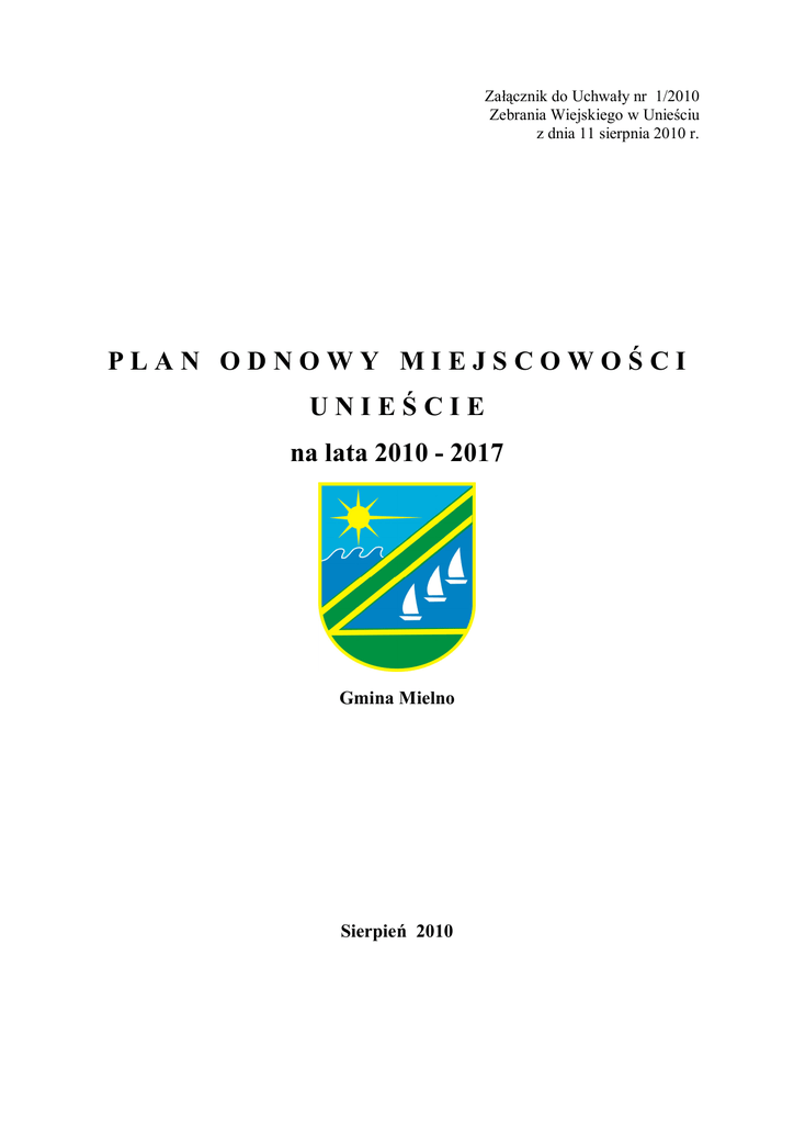 Załącznik do Uchwały nr 1/2010 Zebrania Wiejskiego w Unieściu z dnia 11 sierpnia 2010 r. PLAN ODNOWY MIEJSCOWOŚCI UNIEŚCIE na lata 2010 - 2017 Gmina Mielno Sierpień 2010 SPIS TREŚCI 1. Charakterystyka miejscowości.......................................................................................4 2. Inwentaryzacja zasobów służących odnowie miejscowości...........................................6 3. Ocena mocnych i słabych stron miejscowości (Analiza SWOT). ..................................9 4. Opis i charakterystyka obszarów o szczególnym znaczeniu dla zaspokojenia potrzeb mieszkańców, sprzyjających nawiązywaniu kontaktów społecznych, ze względu na ich położenie oraz cechy funkcjonalno-przestrzenne. .............................................................13 5. Opis planowanych zadań inwestycyjnych i przedsięwzięć aktywizujących społeczność lokalną w okresie 7 lat od dnia przyjęcia planu. ...........................................14 Priorytet I. Zagospodarowanie obiektów i przestrzeni publicznej ...................................15 1. Zagospodarowanie placu przy GOPS na cele rekreacyjno-sportowe.......................15 2. Remont budynku GOPS .........................................................................................15 3. Zagospodarowanie placu przy GOPS na cele rekreacyjno-sportowe, etap II ...........15 4. Zagospodarowanie placu przy jeziorze pomiędzy ul. Esperanto i ośrodkiem WDW ..............................................................................................................................16 5. Zagospodarowanie placu nad jeziorem Jamno przy ul. 6 Marca (na wys. ul. Chełmońskiego) .....................................................................................................16 Priorytet II. Budowa i modernizacja ulic oraz ciągów spacerowych i rowerowych ........17 1. Przebudowa ulicy Pogodnej ...................................................................................17 2. Przebudowa ulicy Prądno.......................................................................................17 3. Budowa przejścia na plażę na wysokości ośrodka WDW .......................................17 4. Budowa promenady wzdłuż brzegu Jeziora Jamno, etap I ......................................18 5. Budowa chodnika od ul. Pogodnej do ul. Rybackiej ...............................................18 6. Budowa promenady wzdłuż brzegu Jeziora Jamno, etap II .....................................18 Priorytet III. Aktywizacja społeczna .................................................................................19 1. Zapobieganie wykluczeniu społecznemu................................................................19 2. Ognisko Muzyczne w Unieściu ..............................................................................19 3. Rozwój aktywności społecznej poprzez wspieranie inicjatyw organizacji pozarządowych ......................................................................................................19 Priorytet IV. Budowa portu jachtowo pasażerskiego na kanale jamneńskim .................20 1. Budowa mariny jachtowej nad jeziorem Jamno ......................................................20 2. Uregulowanie kanału jamneńskiego .......................................................................20 3. Budowa falochronów i awanportu..........................................................................21 4. Budowa mostu ruchomego nad kanałem jamneńskim.............................................21 2 Wstęp. Plan Odnowy Miejscowości Unieście jest dokumentem stwarzającym możliwość ubiegania się miejscowości o uzyskanie wsparcia finansowego na realizację zadań na terenie sołectwa w ramach Programu Rozwoju Obszarów Wiejskich na lata 2007-2013. Podstawowym założeniem tego Programu są działania na rzecz rozwoju obszarów wiejskich. W ramach działania Odnowa i rozwój wsi PROW każde sołectwo może uzyskać maksymalne wsparcie w wysokości 500 tys. zł w okresie programowania (lata 2007-2013). Poza w/w limitem można składać wnioski o dofinansowanie mniejszych projektów do Lokalnej Grupy Działania. Zakres przedmiotowy operacji możliwych do wsparcia w ramach programu zamieszczono na str. 14. Prace nad powstaniem planu rozpoczęły się w maju 2007 roku. W opracowaniu tego dokumentu brali udział pracownicy Urzędu Gminy w Mielnie - Sekcja Zamówień Publicznych i Funduszy Europejskich, pod kierownictwem Pana Zastępcy Wójta oraz aktywna część społeczności lokalnej miejscowości Unieście, w szczególności Pan Sołtys i Rada Sołecka. Pierwszy Plan Odnowy Miejscowości Unieście został uchwalony przez Zebranie Wiejskie w Mielnie w dniu 10 września 2007 r. i zatwierdzony uchwałą Nr XIII/114/2007 Rady Gminy w Mielnie z dnia 27 września 2007 r. Niniejszy Plan odnowy miejscowości jest nowym dokumentem, uwzględniającym wymogi Rozporządzenia Ministra Rolnictwa i Rozwoju Wsi z dnia 14 lutego 2008 r. w sprawie szczegółowych warunków i trybu przyznawania pomocy finansowej w ramach działania „Odnowa i rozwój wsi” objętego Programem Rozwoju Obszarów Wiejskich na lata 2007-2013 oraz dwóch rozporządzeń zmieniających. Opracowanie Planu Odnowy Miejscowości, a następnie realizacja założeń w nim zawartych związane jest z określonymi korzyściami dla społeczności lokalnej miejscowości. Opracowanie tego dokumentu stwarza m.in. następujące możliwość: - korzystanie z funduszy strukturalnych i innych zewnętrznych źródeł finansowania; - wpływ na wzrost atrakcyjności życia społeczno – kulturalnego miejscowości; - wdrażanie pozytywnych zmian akceptowanych przez mieszkańców; - aktywizacja społeczności lokalnej – integracja mieszkańców wokół działania na rzecz własnego środowiska. Plan Odnowy Miejscowości Unieście jest zgodny z założeniami Strategii Rozwoju Gminy Mielno do 2013 roku oraz z Wieloletnim Planem Inwest