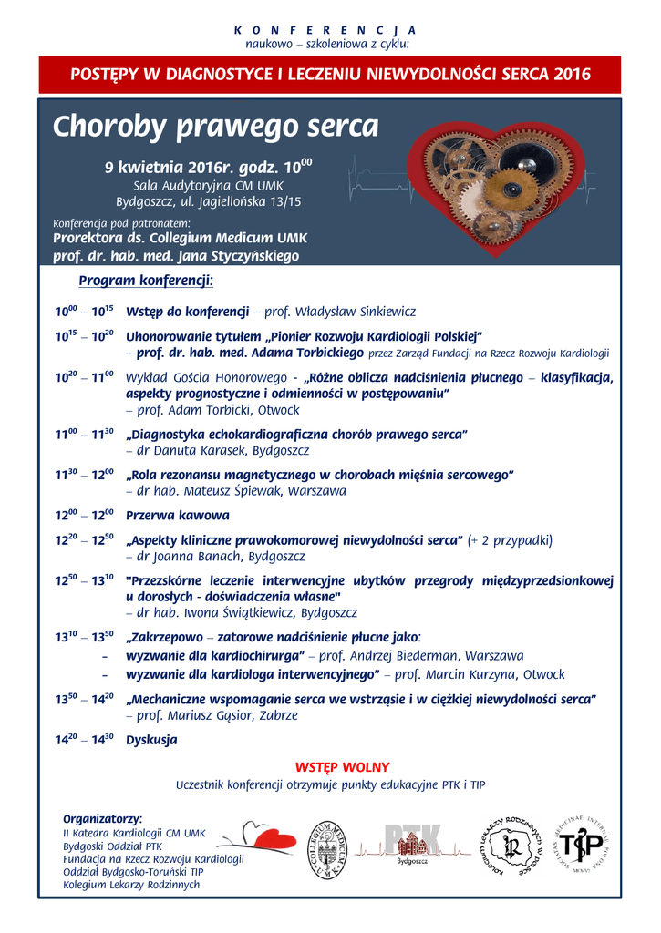 K O N F E R E N C J A naukowo – szkoleniowa z cyklu: POSTĘPY W DIAGNOSTYCE I LECZENIU NIEWYDOLNOŚCI SERCA 2016 Choroby prawego serca 9 kwietnia 2016r. godz. 1000 Sala Audytoryjna CM UMK Bydgoszcz, ul. Jagiellońska 13/15 Konferencja pod patronatem: Prorektora ds. Collegium Medicum UMK prof. dr. hab. med. Jana Styczyńskiego Program konferencji: 1000 – 1015 Wstęp do konferencji – prof. Władysław Sinkiewicz 1015 – 1020 Uhonorowanie tytułem „Pionier Rozwoju Kardiologii Polskiej” – prof. dr. hab. med. Adama Torbickiego przez Zarząd Fundacji na Rzecz Rozwoju Kardiologii 1020 – 1100 Wykład Gościa Honorowego - „Różne oblicza nadciśnienia płucnego – klasyfikacja, aspekty prognostyczne i odmienności w postępowaniu” – prof. Adam Torbicki, Otwock 1100 – 1130 „Diagnostyka echokardiograficzna chorób prawego serca” – dr Danuta Karasek, Bydgoszcz 1130 – 1200 „Rola rezonansu magnetycznego w chorobach mięśnia sercowego” – dr hab. Mateusz Śpiewak, Warszawa 1200 – 1200 Przerwa kawowa 1220 – 1250 „Aspekty kliniczne prawokomorowej niewydolności serca” (+ 2 przypadki) – dr Joanna Banach, Bydgoszcz 1250 – 1310 "Przezskórne leczenie interwencyjne ubytków przegrody międzyprzedsionkowej u dorosłych - doświadczenia własne" – dr hab. Iwona Świątkiewicz, Bydgoszcz 1310 – 1350 „Zakrzepowo – zatorowe nadciśnienie płucne jako: ˗ ˗ wyzwanie dla kardiochirurga” – prof. Andrzej Biederman, Warszawa wyzwanie dla kardiologa interwencyjnego” – prof. Marcin Kurzyna, Otwock 1350 – 1420 „Mechaniczne wspomaganie serca we wstrząsie i w ciężkiej niewydolności serca” – prof. Mariusz Gąsior, Zabrze 1420 – 1430 Dyskusja WSTĘP WOLNY Uczestnik konferencji otrzymuje punkty edukacyjne PTK i TIP Organizatorzy: II Katedra Kardiologii CM UMK Bydgoski Oddział PTK Fundacja na Rzecz Rozwoju Kardiologii Oddział Bydgosko-Toruński TIP Kolegium Lekarzy Rodzinnych
