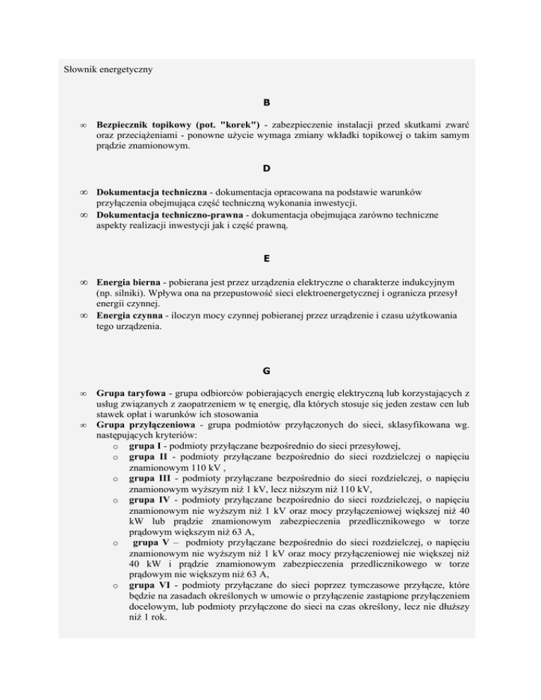 Słownik energetyczny B • Bezpiecznik topikowy (pot. "korek") - zabezpieczenie instalacji przed skutkami zwarć oraz przeciążeniami - ponowne użycie wymaga zmiany wkładki topikowej o takim samym prądzie znamionowym. D • • Dokumentacja techniczna - dokumentacja opracowana na podstawie warunków przyłączenia obejmująca część techniczną wykonania inwestycji. Dokumentacja techniczno-prawna - dokumentacja obejmująca zarówno techniczne aspekty realizacji inwestycji jak i część prawną. E • • Energia bierna - pobierana jest przez urządzenia elektryczne o charakterze indukcyjnym (np. silniki). Wpływa ona na przepustowość sieci elektroenergetycznej i ogranicza przesył energii czynnej. Energia czynna - iloczyn mocy czynnej pobieranej przez urządzenie i czasu użytkowania tego urządzenia. G • • Grupa taryfowa - grupa odbiorców pobierających energię elektryczną lub korzystających z usług związanych z zaopatrzeniem w tę energię, dla których stosuje się jeden zestaw cen lub stawek opłat i warunków ich stosowania Grupa przyłączeniowa - grupa podmiotów przyłączonych do sieci, sklasyfikowana wg. następujących kryteriów: o grupa I - podmioty przyłączane bezpośrednio do sieci przesyłowej, o grupa II - podmioty przyłączane bezpośrednio do sieci rozdzielczej o napięciu znamionowym 110 kV , o grupa III - podmioty przyłączane bezpośrednio do sieci rozdzielczej, o napięciu znamionowym wyższym niż 1 kV, lecz niższym niż 110 kV, o grupa IV - podmioty przyłączane bezpośrednio do sieci rozdzielczej, o napięciu znamionowym nie wyższym niż 1 kV oraz mocy przyłączeniowej większej niż 40 kW lub prądzie znamionowym zabezpieczenia przedlicznikowego w torze prądowym większym niż 63 A, o grupa V – podmioty przyłączane bezpośrednio do sieci rozdzielczej, o napięciu znamionowym nie wyższym niż 1 kV oraz mocy przyłączeniowej nie większej niż 40 kW i prądzie znamionowym zabezpieczenia przedlicznikowego w torze prądowym nie większym niż 63 A, o grupa VI - podmioty przyłączane do sieci poprzez tymczasowe przyłącze, które będzie na zasadach określonych w umowie o przyłączenie zastąpione przyłączeniem docelowym, lub podmioty przyłączone do sieci na czas określony, lecz nie dłuższy niż 1 rok. I • Instalacja elektryczna - zespół urządzeń elektroenergetycznych (takich jak: przewody, wyłączniki nadprądowe i różnicowoprądowe, bezpieczniki, aparatura pomiarowa itp.), przeznaczonych do doprowadzenia energii elektrycznej z sieci do poszczególnych odbiorników (gniazdek wtyczkowych, punktów oświetleniowych lub podłączonych na stałe urządzeń pobierających energię elektryczną). W lokalach mieszkalnych z tradycyjnymi urządzeniami (oświetlenie, sprzęt RTV i drobny sprzęt AGD) występuje na ogół instalacja jednofazowa, o napięciu znamionowym 230 V. Do podłączenia urządzeń o dużej mocy (np. ogrzewanie elektryczne, kuchenka elektryczna, podgrzewacze wody) konieczna jest instalacja trójfazowa, w której napięcie pomiędzy kolejnymi przewodami fazowymi wynosi 400 V. K • • Kilowatogodzina (kWh) - jest to jednostka energii elektrycznej, określająca ilość energii, jaką urządzenie o mocy 1 kW zużywa w ciągu godziny. Kompensacja mocy biernej - zwiększony pobór prądu wywołany dużym współczynnikiem mocy tg . Zwiększa nie tylko straty mocy w liniach zasilających ale wymaga stosowania transformatorów o większej mocy znamionowej. W tym celu stosuje się różne metody poprawy współczynnika mocy. Wszystkie te metody polegają na kompensowaniu mocy biernej indukcyjnej, mocą bierną pojemnościową. Jedną z powszechnie stosowanych metod jest kompensacja mocy biernej za pomocą kondensatorów. M • • • • Miejsce dostarczania energii - punkt w sieci, do którego przedsiębiorstwo energetyczne jest zobowiązane dostarczać energię elektryczną, określony w umowie o przyłączenie, w umowie o świadczenie usług przesyłowych albo w umowie sprzedaży energii elektrycznej. Moc elektryczna - jest to iloczyn napięcia i natężenia prądu. Podstawową jednostką mocy jest 1 wat (1 W = 1 V · 1 A). Najczęściej używane są jednostki znacznie większe jak: 1 kilowat (1 kW = 1000 W), 1 megawat (1 MW = 1000000 W), 1 gigawat (1 GW = 1000000000 W) Moc przyłączeniowa - moc czynna planowana do pobierania lub wprowadzania do sieci, służąca do zaprojektowania przyłącza, określona w umowie o przyłączenie jako wartość maksymalna ze średnich wartości tej mocy w okresie 15 minut. Moc umowna - moc czynna pobierana lub wprowadzana do sieci, określana w umowie o świadczenie usług przesyłowych lub umowie sprzedaży energii jako wartość maksymalna ze średnich wartości tej mocy w okresie 15 minut. Moc pobrana - największy 15 minutowy pobór mocy czynnej z sieci w okresie rozliczeniowym. N • • • Napięcie - jest to różnica potencjałów pomiędzy przewodem lub punktem w instalacji elektrycznej a innym przewodem lub punktem, bądź też Ziemią. Jednostką napięcia jest 1 Wolt (V). W instalacji napięcie między przewodem każdej z faz a Ziemią wynosi 230 V, a pomiędzy dwoma przewodami różnych faz 400 V. Nielegalny pobór energii elektrycznej - należy przez to rozumieć pobieranie energii bez zawarcia umowy ze sprzedawcą lub niezgodnie z zawartą umową. Niskie napięcie (nn) - napięcie nie wyższe niż 1 kV. • Natężenie - jest to ilość prądu, płynącego w przewodzie elektrycznym. Jednostką natężenia jest 1 amper (A) O • • • • • Odbiorca - każdy, kto otrzymuje lub pobiera energię elektryczną na podstawie umowy z przedsiębiorstwem energetycznym. Ograniczniki przepięć - są aparatami stosowanymi do ochrony urządzeń elektrycznych przed przepięciami atmosferycznymi lub wewnętrznymi (powstającymi wewnątrz sieci w postaci przepięć długotrwałych, dorywczych i łączeniowych). Okres rozliczeniowy - okres pomiędzy dwoma kolejnym