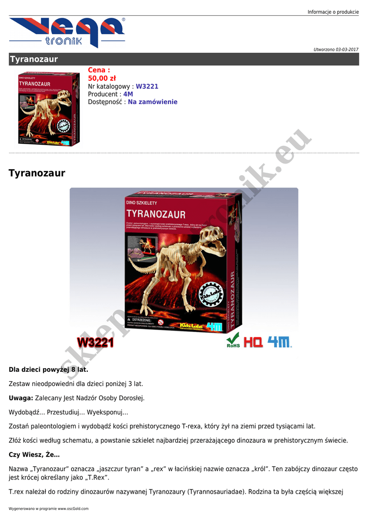 Informacje o produkcie Utworzono 03-03-2017 Tyranozaur Cena : 50,00 zł eu Nr katalogowy : W3221 Producent : 4M Dostępność : Na zamówienie sk le p. ve g atr on i k. Tyranozaur Dla dzieci powyżej 8 lat. Zestaw nieodpowiedni dla dzieci poniżej 3 lat. Uwaga: Zalecany Jest Nadzór Osoby Dorosłej. Wydobądź… Przestudiuj… Wyeksponuj… Zostań paleontologiem i wydobądź kości prehistorycznego T-rexa, który żył na ziemi przed tysiącami lat. Złóż kości według schematu, a powstanie szkielet najbardziej przerażającego dinozaura w prehistorycznym świecie. Czy Wiesz, Że… Nazwa „Tyranozaur” oznacza „jaszczur tyran” a „rex” w łacińskiej nazwie oznacza „król”. Ten zabójczy dinozaur często jest krócej określany jako „T.Rex”. T.rex należał do rodziny dinozaurów nazywanej Tyranozaury (Tyrannosauriadae). Rodzina ta była częścią większej Wygenerowano w programie www.oscGold.com grupy mięsożernych dinozaurów, nazywanej Karnozaury (Carnosauria). Pierwsze kości Tyranozaura zostały znalezione w stanie Montana w USA w 1902 roku. Były to szczęki, części kości czaszki, kości kręgosłupa, ramion, miednicy i tylnych nóg. Zajrzyj do środka – znajdziesz tam więcej ciekawych faktów. BAW SIĘ I UCZ JEDNOCZEŚNIE! Zawartość: Zestaw zawiera bryłę gipsu w której ukryte są kości dinozaura oraz narzędzia do prowadzenia wykopalisk. Po odnalezieniu i oczyszczeniu wszystkich kości można z nich złożyć cały szkielet. Gotowy szkielet ma około 19 cm długości. Dołączona do zestawu kartonowa karta ekspozycyjna zawiera wiele ciekawych informacji na temat T-rexa na odwrocie. sk le p. ve g atr on i k. eu Wymiary pudełka: 17x22x6 cm.