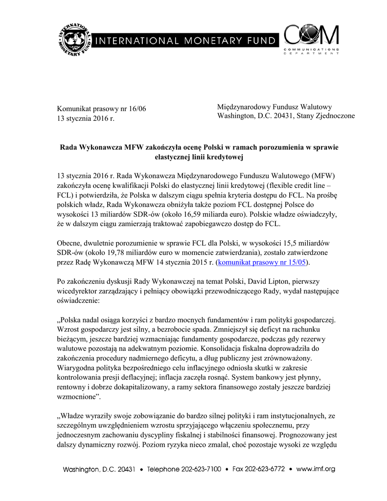 Komunikat prasowy nr 16/06 13 stycznia 2016 r. Międzynarodowy Fundusz Walutowy Washington, D.C. 20431, Stany Zjednoczone Rada Wykonawcza MFW zakończyła ocenę Polski w ramach porozumienia w sprawie elastycznej linii kredytowej 13 stycznia 2016 r. Rada Wykonawcza Międzynarodowego Funduszu Walutowego (MFW) zakończyła ocenę kwalifikacji Polski do elastycznej linii kredytowej (flexible credit line – FCL) i potwierdziła, że Polska w dalszym ciągu spełnia kryteria dostępu do FCL. Na prośbę polskich władz, Rada Wykonawcza obniżyła także poziom FCL dostępnej Polsce do wysokości 13 miliardów SDR-ów (około 16,59 miliarda euro). Polskie władze oświadczyły, że w dalszym ciągu zamierzają traktować zapobiegawczo dostęp do FCL. Obecne, dwuletnie porozumienie w sprawie FCL dla Polski, w wysokości 15,5 miliardów SDR-ów (około 19,78 miliardów euro w momencie zatwierdzania), zostało zatwierdzone przez Radę Wykonawczą MFW 14 stycznia 2015 r. (komunikat prasowy nr 15/05). Po zakończeniu dyskusji Rady Wykonawczej na temat Polski, David Lipton, pierwszy wicedyrektor zarządzający i pełniący obowiązki przewodniczącego Rady, wydał następujące oświadczenie: „Polska nadal osiąga korzyści z bardzo mocnych fundamentów i ram polityki gospodarczej. Wzrost gospodarczy jest silny, a bezrobocie spada. Zmniejszył się deficyt na rachunku bieżącym, jeszcze bardziej wzmacniając fundamenty gospodarcze, podczas gdy rezerwy walutowe pozostają na adekwatnym poziomie. Konsolidacja fiskalna doprowadziła do zakończenia procedury nadmiernego deficytu, a dług publiczny jest zrównoważony. Wiarygodna polityka bezpośredniego celu inflacyjnego odniosła skutki w zakresie kontrolowania presji deflacyjnej; inflacja zaczęła rosnąć. System bankowy jest płynny, rentowny i dobrze dokapitalizowany, a ramy sektora finansowego zostały jeszcze bardziej wzmocnione”. „Władze wyraziły swoje zobowiązanie do bardzo silnej polityki i ram instytucjonalnych, ze szczególnym uwzględnieniem wzrostu sprzyjającego włączeniu społecznemu, przy jednoczesnym zachowaniu dyscypliny fiskalnej i stabilności finansowej. Prognozowany jest dalszy dynamiczny rozwój. Poziom ryzyka nieco zmalał, choć pozostaje wysoki ze względu 2 na utrzymującą się niepewność związaną ze skutkami zacieśniania polityki monetarnej w Stanach Zjednoczonych, a także potencjalnie niekorzystny rozwój sytuacji w kluczowych gospodarkach rynków wschodzących”. „FCL wzmacnia ochronę Polski przed ryzykami zewnętrznymi. Obniżenie poziomu FCL jest właściwe w świetle nieco mniejszego poziomu ryzyka i poprawy fundamentów makroekonomicznych Polski. Władze w dalszym ciągu zamierzają traktować FCL zapobiegawczo i stopniowo wychodzić z FLC w miarę słabnięcia ryzyk zewnętrznych”. Instrument FCL został wprowadzony przez MFW 24 marca 2009 r. i przedłużony 30 sierpnia 2010 r. (komunikat prasowy nr 10/321). FCL jest dostępna dla krajów z bardzo dobrymi fundamentami gospodarczymi oraz dobrą polityką i historią wdrażania polityki, i jest szczególnie przydatna jako instrument zapobiegania kryzysom. Porozumienia w zakresie FCL są zatwierdzane dla krajów spełniających z góry ustalone kryteria (komunikat prasowy nr 09/85). FCL jest odnawialną linią kredytową, która może być zatwierdzona na okres jednego lub dwóch lat. Dwuletnie porozumienie obejmuje przegląd kwalifikacji po pierwszy roku. Jeżeli kraj skorzysta z FCL, okres spłaty trwa od trzech do pięciu lat. Nie ma górnego ograniczenia dostępu do zasobów MFW w ramach FCL, a jego wysokość ustalana jest indywidualnie dla każdego kraju. Zakwalifikowane państwa mają dostęp do pełnej kwoty bez potrzeby spełniania dodatkowych warunków. Linia może być traktowana elastycznie – pobranie środków może być dokonane w momencie jej zatwierdzenia lub może ona mieć charakter zapobiegawczy. Pierwsze porozumienie dla Polski w sprawie FCL zostało zatwierdzone 6 maja 2009 r. (komunikat prasowy nr 09/153). Kolejne porozumienia zostały zatwierdzone 2 lipca 2010 r. (komunikat prasowy nr 10/276), 21 stycznia 2011 r. (komunikat prasowy nr 11/15) oraz 18 stycznia 2013 r. (komunikat prasowy nr 13/17). Polska jest członkiem MFW od 1986 r., z kwotą udziałową w wysokości 1.688,40 milionów SDR-ów (około 2.154,2 milionów euro).