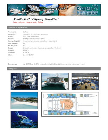 Nautitech 82 “Odyssey Mauritius” Luxury charter catamaran by Dufour informacje o jednostce Producent Jednostka Marina Rocznik Kabiny dla gości Koje dla gości WC dla gości Załoga Długość Szerokość Silniki Cena za noc fotografie Dufour Nautitech 82 – Odyssey Mauritius Port Louis – Mauritius 1997 (przebudowany w 2007) 8 podwójnych kabin z oddzielnymi łazienkami 16 10 3 (kapitan, steward–kucharz, pomocnik pokładowy) 25.00 m 10.00 m 2 x 130 CV/HP od €2.746 do €3.375 – w zależności od ilości osób i terminu rejsu (minimum 3 noce) Nautitech 82 “Odyssey Mauritius” Luxury charter catamaran by Dufour informacje dodatkowe Cena zawiera: Prywatny rejs i zakwaterowanie w 8 kabinach z oddzielnymi łazienkami Ubezpieczenie katamaranu i pasażerów Usługę załogi (kapitana, stewarda–kucharza, pomocnika pokładowego) Pełne wyżywienie: śniadanie, lunch i kolację Napoje (wino i napoje bezalkoholowe) Paliwo i wodę Dodatkowe wyposażenie dostępne dla gości: Kajak Zestaw do nurkowania ABC Sprzęt wędkarski Cena nie zawiera: Opłat klimatycznych, lokalnych, portowych i wstępów do Parków Narodowych Dodatkowych napojów i posiłków Korzystania z Internetu i telefonu Wycieczek rejsy z Charter Navigator Chcesz przeżyć przygodę życia? Poczuć adrenalinę, o jakiej nigdy Ci się nie śniło? A może planujesz zabrać rodzinę na urocze wakacje i leniwie sącząc drinki oglądać niezapomniane widoki? Możesz na nas liczyć! Zabierzemy Cię na morza i oceany od Chorwacji i Grecji przez Polinezję Francuską po Karaiby, Seszele Malediwy i Nową Kaledonię. Ty wybierasz miejsce, my zajmujemy się resztą. Od 14 lat czarterujemy jachty, katamarany, gulety, łodzie motorowe - szybko i solidnie. Żeglowanie z nami to niezapomniane wrażenia i świetna zabawa, bo robimy to z pasją. Zaufało nam już wielu. Nie zwlekaj z decyzją. Charter Navigator ul. Saska 4/104 30-720 Kraków tel.: +48 12 268 22 49 fax: +48 12 429 40 37 www.charternavigator.com [email protected]