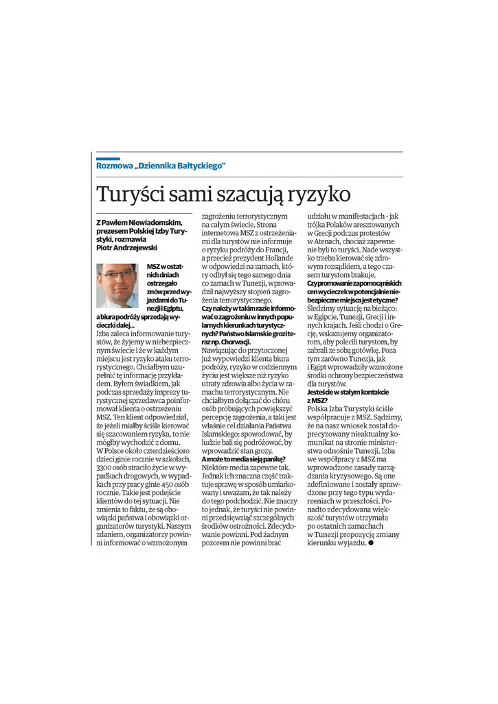 Rozmowa „Dziennika Bałtyckiego" Turyści sami szacują ryzyko Z Pawłem Niewiadomskim, prezesem Polskiej Izby Tury styki, rozmawia Piotr Andrzejewski MSZ wostat nich diliadi ostrzegało znów przed wy jazdami doTu nezji i Egiptu, a biura podróży sprzedają wy cieczki dalej... Izba zaleca informowanie tury stów, że żyjemy w niebezpiecz nym świecie i że w każdym miejscu jest ryzyko ataku terro rystycznego. Chciałbym uzu pełnić tę informację przykła dem. Byłem świadkiem, jak podczas sprzedaży imprezy tu rystycznej sprzedawca poinfor mował klienta o ostrzeżeniu MSZ. Ten klient odpowiedział, że jeżeli miałby ściśle kierować się szacowaniem ryzyka, to nie mógłby wychodzić z domu. W Polsce około czterdzieścioro dzieci ginie rocznie w szkołach, 3300 osóbstraciło życie w wy padkach drogowych, w wypad kach przy pracy ginie 450 osób rocznie. Takie jest podejście klientów do tej sytuacji. Nie zmienia to faktu, że są obo wiązki państwai obowiązki or ganizatorów turystyki. Naszym zdaniem, organizatorzy powin ni informować o wzmożonym zagrożeniu terrorystycznym na całym świecie. Strona internetowa MSZ z ostrzeżenia mi dla turystów nie informuje o ryzyku podróży do Francji, a przecież prezydent Hollande w odpowiedzi na zamach, któ ry odbył się tego samego dnia co zamach w Tunezji, wprowa dził najwyższystopień zagro żenia terrorystycznego. Czy należywtakim razie eiformować o zagrożeniu w feinydi popu larnych kierunkachturystycz nych? Państwo Islamskiegroziteraz np.Chorwacji. Nawiązując do przytoczonej już wypowiedzi klienta biura podróży, ryzyko w codziennym życiu jest większe niż ryzyko utraty zdrowiaalbo życia w za machu terrorystycznym. Nie chciałbym dołączać do chóru osób próbujących powiększyć percepcję zagrożenia, a taki jest właśnie celdziałania Państwa Islamskiego: spowodować, by ludzie balisię podróżować, by wprowadzić stan grozy. A może to media sieją panikę? Niektóre media zapewne tak. Jednak ich znaczna część trak tuje sprawę w sposób umiarko wany i uważam, że tak należy do tego podchodzić. Nie znaczy to jednak, że turyści nie powin ni przedsięwziąć szczególnych środków ostrożności. Zdecydo wanie powinni. Pod żadnym pozorem nie powinnibrać udziału w manifestacjach - jak trójka Polaków aresztowanych w Grecji podczas protestów w Atenach, chociaż zapewne nie byli to turyści. Nade wszyst ko trzeba kierować się zdro wym rozsądkiem, a tego cza sem turystom brakuje. Czy promowanie za pomocą niskich cen wycieczek w potencjalnie niebezpiecznemiejsca jest etyczne? Śledzimy sytuację na bieżąco: w Egipcie, Tunezji, Grecji i in nych krajach. Jeśli chodzi o Gre cję, wskazujemy organizato rom, aby polecili turystom, by zabrali ze sobą gotówkę. Poza tym zarówno Tunezja, jak i Egipt wprowadziły wzmożone środki ochronybezpieczeństwa dla turystów. Jesteście w stałym kontakcie z MSZ? Polska Izba Turystyki ściśle współpracuje z MSZ. Sądzimy, że na nasz wniosek został do precyzowany nieaktualny ko munikat na stronie minister stwa odnośnie Tunezji. Izba we współpracy z MSZ ma wprowadzone zasady zarzą dzania kryzysowego. Są one zdefiniowane i zostały spraw dzone przy tego typu wyda rzeniach w przeszłości. Po nadto zdecydowana więk szość turystów otrzymała po ostatnich zamachach w Tunezji propozycję zmiany kierunku wyjazdu.•