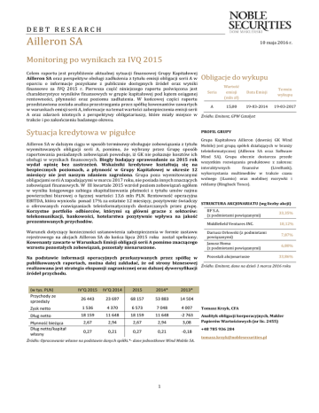 DEBT RESEARCH Ailleron SA 10 maja 2016 r. Monitoring po wynikach za IVQ 2015 Celem raportu jest przybliżenie aktualnej sytuacji finansowej Grupy Kapitałowej Ailleron SA oraz perspektyw obsługi zadłużenia z tytułu emisji obligacji serii A w Obligacje do wykupu oparciu o informacje pozyskane z publicznie dostępnych źródeł oraz wyniki Wartość finansowe za IVQ 2015 r. Pierwsza część niniejszego raportu poświęcona jest Seria emisji Data Emisji charakterystyce wyników finansowych w grupie kapitałowej pod kątem osiąganej (mln zł) rentowności, płynności oraz poziomu zadłużenia. W końcowej części raportu przedstawiona została analiza przestrzegania przez spółkę kowenantów zawartych A 15,00 19-03-2014 w warunkach emisji serii A, informacje na temat wartości zabezpieczenia emisji serii A oraz zdarzeń istotnych z perspektywy obligatariuszy, które miały miejsce w Źródło: Emitent, GPW Catalyst trakcie i po zakończeniu badanego okresu. Sytuacja kredytowa w pigułce Termin wykupu 19-03-2017 PROFIL GRUPY Ailleron SA w dalszym ciągu w sposób terminowy obsługuje zobowiązania z tytułu wyemitowanych obligacji serii A, pomimo, że wybrany przez Grupę sposób raportowania posiadanych zobowiązań powoduje, iż GK nie pokazuje kosztów ich obsługi w wynikach finansowych. Biegły badający sprawozdanie za 2015 rok wydał opinię bez zastrzeżeń. Wskaźniki kredytowe kształtują się na bezpiecznych poziomach, a płynność w Grupy Kapitałowej w okresie 12 miesięcy nie jest naszym zdaniem zagrożona. Grupa poza wyemitowanymi obligacjami serii A zapadającymi w marcu 2017 roku, nie posiada innych znaczących zobowiązań finansowych. W III kwartale 2015 wzrósł poziom zobowiązań ogółem w wyniku księgowego zabiegu skapitalizowania płatności z tytułu umów najmu powierzchni biurowej o łącznej wartości 13,6 mln PLN. Rentowność operacyjna EBITDA, która wyniosła ponad 17% za ostatnie 12 miesięcy, pozytywnie świadczy o oferowanych rozwiązaniach teleinformatycznych dostarczanych przez grupę. Korzystne portfolio odbiorców, którymi są główni gracze z sektorów: telekomunikacji, bankowości, hotelarstwa pozytywnie wpływa na jakość prezentowanych przychodów. Warunek dotyczący konieczności ustanowienia zabezpieczenia w formie zastawu rejestrowego na akcjach Ailleron SA do końca lipca 2015 roku został spełniony. Kowenanty zawarte w Warunkach Emisji obligacji serii A pomimo znaczącego wzrostu pozostałych zobowiązań, pozostały nienaruszone. Grupa Kapitałowa Ailleron (dawniej GK Wind Mobile) jest grupą spółek działających w branży teleinformatycznej (Ailleron SA oraz Software Mind SA). Grupa obecnie dostarcza przede wszystkim rozwiązania produktowe z zakresu: interaktywnych finansów (LiveBank), wykorzystania multimediów w trakcie czasu wolnego (iLumio) oraz mobilnej rozrywki i reklamy (Ringback Tones). STRUKTURA AKCJONARIATU (wg liczby akcji) IIF S.A. (z podmiotami powiązanymi) 33,35% Middlefield Ventures INC. 18,12% Dariusz Orłowski (z podmiotami powiązanymi) 7,87% Janusz Homa (z podmiotami powiązanymi) 6,80% Pozostali akcjonariusze 33,86% Na podstawie informacji operacyjnych przekazywanych przez spółkę w publikowanych raportach, można dalej zakładać, że od strony biznesowej Źródło: Emitent, dane na dzień 1 marca 2016 roku realizowana jest strategia ekspansji zagranicznej oraz dalszej dywersyfikacji źródeł przychodu. (w tys. PLN) Przychody ze sprzedaży IV’Q 2015 IV’Q 2014 2015 2014* 2013* 26 443 23 697 68 157 53 883 14 504 Zysk netto 1 536 4 370 6 573 7 048 4 007 Tomasz Krzyk, CFA Dług netto 18 159 11 648 18 159 11 648 -2 763 2,67 2,94 2,67 2,94 3,08 Analityk obligacji korporacyjnych, Makler Papierów Wartościowych (nr lic. 2455) 0,27 0,21 0,27 0,21 -0,18 Płynność bieżąca Dług netto/kapitał własny Źródło: Opracowanie własne na podstawie danych spółki.*- dane jednostkowe Wind Mobile SA. 1 +48 785 936 284 [email protected] DEBT RESEARCH Wyniki finansowe Poniżej przedstawiono wybrane dane finansowe Grupy Kapitałowej Ailleron SA zaprezentowane przez Emitenta po IVQ 2015 r. W zakresie prezentowanych wyników dokonano korekt o płacone odsetki z tytułu emisji obligacji. Tabela 1 Wyniki finansowe GK Ailleron w IVQ 2014 i 2015 roku. Rachunek zysków i strat [tys. zł] 01.10.15 01.10.15 01.10.14 - 31.12.15 - 31.12.15 (skorygowane) - 31.12.14 Przychody ze sprzedaży 26 443 26 443 23 697 23 697 11,6% Koszt własny sprzedaży 15 004 15 004 10 908 10 908 37,6% Zysk (strata) brutto ze sprzedaży 11 439 11 439 12 789 12 789 -10,6% Koszty sprzedaży 5 224 5 224 3 570 3 570 46,3% Koszty ogólnego zarządu 2 568 2 568 3 482 3 482 -26,2% -326 -326 205 205 -259,0% Zysk (strata) z działalności operacyjnej 3 321 3 321 5 942 5 942 -44,1% EBITDA 4 300 4 300 6 416 6 416 -33,0% 46 46 26 26 76,9% 434 719 161 474 51,7% Zysk (strata) brutto 2 933 2 648 5 807 5 494 -51,8% Podatek dochodowy 1 397 1 397 1 437 1 437 -2,8% Zysk (strata) netto 1 536 1 251 4 370 4 057 -69,2% Wynik na pozostałej działalności operacyjnej Przychody finansowe Koszty finansowe 01.10.14 Y-O-Y - 31.12.14 (skorygowane) (skorygowane) Źródło: Sprawozdanie finansowe Spółki. Korekty analityczne NS na podstawie dodatkowych danych publikowanych przez Emitenta. Przychody ze sprzedaży Grupy Wykres 1 Udział poszczególnych grup kosztów działalności Kapitałowej Ailleron SA wyniosły w IV operacyjnej oraz zysku na sprzedaży w przychodach GK Ailleron SA w kwartale 2015 r. ponad 26,4 mln PLN, okresie IVQ'14 - IVQ'15 co oznacza wzrost o ok. 11,6% w relacji r/r. Marża na sprzedaży w IV kwartale 100% 2015 r. była niższa niż w okresie 90% referencyjnym rok wcześniej i 80% wyniosła 13,8% (w IV Q 2014 było to 70% 24,2%). Wpływ na znaczącą obniżkę marży miał zarówno wpływ wyższych 60% niż rok wcześniej kosztów własnych 50% sprzedaży w relacji do przychodów 40% (wzrost o 10,7 p.p. względem 46% zanotowanych w IVQ 2014) oraz 30