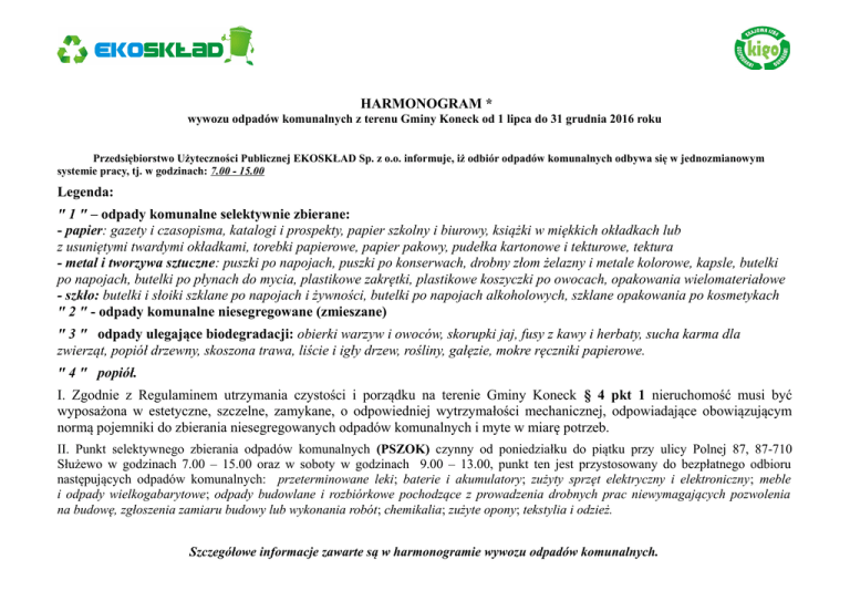HARMONOGRAM * wywozu odpadów komunalnych z terenu Gminy Koneck od 1 lipca do 31 grudnia 2016 roku Przedsiębiorstwo Użyteczności Publicznej EKOSKŁAD Sp. z o.o. informuje, iż odbiór odpadów komunalnych odbywa się w jednozmianowym systemie pracy, tj. w godzinach: 7.00 - 15.00 Legenda: " 1 " – odpady komunalne selektywnie zbierane: - papier: gazety i czasopisma, katalogi i prospekty, papier szkolny i biurowy, książki w miękkich okładkach lub z usuniętymi twardymi okładkami, torebki papierowe, papier pakowy, pudełka kartonowe i tekturowe, tektura - metal i tworzywa sztuczne: puszki po napojach, puszki po konserwach, drobny złom żelazny i metale kolorowe, kapsle, butelki po napojach, butelki po płynach do mycia, plastikowe zakrętki, plastikowe koszyczki po owocach, opakowania wielomateriałowe - szkło: butelki i słoiki szklane po napojach i żywności, butelki po napojach alkoholowych, szklane opakowania po kosmetykach " 2 " - odpady komunalne niesegregowane (zmieszane) " 3 " odpady ulegające biodegradacji: obierki warzyw i owoców, skorupki jaj, fusy z kawy i herbaty, sucha karma dla zwierząt, popiół drzewny, skoszona trawa, liście i igły drzew, rośliny, gałęzie, mokre ręczniki papierowe. " 4 " popiół. I. Zgodnie z Regulaminem utrzymania czystości i porządku na terenie Gminy Koneck § 4 pkt 1 nieruchomość musi być wyposażona w estetyczne, szczelne, zamykane, o odpowiedniej wytrzymałości mechanicznej, odpowiadające obowiązującym normą pojemniki do zbierania niesegregowanych odpadów komunalnych i myte w miarę potrzeb. II. Punkt selektywnego zbierania odpadów komunalnych (PSZOK) czynny od poniedziałku do piątku przy ulicy Polnej 87, 87-710 Służewo w godzinach 7.00 – 15.00 oraz w soboty w godzinach 9.00 – 13.00, punkt ten jest przystosowany do bezpłatnego odbioru następujących odpadów komunalnych: przeterminowane leki; baterie i akumulatory; zużyty sprzęt elektryczny i elektroniczny; meble i odpady wielkogabarytowe; odpady budowlane i rozbiórkowe pochodzące z prowadzenia drobnych prac niewymagających pozwolenia na budowę, zgłoszenia zamiaru budowy lub wykonania robót; chemikalia; zużyte opony; tekstylia i odzież. Szczegółowe informacje zawarte są w harmonogramie wywozu odpadów komunalnych. Szczegółowe terminy odbioru odpadów: Miejscowość – trasa przejazdu oraz rodzaj odbieranego odpadu Terminy odbioru odpadów 2016 r. 29 czerwca; 27 lipca; 24 sierpnia; 21 września; 19 października; 16 listopada; 14 grudnia; 30 czerwca; 28 lipca; 25 sierpnia; 22 września; 20 października; 17 listopada; 15 grudnia; 1 lipca; 29 lipca; 29 sierpnia; 23 września; 21 października; 18 listopada; 16 grudnia; 4 lipca; 1 sierpnia; 30 sierpnia; 26 września; 24 października; 21 listopada; 19 grudnia; 5 lipca; 2 sierpnia; 31 sierpnia; 27 września; 25 października; 22 listopada; 20 grudnia; 6 lipca; 3 sierpnia; 1 września; 28 września; 26 października; 23 listopada; 20 grudnia; 7 lipca; 4 sierpnia; 2 września; 29 września; 27 października; 24 listopada; 21 grudnia; 13 lipca; 10 sierpnia; 7 września; 5 października; 2 listopada; 30 listopada; 14 lipca; 11 sierpnia; 8 września; 6 października; 3 listopada; 1 grudnia; 15 lipca; 12 sierpnia; 9 września; 7 października; 4 listopada; 2 grudnia; 18 lipca; 16 sierpnia; 12 września; 10 października; 7 listopada; 5 grudnia; 19 lipca; 17 sierpnia; 13 września; 11 października; 8 listopada; 6 grudnia 20 lipca; 18 sierpnia; 14 września;12 października; 9 listopada; 7 grudnia; 21 lipca; 19 sierpnia; 15 września; 13 października; 10 listopada; 8 grudnia; - Zazdromin, Kolonia Straszewska, Rybno, Chromowola (1,2,3) - Straszewo, Zapustek, Wincentowo, Pomiany (1,2,3) - Kajetanowo, Żołnowo, Spoczynek, Jeziorno, Młynek (1,2,3) - Brzeźno, Kruszynek, Kruszynek Kolonia, Ossówka (1,2,3) - Romanowo, Święte, Opalanka, Kamieniec (1,2,3) - Koneck (1,2,3) - Koneck – centrum miejscowości (1,2,3) - Zazdromin, Kolonia Straszewska, Rybno, Chromowola (2,3,4) - Straszewo, Zapustek, Wincentowo, Pomiany (2,3,4) - Kajetanowo, Żołnowo, Spoczynek, Jeziorno, Młynek (2,3,4) - Brzeźno, Kruszynek, Kruszynek Kolonia, Ossówka (2,3,4) - Romanowo, Święte, Opalanka, Kamieniec (2,3,4) - Koneck (2,3,4) - Koneck – centrum miejscowości (2,3,4) * Niniejszy harmonogram może ulec zmianie z przyczyn nie wynikłych ze strony P.U.P. EKOSKŁAD Sp. z o. o. Sporządził: Zaopiniował: Andrzej Stefański Gerard Stolarski Kierownik Działu Zagospodarowania Odpadów Prezes Zarządu Przedsiębiorstwo Użyteczności Publicznej "EKOSKŁAD" Sp. z o. o. 87-710 Służewo, ul. Polna 87 tel. 54 282 02 45; e-mail [email protected] NIP 891 13 79 528 REGON 910329589