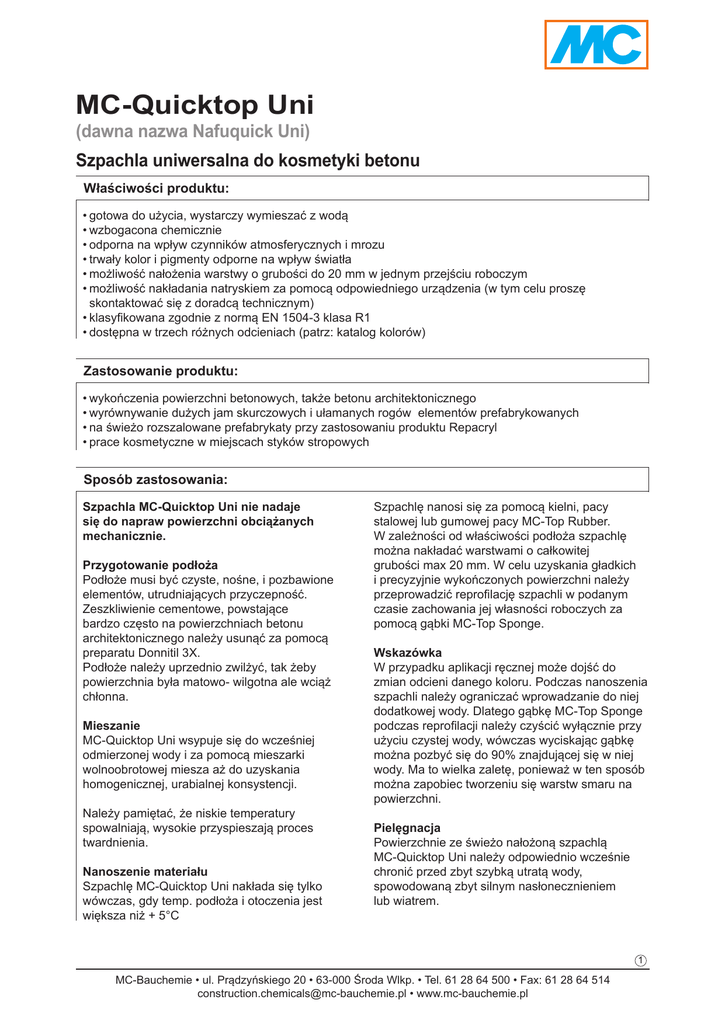 MC-Quicktop Uni (dawna nazwa Nafuquick Uni) Szpachla uniwersalna do kosmetyki betonu Właściwości produktu: •gotowa do użycia, wystarczy wymieszać z wodą •wzbogacona chemicznie •odporna na wpływ czynników atmosferycznych i mrozu •trwały kolor i pigmenty odporne na wpływ światła •możliwość nałożenia warstwy o grubości do 20 mm w jednym przejściu roboczym •możliwość nakładania natryskiem za pomocą odpowiedniego urządzenia (w tym celu proszę skontaktować się z doradcą technicznym) •klasyfikowana zgodnie z normą EN 1504-3 klasa R1 •dostępna w trzech różnych odcieniach (patrz: katalog kolorów) Zastosowanie produktu: •wykończenia powierzchni betonowych, także betonu architektonicznego •wyrównywanie dużych jam skurczowych i ułamanych rogów elementów prefabrykowanych •na świeżo rozszalowane prefabrykaty przy zastosowaniu produktu Repacryl •prace kosmetyczne w miejscach styków stropowych Sposób zastosowania: Szpachla MC-Quicktop Uni nie nadaje się do napraw powierzchni obciążanych mechanicznie. Przygotowanie podłoża Podłoże musi być czyste, nośne, i pozbawione elementów, utrudniających przyczepność. Zeszkliwienie cementowe, powstające bardzo często na powierzchniach betonu architektonicznego należy usunąć za pomocą preparatu Donnitil 3X. Podłoże należy uprzednio zwilżyć, tak żeby powierzchnia była matowo- wilgotna ale wciąż chłonna. Mieszanie MC-Quicktop Uni wsypuje się do wcześniej odmierzonej wody i za pomocą mieszarki wolnoobrotowej miesza aż do uzyskania homogenicznej, urabialnej konsystencji. Należy pamiętać, że niskie temperatury spowalniają, wysokie przyspieszają proces twardnienia. Nanoszenie materiału Szpachlę MC-Quicktop Uni nakłada się tylko wówczas, gdy temp. podłoża i otoczenia jest większa niż + 5°C Szpachlę nanosi się za pomocą kielni, pacy stalowej lub gumowej pacy MC-Top Rubber. W zależności od właściwości podłoża szpachlę można nakładać warstwami o całkowitej grubości max 20 mm. W celu uzyskania gładkich i precyzyjnie wykończonych powierzchni należy przeprowadzić reprofilację szpachli w podanym czasie zachowania jej własności roboczych za pomocą gąbki MC-Top Sponge. Wskazówka W przypadku aplikacji ręcznej może dojść do zmian odcieni danego koloru. Podczas nanoszenia szpachli należy ograniczać wprowadzanie do niej dodatkowej wody. Dlatego gąbkę MC-Top Sponge podczas reprofilacji należy czyścić wyłącznie przy użyciu czystej wody, wówczas wyciskając gąbkę można pozbyć się do 90% znajdującej się w niej wody. Ma to wielka zaletę, ponieważ w ten sposób można zapobiec tworzeniu się warstw smaru na powierzchni. Pielęgnacja Powierzchnie ze świeżo nałożoną szpachlą MC-Quicktop Uni należy odpowiednio wcześnie chronić przed zbyt szybką utratą wody, spowodowaną zbyt silnym nasłonecznieniem lub wiatrem. 1 MC-Bauchemie • ul. Prądzyńskiego 20 • 63-000 Środa Wlkp. • Tel. 61 28 64 500 • Fax: 61 28 64 514 [email protected] • www.mc-bauchemie.pl Techniczne właściwości produktu MC-Quicktop Uni: Parametr Jednostka miary Wartość Uwagi Barwa szary w kolorze cementu, szary w kolorze betonu, Zobacz katalog kolorów średnio-szary Grubość warstwy mm 20 maksymalnie Czas zachowania własności roboczych min. ok.30 przy temp. + 20°C Zalecane warunki podczas stosowania ° C od +5 do + 30 minimalna temp. Zużycie na 1mm grubości warstwy kg/m² 1,4 Ilość wody na worek 25 kg l 8,0-8,5 Wytrzymałość na rozciąganie przy zginaniu po 1 dniu po 28 dniach N/mm² 0,7 ok. 3,0 Przy temp. powietrza 23°C i wilgotności względnej 50% Wytrzymałość na ściskanie po 1 dniu po 28 dniach N/mm² ok.1,5 ok. 13,0 Przy temp. powietrza 23°C i wilgotności względnej 50% - Właściwości produktu MC-Quicktop Uni: Zakładowa Kontrola Produkcji wg ISO 9001:2008/ EN 1504-3 oraz EN 1504-8 Warunki przechowywania Przechowywać w suchym miejscu w oryginalnie zamkniętym opakowaniu przez okres 12 miesięcy, chronić przed przemarzaniem Sposób dostawy worek 25 kg 1 paleta (42 worki po 25 kg) Usuwanie odpadów W trosce o środowisko naturalne opakowania należy dokładnie opróżniać. Podane informacje, dotyczące właściwości produktu są wynikiem badań laboratoryjnych i mogą różnić się w praktyce. Właściwe zastosowanie musi być ściśle określone na podstawie badań kontrolnych przeprowadzonych w warunkach oczekiwanych w miejscu zastosowania. Uwaga! Wszelkie informacje zawarte w niniejszej karcie oparte są na naszym doświadczeniu i najlepszej wiedzy, jednakże nie mogą być traktowane jako prawnie wiążące. Należy bezwzględnie każdorazowo stosować się do prawodawstwa miejscowego, w zakresie przeznaczenia oraz zastosowania w obiektach budowlanych. Przy spełnieniu powyższych wymogów odpowiadamy za poprawność przekazanych informacji w ramach naszych Ogólnych Warunków Sprzedaży, Dostaw i Płatności. Wszelkie doradztwo ze strony naszych Współpracowników, odbiegające od treści naszych kart technicznych, jest wiążące jedynie w przypadku pisemnego ich potwierdzenia. W każdym przypadku należy stosować się do ogólnie obowiązujących zasad sztuki budowlanej. Wydanie 09/14. Niniejszy druk został zaktualizowany pod względem technicznym. Tym samym unieważnia się dotychczasowe wydania i nie wolno ich stosować. W przypadku wydania nowej karty, zaktualizowanej pod względem technicznym, niniejsze wydanie traci ważność. MC-Bauchemie • ul. Prądzyńskiego 20 • 63-000 Środa Wlkp. • Tel. 61 28 64 500 • Fax: 61 28 64 514 [email protected] • www.mc-bauchemie.pl 2