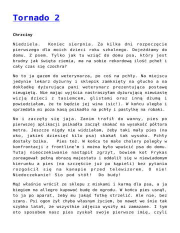 Tornado 2 Chrzciny Niedziela. Koniec sierpnia. Za kilka dni rozpoczęcie pierwszego dla moich dzieci roku szkolnego. Dojeżdżamy do domu. Z psem. Tylko jak tu wziąć do domu psa, który jest brudny jak święta ziemia, ma na sobie rekordową ilość pcheł i cały czas się czochra? No to ja gazem do weterynarza, po coś na pchły. Na miejscu jedynie lekarz dyżurny i sklepik zamknięty na głucho a na dokładkę dyżurująca pani weterynarz prezentująca postawę nieugiętą. Nie mając wyjścia nastraszyłam dyżurującą niewiastę wizją dzieci z tasiemcem, glistami oraz inną dżumą i powiedziałam, że to będzie jej wina (sic!). W końcu uległa i sprzedała mi poza kasą psikadło na pchły i pastylkę na robaki. No i zaczęły się jaja. Zanim trafił do wanny, pies po pierwszej aplikacji psikadła zaczął skakać na wysokość półtora metra. Jeszcze nigdy nie widziałam, żeby taki mały pies (na oko, jakieś dziesięć kilo psa) skakał tak wysoko. Pchły dostały bzika. Pies też. W końcu te małe cholery poległy w konfrontacji z frontline’m i można było wpuścić psa do domu. Tutaj nieoczekiwanie nastąpił zgrzyt, bowiem kot Frykas zareagował pełną kierunku a pies rozgościł się Niedoczekanie! obrazą majestatu i oddalił się w niewiadomym (na szczęście już po kąpieli) bez pytania na kanapie przed telewizorem. O nie! Sio pod stół! Do budy! Mąż właśnie wrócił ze sklepu z miskami i karmą dla psa, a ja biegiem na allegro kupować budę do ogrodu. W końcu pies usnął, to ja po aparat, żeby mu jakąś fotkę strzelić. Ale nie, bez szans. Psi ogon żył chyba własnym życiem, bo nawet we śnie tak szybko latał, że wszystkie zdjęcia wyszły mi zamazane. I tym oto sposobem nasz pies zyskał swoje pierwsze imię, czyli Wiatrak i nareszcie można go było przedstawić sąsiadom. Wiatrak spisał się na medal i pokazał się z jak najlepszej strony. Oczywiście gad jeden w pięć minut zyskał sobie sympatię, a sąsiedzi zaproponowali, że tego psa trzeba jakoś oblać- w sensie uczcić- i tak w dzień przyjazdu zmontowała się radosna sąsiedzka imprezka z okazji przybycia czworonoga oraz jego chrzcin. Było miło, Wiatrak wykazał się talentem showmana i wdzięczył się jak w cyrku ale niestety nie wszystko poszło gładko, bo około północy sąsiad poddał w wątpliwość, czy to imię aby odpowiednie. No i kaplica. Mąż po przemyśleniu tematu stwierdził, że nie będzie chodził wokół domu i jak kretyn wołał: „Wiatrak! Wiatrak! Do nogi! Frykas! Do domu! Kici kici! Wiatrak!” cdn