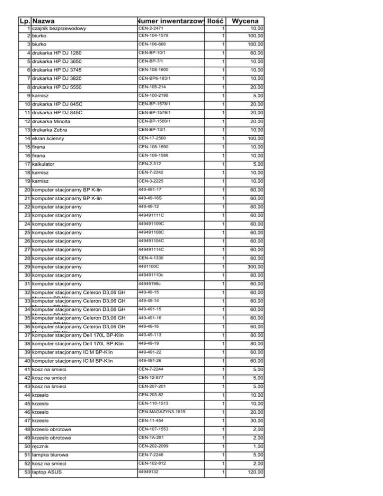 Lp. Nazwa Numer inwentarzowyIlość Wycena 1 czajnik bezprzewodowy CEN-2-2471 1 10,00 2 biurko CEN-104-1578 1 100,00 3 biurko CEN-106-660 1 100,00 4 drukarka HP DJ 1280 CEN-BP-10/1 1 60,00 5 drukarka HP DJ 3650 CEN-BP-7/1 1 10,00 6 drukarka HP DJ 3745 CEN-108-1600 1 10,00 7 drukarka HP DJ 3820 CEN-BP6-183/1 1 10,00 8 drukarka HP DJ 5550 CEN-105-214 1 20,00 9 karnisz CEN-100-2198 1 5,00 10 drukarka HP DJ 845C CEN-BP-1578/1 1 20,00 11 drukarka HP DJ 845C CEN-BP-1579/1 1 20,00 12 drukarka Minolta CEN-BP-1580/1 1 20,00 13 drukarka Zebra CEN-BP-13/1 1 10,00 14 ekran ścienny CEN-17-2560 1 100,00 15 firana CEN-108-1590 1 10,00 16 firana CEN-108-1588 1 10,00 17 kalkulator CEN-2-312 1 5,00 18 karnisz CEN-7-2242 1 10,00 19 karnisz CEN-3-2225 1 10,00 20 komputer stacjonarny BP K-lin 449-491-17 1 60,00 21 komputer stacjonarny BP K-lin 449-49-16S 1 60,00 22 komputer stacjonarny 449-49-12 1 60,00 23 komputer stacjonarny 449491111C 1 60,00 24 komputer stacjonarny 449491109C 1 60,00 25 komputer stacjonarny 449491108C 1 60,00 26 komputer stacjonarny 449491104C 1 60,00 27 komputer stacjonarny 449491114C 1 60,00 28 komputer stacjonarny CEN-4-1330 1 60,00 29 komputer stacjonarny 4491100C 1 300,00 30 komputer stacjonarny 449491110c 1 60,00 31 komputer stacjonarny 44949198c 1 60,00 32 komputer stacjonarny Celeron D3,06 GH Mustang BP Klin 33 komputer stacjonarny Celeron D3,06 GH Mustang BP Klin 34 komputer stacjonarny Celeron D3,06 GH Mustang BP Klin 35 komputer stacjonarny Celeron D3,06 GH Mustang BP Klin 36 komputer stacjonarny Celeron D3,06 GH Mustang BP Klin 37 komputer stacjonarny Dell 170L BP-Klin 449-49-15 1 60,00 449-49-14 1 60,00 449-491-15 1 60,00 449-491-16 1 60,00 449-49-16 1 60,00 449-49-113 1 80,00 38 komputer stacjonarny Dell 170L BP-Klin 449-49-19 1 80,00 39 komputer stacjonarny ICIM BP-Klin 449-491-22 1 60,00 40 komputer stacjonarny ICIM BP-Klin 449-491-26 1 60,00 41 kosz na smieci CEN-7-2244 1 5,00 42 kosz na smieci CEN-12-877 1 5,00 43 kosz na śmieci CEN-207-201 1 5,00 44 krzesło CEN-203-82 1 10,00 45 krzesło CEN-110-1513 1 10,00 46 krzesło CEN-MAGAZYN3-1819 1 20,00 47 krzesło CEN-11-454 1 30,00 48 krzesło obrotowe CEN-107-1553 1 2,00 49 krzesło obrotowe CEN-1A-281 1 2,00 50 ręcznik CEN-202-2099 1 1,00 51 lampka biurowa CEN-7-2246 1 5,00 52 kosz na smieci CEN-102-812 1 2,00 53 laptop ASUS 44949132 1 120,00 54 laptop Toshiba CEN-100-2447 1 120,00 55 listwa przyścienna CEN-7-263 1 10,00 56 lustro CEN-WC2-764 1 5,00 57 lustro CEN-7-2238 1 5,00 58 mata podłogowa z kolcami CEN-104-2328 1 1,00 59 mata z kolcami CEN-2-2209 1 1,00 60 mata z kolcami CEN-2-2208 1 1,00 61 mata z kolcami CEN-3-2615 1 1,00 62 mata z kolcami CEN-7-2243 1 1,00 63 mata z kolcami CEN-102-2328 1 1,00 64 narzuta CEN-203-2377 1 10,00 65 pojemnik na mydło CEN-205-151 1 5,00 66 prezenter CEN-107-2537 1 10,00 67 stojak CEN-3-2228 1 10,00 68 stół/biurko CEN-102-809 1 100,00 69 szafka CEN-7-265 1 50,00 70 telefon bezprzewodowy CEN-101-1884 1 20,00 71 telefon nokia CEN-1-1807 1 1,00 72 telefon Panasonic CEB-1A-1806 1 1,00 73 kosz na śmieci CEN-100-2202 1 2,00 74 telewizor DMQ CEN-207-144 1 50,00 75 UPS CEN-BP-1279/1 1 10,00 76 UPS CEN-BP-23/1 1 10,00 77 wieszak CEN-KOTŁOWNIA-1751 1 10,00 78 wieszak CEN-7-260 1 10,00 79 UPS CEN-BP-413/1 1 10,00 80 komputer stacjonarny 4494914Sz 1 60,00 81 UPS CEN-110-2182 1 10,00 82 telefon bezprzewodowy CEN-104-861 1 5,00 83 lada biblioteczna CEN-9-416 1 150,00 84 telefax CEN-1-1795 1 200,00 85 czajnik bezprzewodowy CEN-BP3-387/1 1 10,00 86 kalkulator CEN-BP3-402/1 1 8,00 87 telefon CEN-BP3-404/1 1 1,00 88 telefon CEN-BP3-389/1 1 10,00 89 regał CEN-9-1089 1 200,00 90 regał CEN-9-425 1 50,00 91 komputer 4-49-491-3 1 60,00 92 komputer 4-49-491-4 1 60,00 93 komputer 4-49-491-6 1 60,00