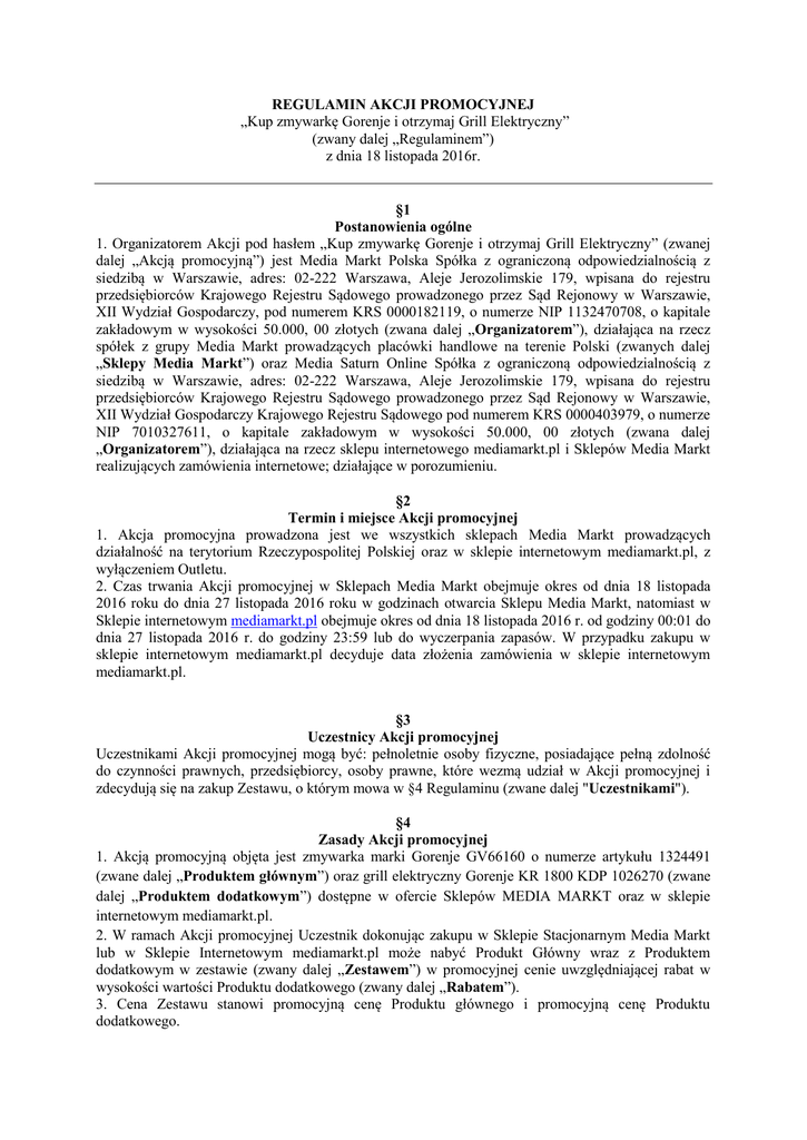 REGULAMIN AKCJI PROMOCYJNEJ „Kup zmywarkę Gorenje i otrzymaj Grill Elektryczny” (zwany dalej „Regulaminem”) z dnia 18 listopada 2016r. §1 Postanowienia ogólne 1. Organizatorem Akcji pod hasłem „Kup zmywarkę Gorenje i otrzymaj Grill Elektryczny” (zwanej dalej „Akcją promocyjną”) jest Media Markt Polska Spółka z ograniczoną odpowiedzialnością z siedzibą w Warszawie, adres: 02-222 Warszawa, Aleje Jerozolimskie 179, wpisana do rejestru przedsiębiorców Krajowego Rejestru Sądowego prowadzonego przez Sąd Rejonowy w Warszawie, XII Wydział Gospodarczy, pod numerem KRS 0000182119, o numerze NIP 1132470708, o kapitale zakładowym w wysokości 50.000, 00 złotych (zwana dalej „Organizatorem”), działająca na rzecz spółek z grupy Media Markt prowadzących placówki handlowe na terenie Polski (zwanych dalej „Sklepy Media Markt”) oraz Media Saturn Online Spółka z ograniczoną odpowiedzialnością z siedzibą w Warszawie, adres: 02-222 Warszawa, Aleje Jerozolimskie 179, wpisana do rejestru przedsiębiorców Krajowego Rejestru Sądowego prowadzonego przez Sąd Rejonowy w Warszawie, XII Wydział Gospodarczy Krajowego Rejestru Sądowego pod numerem KRS 0000403979, o numerze NIP 7010327611, o kapitale zakładowym w wysokości 50.000, 00 złotych (zwana dalej „Organizatorem”), działająca na rzecz sklepu internetowego mediamarkt.pl i Sklepów Media Markt realizujących zamówienia internetowe; działające w porozumieniu. §2 Termin i miejsce Akcji promocyjnej 1. Akcja promocyjna prowadzona jest we wszystkich sklepach Media Markt prowadzących działalność na terytorium Rzeczypospolitej Polskiej oraz w sklepie internetowym mediamarkt.pl, z wyłączeniem Outletu. 2. Czas trwania Akcji promocyjnej w Sklepach Media Markt obejmuje okres od dnia 18 listopada 2016 roku do dnia 27 listopada 2016 roku w godzinach otwarcia Sklepu Media Markt, natomiast w Sklepie internetowym mediamarkt.pl obejmuje okres od dnia 18 listopada 2016 r. od godziny 00:01 do dnia 27 listopada 2016 r. do godziny 23:59 lub do wyczerpania zapasów. W przypadku zakupu w sklepie internetowym mediamarkt.pl decyduje data złożenia zamówienia w sklepie internetowym mediamarkt.pl. §3 Uczestnicy Akcji promocyjnej Uczestnikami Akcji promocyjnej mogą być: pełnoletnie osoby fizyczne, posiadające pełną zdolność do czynności prawnych, przedsiębiorcy, osoby prawne, które wezmą udział w Akcji promocyjnej i zdecydują się na zakup Zestawu, o którym mowa w §4 Regulaminu (zwane dalej "Uczestnikami"). §4 Zasady Akcji promocyjnej 1. Akcją promocyjną objęta jest zmywarka marki Gorenje GV66160 o numerze artykułu 1324491 (zwane dalej „Produktem głównym”) oraz grill elektryczny Gorenje KR 1800 KDP 1026270 (zwane dalej „Produktem dodatkowym”) dostępne w ofercie Sklepów MEDIA MARKT oraz w sklepie internetowym mediamarkt.pl. 2. W ramach Akcji promocyjnej Uczestnik dokonując zakupu w Sklepie Stacjonarnym Media Markt lub w Sklepie Internetowym mediamarkt.pl może nabyć Produkt Główny wraz z Produktem dodatkowym w zestawie (zwany dalej „Zestawem”) w promocyjnej cenie uwzględniającej rabat w wysokości wartości Produktu dodatkowego (zwany dalej „Rabatem”). 3. Cena Zestawu stanowi promocyjną cenę Produktu głównego i promocyjną cenę Produktu dodatkowego. 4. Uczestnik może brać udział w Akcji promocyjnej wielokrotnie pod warunkiem spełnienia warunków przewidzianych w Regulaminie. 5. W przypadku zakupu w sklepie internetowym mediamarkt.pl o zakupie Zestawu w promocyjnej cenie decyduje data złożenia zamówienia. 6. Uczestnikom nie przysługuje prawo do zastrzeżenia szczególnych cech Zestawów objętych Akcją promocyjną. 7. Rabat odliczany jest od ceny brutto towaru i będzie naliczany jednorazowo. Rabaty nie mogą być dzielone. 8. Uczestnikom Akcji promocyjnej nie przysługuje prawo do otrzymania ekwiwalentu pieniężnego w wysokości Rabatu. 9. Akcja promocyjna nie może być łączona z kodami rabatowymi otrzymanymi w ramach programu Konto Premium ale może być łączona z innymi Akcjami promocyjnymi. §5 Odpowiedzialność 1. Odpowiedzialność Organizatora wobec Uczestnika z tytułu roszczeń związanych z uprawnieniami przyznanymi Uczestnikowi w Regulaminie ograniczona jest do ceny Zestawu w trakcie Akcji promocyjnej, którego to produktu roszczenie dotyczy. 2. Powyższe ograniczenie nie wyłącza uprawnień przyznanych Uczestnikom na mocy odrębnych przepisów prawnych. §6 Reklamacje i wymiana towarów 1.Reklamacje Uczestników dotyczące sposobu przeprowadzenia Akcji promocyjnej powinny być zgłaszane w trakcie trwania Akcji promocyjnej oraz przez 21 (dwadzieścia jeden) dni od jej zakończenia w Sklepie Media Markt, w którym Uczestnik dokonał zakupu Zestawu, lub pod adresem email: [email protected] z tematem wiadomości "Reklamacja – Kup zmywarkę Gorenje i otrzymaj Grill Elektryczny”, telefonicznie lub za pośrednictwem drogi elektronicznej w zależności od formy, w jakiej Uczestnik złożył reklamację. Po wyczerpaniu postępowania reklamacyjnego Uczestnik jest uprawniony do dochodzenia swoich roszczeń na drodze postępowania sądowego. 2. Reklamacje składane w formie pisemnej w Sklepie MEDIA MARKT, w którym dokonano zakupu Zestawu powinny zawierać dopisek „Kup zmywarkę Gorenje i otrzymaj Grill Elektryczny” oraz powinny zawierać imię i nazwisko Uczestnika, Jego adres zamieszkania, kopię dowodu zakupu oraz dokładny opis stanu faktycznego będącego przyczyną złożenia reklamacji. 3. Postępowanie reklamacyjne, o którym mowa w §6 ust. 1 i 2 Regulaminu, trwa 14 (czternaście) dni od daty wpłynięcia reklamacji. Uczestnik zostanie powiadomiony o rozpatrzeniu reklamacji przez Organizatora listem poleconym wysłanym na adres wskazany przez Uczestnika, telefonicznie lub za pośrednictwem drogi elektronicznej w zależności od formy, w jakiej Uczestnik złożył reklamację. Po wyczerpaniu postępowania reklamacyjnego Uczestni