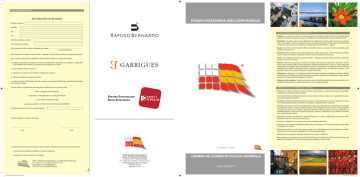 DECLARACIÓN DE AFILIADO DECLARACIÓN DE AFILIADO POLSKO-HISZPAŃSKA IZBA GOSPODARCZA Nombre de empresa: Dirección: Tel.: ¿QUÉ OFRECEMOS A LAS EMPRESAS MIEMBROS? Fax: •Contactos. Les ponemos en contacto con especialistas que les faciliten una entrada eficaz en el mercado polaco (estudios de mercado, consultorías, servicios de contabilidad, asesoramiento jurídico, agencias inmobiliarias etc.) Nombre y apellido de la persona •Información. En la página web y en nuestra Oficina ofrecemos información económica, jurídica, financiera y de mercado, acceso a currículums y ofertas de cooperación mutua. Les ponemos al corriente de toda clase de acontecimientos y eventos tanto económicos como culturales que se desarrollen en el ámbito polaco – español. representante de la empresa: Por la presente me dirijo a ustedes solicitándoles que acepten .............................................................................. (nombre de empresa) •Ayudas. Les ofrecemos nuestro centro de oficinas, traductores, becarios -convenios con varias universidades, bolsa de trabajo (currículums), etc. como miembro de la Cámara de Comercio Polaco – Española. Al mismo tiempo declaro que la empresa representada •Descuentos dentro del Programa para Empresas Miembros. Hoteles, traducciones, servicio de conferencias, billetes de avión, alquiler de vehículos, restaurantes, telefonía y muchas más ofertas con descuentos. por mi promete cumplir todas las obligaciones como miembro, incluidas en el Estatuto de la Cámara: •Eventos. Con el objetivo de estrechar la cooperación polaco – española organizamos misiones comerciales, seminarios, encuentros, ferias y otros eventos. 1) respetar las decisiones del Estatuto de la Cámara, los reglamentos y resoluciones de sus órganos, el Código Ético de los Miembros de la Cámara y las resoluciones de los órganos de la Cámara •Difusión. Facilitamos la promoción de su empresa en Polonia, procurando que la oferta de sus productos y servicios llegue al mayor número posible de clientes potenciales. Publicamos gratuitamente sus datos en nuestra página web www.phig.pl y en la página web del Departmento Económico y Comercial de la Embajada de Polonia en Madrid. Mediante nuestro folleto la información sobre las empresas miembros llega a las instituciones oficiales y a los potenciales socios en las reuniones de negocios y misiones comerciales. 2) cuidar el buen nombre de la Cámara; 3) participar en la realización de los objetivos estatuarios de la Cámara; •Colaboración. Colaboramos con la Embajada de España en Varsovia, Embajada de la República de Polonia en Madrid, Consulado General de Polonia en Barcelona, estructuras comerciales de representaciones diplomáticas, Cámara Nacional de Comercio, Cámaras Industriales regionales y sectoriales. 4) efectuar puntualmente los pagos de afiliación: •Encuentros de los miembros. Durante los encuentros nuestros miembros comparten experiencias adquiridas en los mercados de ambos países y se ayudan mutuamente a resolver problemas prácticos. La cuota de inscripción 500 PLN (quinientos PLN), así como la cuota anual de 2500 PLN (dos mil quinientos PLN) pagada a la cuenta de la Cámara. Por favor, hagan la transferencia en euros aplicando el cambio del día, a la siguiente cuenta: LOS BENEFICIOS DE SER MIEMBRO DE LA CÁMARA: •Participación en ferias, seminarios, misiones a Polonia y otros eventos de carácter promocional con posibilidad de obtener una restitución parcial de los gastos. Polsko – Hiszpańska Izba Gospodarcza Kredyt Bank S.A. VIII Oddział, filia nr 1 w Warszawie, Poland Partner Strategiczny Socio Estratégico 57 1500 1878 1218 7006 4265 0000 •En el caso de demanda individual organizamos misiones del sector concreto, también con la posibilidad de obtener una restitución parcial de los gastos. •Posibilidad de obtener gratuitamente información profesional relacionada con temas como el registro de la empresa en el mercado español y polaco, certificación de los productos, legislación laboral, exportación. no. internacional IBAN: PL 57 1500 1878 1218 7006 4265 0000 KRDBPLPW •Promoción de Su Empresa entre los socios potenciales a través de la publicación de la presentación de la Empresa en el Folleto de la Cámara, enviado a las oficinas comerciales de las Embajadas de España y Polonia, Cámaras regionales y sectoriales de ambos países y todas las instituciones oficiales de Polonia y España con las que colaboramos, así distribuido durante el transcurso de reuniones de negocios, seminarios, conferencias, ferias y misiones comerciales, en las cuales participa la Cámara. La información sobre la Cámara fue proporcionada por •Posibilidad de obtener las publicaciones gratuitas bilingües de la Cámara y publicaciones enviadas por varias instituciones, entre otros, por los Ministerios polacos. Nombre y apellido de la persona responsable •Invitaciones a participar en los encuentros y las misiones comerciales de Polonia. ..................................................... ..................................................... Fecha Firma •Participación en el Programa del Miembro, que ofrece más de cien ofertas con descuentos (reglamento y lista de ofertas en la página de la Cámara). •Reconocimiento oficial por parte de los órganos de poder y de la administración estatal, las organizaciones sociales y económicas como una empresa colaboradora con el mercado polaco/español. •Participación en la organización económica internacional, que apoye a su Empresa. •Representación de los intereses de los miembros de la Cámara en el campo de su actividad económica frente a los órganos de la administración central y local y organismos nacionales e internacionales. La aceptación como miembro de la Cámara se efectúa en base a la decisión del Consejo de la Cámara después de: Fundada en 2000 • la presentación de declaración de afiliado, así como d