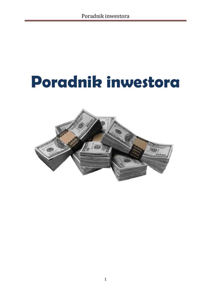 Poradnik inwestora Poradnik inwestora 1 Poradnik inwestora Inwestycja to przeznaczenie pewnej części środków finansowych na realizację pomysłów, które w przyszłości przyniosą zysk. Inwestowanie jest działaniem aktywnym, które go celem jest podniesienie wartości wniesionego kapitału, osiągnięcie zysku. Działanie te mogą jednak przynosić straty, więc są ryzykowne. Oszczędzanie to zabezpieczenie pewnego nadmiaru środków finansowych i czerpanie z tego tytułu korzyści w formie głównie odsetek, jest czynnością bierną. W oszczędzaniu nie występuje ryzyko. Przykładem są lokaty w banku. Do sposobów inwestowania zaliczamy : Metale, kamienie szlachetne i biżuteria Akcje Obligacje Kontrakty terminowe Opcje Metale, kamienie szlachetne i biżuteria Przez setki lat najpopularniejszym sposobem oszczędzania było zakopywanie zgromadzonych kosztowności, a najczęściej gromadzonym dobrem było złoto. Nie dość, że łatwo je przetopić, to jeszcze może poleżeć w ziemi dowolnie długi czas, nie tracąc nic ze swoich właściwości. Dlatego też obecnie, ten szlachetny metal wciąż jest dla wielu firm, a nawet państw, ważnym sposobem inwestowania. Na rynku można kupić np. złote monety czy sztabki złota. Złoto uważane jest za „najtwardszą walutę”, co oznacza, że w sytuacjach ryzyka gospodarczego, kryzysu, sięgają po nią państwa i bogaci inwestorzy. Złoto drożeje, gdy sytuacja na świecie jest niepewna, panuje kryzys, a także w trakcie wojen. Oprócz złota, popularnością cieszy się platyna, rzadziej srebro. Obecnie jest to mało popularna forma inwestowania, polecana jedynie dla bogatszych inwestorów i na dłuższy czas – kilku, a nawet kilkunastu lat. 2 Poradnik inwestora Akcje Akcja jest instrumentem finansowym, który jest emitowany przez podmiot zwany spółką akcyjną. Nabywca akcji zwany jest akcjonariuszem. Jest on współwłaścicielem spółki akcyjnej. Nabywając akcje spółki, akcjonariusz uzyskuje pewne prawa. Najważniejsze prawa, które otrzymuje akcjonariusz, są następujące: - prawo głosu, - prawo do dywidendy, inaczej prawo do udziału w zyskach spółki, - prawo do udziału w masie likwidacyjnej, - prawo poboru, czyli prawo do zakupu akcji nowej emisji. Akcja spółki charakteryzowana jest przez pewną liczbę wskaźników. Do najważniejszych wskaźników zaliczamy następujące: - kapitał akcyjny - wartość nominalna - wartość emisyjna - wartość księgowa - wartość rynkowa - zysk przypadający na jedną akcje - dywidenda przypadająca na jedną akcje - wskaźnik cena/zysk - stopa dywidendy - wskaźnik cena/wartość księgowa - wskaźnik wypłaty - wskaźnik zatrzymania - wskaźnik pokrycia. 3 Poradnik inwestora Akcję mogą mieć formę na okaziciela lub imienną – wtedy w swej treści zawierają imię i nazwisko akcjonariuszy. Inną możliwą klasyfikacją akcji jest ich podział na akcje zwykłe i uprzywilejowane. Uprzywilejowanie akcji może przejawiać się na przykład posiadaniem uprawnienia do głosowania większą liczbą głosów na walnym zgromadzeniu akcjonariuszy niż posiadacze akcji zwykłych (na jedną akcję uprzywilejowaną mogą przypadać co najwyżej dwa głosy). Należy jednak pamiętać, że w przypadku spółek dopuszczonych do obrotu na rynku regulowanym takie uprzywilejowanie w ramach obowiązujących obecnie regulacji już nie obowiązuje. Innym przejawem uprzywilejowania akcji jest przypisane do nich np. prawo do otrzymania większej dywidendy niż pozostali akcjonariusze spółki – rzadko jednak spotykane na polskim rynku kapitałowym. Cechą charakterystyczną akcji jest również to, że w przeciwieństwie do obligacji, które są emitowane na czas określony, akcje są emitowane na czas nieokreślony, a dokładnie rzecz biorąc do momentu zaprzestania działalności przez spółkę. Obligacje Obligacja jest to instrument finansowy (a jednocześnie również papier wartościowy), którego emitent jest dłużnikiem obligatariusza (posiadacza obligacji) i który zobowiązuje się wobec niego do świadczenia, polegającego na określonych płatnościach odsetek i wykupie obligacji. Podstawowe charakterystyki obligacji: - wartość nominalna – jest to wartość, od której nalicza się odsetki, która jest płacona w momencie wykupu przez emitenta posiadaczowi obligacji; - termin wykupu – jest to termin, w którym obligatariusza otrzymuje od emitenta kwotę równą wartości nominalnej; w terminie wykupu obligacje podlega wykupowi; - oprocentowanie (inaczej stopa kuponów) – stopa procentowa określająca wielkość odsetek wypłacanych obligatariuszowi; terminy płacenia odsetek inaczej częstotliwość wypłacania odsetek, która wynosi zazwyczaj raz w roku, raz na pół roku bądź raz na kwartał; - cena emisyjna – jest to cena, po której obligacja jest sprzedawana jej pierwszemu posiadaczowi w momencie emisji; 4 Poradnik inwestora W zależności od tego, w jaki sposób określony zostanie sposób i częstotliwość wypłaty zysku z obligacji w postaci kuponu, obligacje, możemy podzielić na trzy rodzaje: - obligacje zerokuponowe, gdzie w momencie zakupu inwestor kupuje obligacje z dyskontem tzn. w momencie zakupu płaci za nią cenę niższą od jej wartości nominalnej a w momencie jej wykupu otrzymuje kwotę równą wartości nominalnej takiej obligacji. - obligacja o stałym oprocentowaniu, gdzie inwestor z góry wie jaką kwotę odsetek otrzyma w okresie, w którym będzie trzymał kupione przez siebie obligacje do momentu ich wykupu przez emitenta. - obligacja o zmiennym oprocentowaniu, gdzie wysokość oprocentowania (wielkość kuponu odsetkowego) może być uzależniona np. od stopy inflacji lub od poziomu wskazanej rynkowej stopy procentowej. Kontrakty terminowe Kontrakt terminowy jest to zobowiązanie dwóch stron do zrealizowania transakcji kupna – sprzedaży pewnej ilości instrumentu podstawowego po określonej cenie w ustalonym terminie. Kont