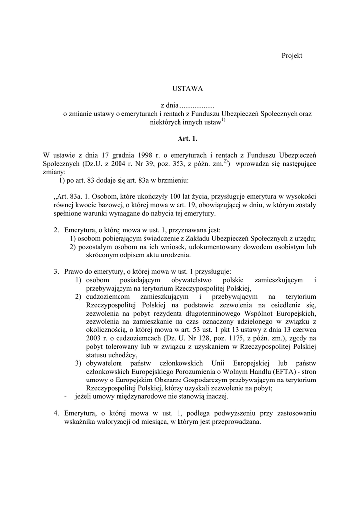 Projekt USTAWA z dnia.................... o zmianie ustawy o emeryturach i rentach z Funduszu Ubezpieczeń Społecznych oraz niektórych innych ustaw1) Art. 1. W ustawie z dnia 17 grudnia 1998 r. o emeryturach i rentach z Funduszu Ubezpieczeń Społecznych (Dz.U. z 2004 r. Nr 39, poz. 353, z późn. zm.2)) wprowadza się następujące zmiany: 1) po art. 83 dodaje się art. 83a w brzmieniu: „Art. 83a. 1. Osobom, które ukończyły 100 lat życia, przysługuje emerytura w wysokości równej kwocie bazowej, o której mowa w art. 19, obowiązującej w dniu, w którym zostały spełnione warunki wymagane do nabycia tej emerytury. 2. Emerytura, o której mowa w ust. 1, przyznawana jest: 1) osobom pobierającym świadczenie z Zakładu Ubezpieczeń Społecznych z urzędu; 2) pozostałym osobom na ich wniosek, udokumentowany dowodem osobistym lub skróconym odpisem aktu urodzenia. 3. Prawo do emerytury, o której mowa w ust. 1 przysługuje: 1) osobom posiadającym obywatelstwo polskie zamieszkującym i przebywającym na terytorium Rzeczypospolitej Polskiej, 2) cudzoziemcom zamieszkującym i przebywającym na terytorium Rzeczypospolitej Polskiej na podstawie zezwolenia na osiedlenie się, zezwolenia na pobyt rezydenta długoterminowego Wspólnot Europejskich, zezwolenia na zamieszkanie na czas oznaczony udzielonego w związku z okolicznością, o której mowa w art. 53 ust. 1 pkt 13 ustawy z dnia 13 czerwca 2003 r. o cudzoziemcach (Dz. U. Nr 128, poz. 1175, z późn. zm.), zgody na pobyt tolerowany lub w związku z uzyskaniem w Rzeczypospolitej Polskiej statusu uchodźcy, 3) obywatelom państw członkowskich Unii Europejskiej lub państw członkowskich Europejskiego Porozumienia o Wolnym Handlu (EFTA) - stron umowy o Europejskim Obszarze Gospodarczym przebywającym na terytorium Rzeczypospolitej Polskiej, którzy uzyskali zezwolenie na pobyt; - jeżeli umowy międzynarodowe nie stanowią inaczej. 4. Emerytura, o której mowa w ust. 1, podlega podwyższeniu przy zastosowaniu wskaźnika waloryzacji od miesiąca, w którym jest przeprowadzana. 5. Emeryturę, o której mowa w ust. 1, wypłaca się bez względu na uprawnienia do innych świadczeń przewidzianych w ustawie lub w odrębnych przepisach, z zastrzeżeniem ust. 6. 6. W razie zbiegu u jednej osoby prawa do emerytury, o której mowa w ust. 1 z prawem do tej emerytury przysługującym na podstawie odrębnych przepisów lub z innymi świadczeniami przyznanymi w drodze wyjątku, wypłaca się jedno z tych świadczeń – wyższe lub wybrane przez zainteresowanego. 7. Decyzje w sprawie emerytury, o której mowa w ust. 1, wydają i świadczenie to wypłacają – organy rentowe właściwe ze względu na miejsce zamieszkania uprawnionego. 8. Emeryturę, o której mowa w ust. 1, wypłaca się poczynając od dnia powstania prawa do tego świadczenia, nie wcześniej jednak niż od miesiąca, w którym zgłoszono wniosek. 9. Emerytura, o której mowa w ust. 1, przyznana przez Prezesa ZUS przed wejściem w życie niniejszej ustawy, przysługuje w dotychczasowej wysokości i od dnia wejścia w życie ustawy staje się emeryturą z tytułu ukończenia 100 lat życia. 10. Przepis art. 82 ust. 2 stosuje się odpowiednio.”; 2) art. 84 otrzymuje brzmienie: „Art. 84. Świadczenia, o których mowa w art. 82 – 83a, finansowane są z budżetu państwa.”; 3) art. 88 otrzymuje brzmienie: „ Art. 88.1. Emerytury i renty podlegają corocznie waloryzacji od dnia 1 marca. 2. Waloryzacja polega na pomnożeniu kwoty świadczenia i podstawy jego wymiaru przez wskaźnik waloryzacji. 3. Waloryzacji podlega kwota świadczenia i podstawa jego wymiaru w wysokości przysługującej ostatniego dnia lutego roku kalendarzowego, w którym przeprowadza się waloryzację. 4. Waloryzacja obejmuje emerytury i renty przyznane przed terminem waloryzacji.”; 4) art. 89 otrzymuje brzmienie: „Art. 89.1. Wskaźnik waloryzacji wynosi nie mniej niż średnioroczny wskaźnik cen towarów i usług konsumpcyjnych w poprzednim roku kalendarzowym zwiększony o co najmniej 20% realnego wzrostu przeciętnego wynagrodzenia w poprzednim roku kalendarzowym. 2. Wskaźnikiem cen towarów i usług konsumpcyjnych, o którym mowa w ust. 1, jest wskaźnik cen towarów i usług konsumpcyjnych dla gospodarstw domowych emerytów i rencistów albo wskaźnik cen towarów i usług konsumpcyjnych ogółem, jeżeli jest on wyższy od wskaźnika cen towarów i usług konsumpcyjnych dla gospodarstw domowych emerytów i rencistów. 3. Wskaźnik waloryzacji, o którym mowa w ust. 1, jest corocznie przedmiotem negocjacji w ramach Trójstronnej Komisji do Spraw SpołecznoGospodarczych. 4. Jeżeli Trójstronna Komisja do Spraw Społeczno-Gospodarczych w terminie 5 dni od dnia ogłoszenia przez Prezesa Głównego Urzędu Statystycznego w Dzienniku Urzędowym Rzeczypospolitej Polskiej „Monitor Polski” komunikatu, o którym mowa w art. 94 ust. 1 pkt 1 i 2, uzgodni w drodze uchwały, wysokość wskaźnika waloryzacji, wskaźnik ten podlega ogłoszeniu w Dzienniku Urzędowym Rzeczypospolitej Polskiej „Monitor Polski”, w drodze komunikatu ministra właściwego do spraw zabezpieczenia społecznego. 5. Jeżeli nie nastąpi uzgodnienie stanowiska Trójstronnej Komisji do Spraw Społeczno-Gospodarczych w trybie określonym w ust. 3 i 4, Rada Ministrów określi, w terminie 7 dni od zakończenia negocjacji, w drodze rozporządzenia, wskaźnik waloryzacji, biorąc pod uwagę wskaźniki, o których mowa w ust. 1 i 2.”; 5) art. 94 otrzymuje brzmienie: „Art. 94. 1. Prezes Głównego Urzędu Statystycznego ogłasza, w formie komunikatu, w Dzienniku Urzędowym Rzeczypospolitej Polskiej „Monitor Polski”: 1) w terminie do końca stycznia: a) średnioroczny wskaźnik cen towarów i usług konsumpcyjnych ogółem, b) średnioroczny wskaźnik cen towarów i usług konsumpcyjnych dla gospodarstw domowych emerytów i rencistów - w poprzednim roku kalendarzowym; 2) w terminie do 9 roboczego dnia lutego realny wzrost pr