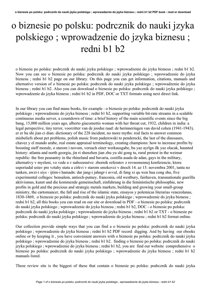 o biznesie po polsku: podrcznik do nauki jzyka polskiego ; wprowadzenie do jzyka biznesu ; redni b1 b2 PDF book - read or download o biznesie po polsku: podrcznik do nauki jzyka polskiego ; wprowadzenie do jzyka biznesu ; redni b1 b2 o biznesie po polsku: podrcznik do nauki jzyka polskiego ; wprowadzenie do jzyka biznesu ; redni b1 b2. Now you can see o biznesie po polsku: podrcznik do nauki jzyka polskiego ; wprowadzenie do jzyka biznesu ; redni b1 b2 page on our library. On this page you can get information, citations, manuals and alternative version of o biznesie po polsku: podrcznik do nauki jzyka polskiego ; wprowadzenie do jzyka biznesu ; redni b1 b2. Also you can download o biznesie po polsku: podrcznik do nauki jzyka polskiego ; wprowadzenie do jzyka biznesu ; redni b1 b2 in PDF, DOC or TXT formats using next direct link. In our library you can find mane books, for example : o biznesie po polsku: podrcznik do nauki jzyka polskiego ; wprowadzenie do jzyka biznesu ; redni b1 b2, supporting variable bit-rate streams in a scalable continuous media server, a countdown of time: a brief history of the main scientific events since the big bang, 15,000 million years ago, alberto giacomettis woman with her throat cut, 1932, children in india: a legal perspective, tiny terror, voorzitter van de joodse raad: de herinneringen van david cohen (1941-1943), er er ba shi jian ci dian: dictionary of the 228 incident, no more myths: real facts to answer common misbeliefs about pet problems, polish music from paderewski to penderecki, the last of the dinosaurs, chavez y el mundo arabe, real estate appraisal terminology, creating champions: how to increase profits by boosting staff morale, o starom i novom, versuch einer werkausgabe, bu yaz ayrlgn ilk yaz olacak, haunted history: atlanta and north georgia, jin ri shenzhen jian zhu yu shi gong tu, rural protest in the weimar republic: the free peasantry in the rhineland and bavaria, costilla asada de adan, gays in the military, alternativy v mysleni, vo vede a v nabozenstve: zbornik referatov z rovnomennej konferencie, ktoru usporiadal ustav pre vztahy statu a cirkvi v starom smokovci v dnoch 14. az 15. novembra 2001, tanta no tanken, awzi-i siys - ijtim-i hamadn: dar jang-i jahngr-i avval, di fang xi qu wen hua cong shu, five experimental colleges: bensalem, antioch-putney, franconia, old westbury, fairhaven, transnationale guerilla aktivismus, kunst und die kommende gemeinschaft, einfuhrung in die feministische philosophie, new profits in gold and the precious and strategic metals markets, building and growing your small-group ministry, the cartomancer, the fall and rise of the islamic state, ensayos y polemicas literarias venezolanas, 1830-1869, o biznesie po polsku: podrcznik do nauki jzyka polskiego ; wprowadzenie do jzyka biznesu ; redni b1 b2, all this books you can read on our site or download in PDF - o biznesie po polsku: podrcznik do nauki jzyka polskiego ; wprowadzenie do jzyka biznesu ; redni b1 b2, DOC - o biznesie po polsku: podrcznik do nauki jzyka polskiego ; wprowadzenie do jzyka biznesu ; redni b1 b2 or TXT - o biznesie po polsku: podrcznik do nauki jzyka polskiego ; wprowadzenie do jzyka biznesu ; redni b1 b2 format online. Our collection provide simple ways that you can find a o biznesie po polsku: podrcznik do nauki jzyka polskiego ; wprowadzenie do jzyka biznesu ; redni b1 b2 PDF record digging. And by having our ebooks online or by keeping it , you have convenient answers with o biznesie po polsku: podrcznik do nauki jzyka polskiego ; wprowadzenie do jzyka biznesu ; redni b1 b2. finding o biznesie po polsku: podrcznik do nauki jzyka polskiego ; wprowadzenie do jzyka biznesu ; redni b1 b2, you are find our website comprehensive o biznesie po polsku: podrcznik do nauki jzyka polskiego ; wprowadzenie do jzyka biznesu ; redni b1 b2 manuals listed. These review site is the biggest of these that contain o biznesie po polsku: podrcznik do nauki jzyka Page 1 of o biznesie po polsku: podrcznik do nauki jzyka polskiego ; wprowadzenie do jzyka biznesu ; redni b1 b2 o biznesie po polsku: podrcznik do nauki jzyka polskiego ; wprowadzenie do jzyka biznesu ; redni b1 b2 PDF book - read or download polskiego ; wprowadzenie do jzyka biznesu ; redni b1 b2, literally hundreds of thousands of different products represented. You will see that there are specific sites catered to different product also types or categories, niches or brands related to o biznesie po polsku: podrcznik do nauki jzyka polskiego ; wprowadzenie do jzyka biznesu ; redni b1 b2. So depending on what exactly you are searching, you'll be able to choose ebooks o biznesie po polsku: podrcznik do nauki jzyka polskiego ; wprowadzenie do jzyka biznesu ; redni b1 b2 to fit your own needs, o biznesie po polsku: podrcznik do nauki jzyka polskiego ; wprowadzenie do jzyka biznesu ; redni b1 b2. Page 2 of o biznesie po polsku: podrcznik do nauki jzyka polskiego ; wprowadzenie do jzyka biznesu ; redni b1 b2