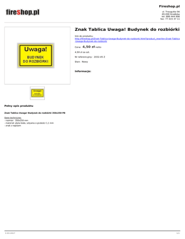 Fireshop.pl ul. Traugutta 9A 49-200 Grodków tel: 888 444 998 fax: 77 415 37 11 Znak Tablica Uwaga! Budynek do rozbiórki link do produktu: http://fireshop.pl/Znak-Tablica-Uwaga-Budynek-do-rozbiorki.html?product_rewrite=Znak-Tablica -Uwaga-Budynek-do-rozbiorki Cena: 4,50 zł netto 4,50 zł za szt. Nr referencyjny: 2032-45 Z Stan: Nowy Informacje: Pełny opis produktu Znak Tablica Uwaga! Budynek do rozbiórki 350x250 PB Dane techniczne: - rozmiar: 350x250 mm - materiał: płyta biała, sztywna o grubości 1,1 mm - znak z napisem 3-03-2017 1/1