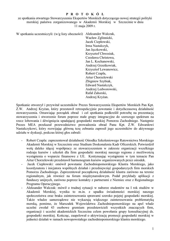 P R O T O K Ó Ł ze spotkania otwartego Stowarzyszenia Ekspertów Morskich dotyczącego nowej strategii polityki morskiej państwa zorganizowanego w Akademii Morskiej w Szczecinie w dniu 11 maja 2009 r. W spotkaniu uczestniczyli: (w/g listy obecności) Aleksander Walczak, Wacław Zglinnicki, Jacek Ciepłowski, Irma Nastalczyk, Jan Jęczkowski, Krzysztof Chwesiuk, Czesława Christowa, Jan L. Kochanowski, Andrzej Grześkowiak, Krzysztof Lewanowicz, Robert Czapla, Artur Chorzelewski Zbigniew Szybiak, Edward Nastalczyk, Andrzej Ledworowski, Rafał Zahorski, Andrzej KryŜan. Spotkanie otworzył i przywitał uczestników Prezes Stowarzyszenia Ekspertów Morskich Pan Kpt. ś.W. Andrzej KryŜan, który przestawił retrospekcyjnie powstanie i dotychczasową działalność stowarzyszenia. Omawiając porządek obrad i cel spotkania podkreślił potrzebę na prezentację stowarzyszenia i stworzenie forum poprzez małe grupy integracyjne do szerszego spektrum na rzecz lobowania i dźwignięcia upadającej gospodarki morskiej Pomorza Zachodniego. Następnie Prezes MEA przekazał przewodnictwo prowadzenia obrad Panu Kpt. ś.W. Edwardowi Nastalczykowi, który rozwijając główną tezę zebrania zaprosił jego uczestników do aktywnego udziału w dyskusji, podczas której głos zabrali: - - - Robert Czapla: zaprezentował działalność Ośrodka Szkoleniowego Ratownictwa Morskiego Akademii Morskiej w Szczecinie oraz Studium Doskonalenia Kadr Oficerskich. Potwierdził wolę daleko idącej współpracy ze stowarzyszeniem w zakresie organizacji wszelkiego rodzaju kursów i szkoleń dla firm gospodarki morskiej naszego regionu z moŜliwością wystąpienia o wsparcie finansowe z UE. Kontynuując wystąpienie w tym temacie Pan Artur Chorzelewski przedstawił harmonogram kursów organizowanych przez ośrodek. Jacek Ciepłowski: omówił powstanie Zachodniopomorskiego Klastra Morskiego, jako koordynatora i inicjatora wspólnych działań i przedsięwzięć gospodarczych firm morskich Pomorza Zachodniego. Zaprezentował początkową działalność klastra zarówno na terenie regionalnym, jak równieŜ na forum międzynarodowym. Podał przykłady aplikacji z funduszy unijnych, zarówno poprzez kontakty z partnerami z Niemiec oraz z Regionalnego Programu Operacyjnego. Aleksander Walczak: mówił o trudnej sytuacji w naborze studentów na I rok studiów w Akademii Morskiej, wynika to m.in. z upadku świadomości morskiej naszego społeczeństwa oraz braku zainteresowania sprawami szeroko pojętej gospodarki morskiej. TakŜe władze samorządowe nie wykazują większego zainteresowania problematyką morską, pomimo, Ŝe Marszałek Województwa Zachodniopomorskiego na apel władz uczelni zwołał 43 osobowe gremium przedstawicieli wszystkich znaczących firm, organizacji i uczelni akademickich Szczecina celem powołania grupy konsultacyjnej ds. gospodarki morskiej. Kończąc, zaapelował o aktywizację promocji gospodarki morskiej w jedności działań w ramach nowopowstałego zachodniopomorskiego klastra morskiego. 1 - - - - - - Krzysztof Chwesiuk: poinformował o przygotowaniu opinii do Ministerstwa Infrastruktury w zakresie nowej strategii rozwoju gospodarki morskiej RP. Poinformował o pracach przy elektronicznej bibliotece gospodarki morskiej, pisaniu wniosków i projektów nowych pomysłów uczelni pozyskując na nie środki z funduszy unijnych. Mówił takŜe o zakupach przez Akademię Morską nowoczesnego sprzętu technicznego m.in. symulatorów statkowych, który podnosi znacząco rangę uczelni. Andrzej Ledworowski: omówił ogrom pracy włoŜony w obronę Stoczni Szczecińskiej Nowa jako Stowarzyszenie na Rzecz SSN, która jednak nie spotkała się ze zrozumieniem decydentów politycznych, a w/w organizacja przekształciła się w Stowarzyszenie na Rzecz Gospodarki Morskiej i Śródlądowej. Wnioskował aby w sprawie nowelizacji strategii rozwoju gospodarki morskiej RP i konsultacjom społecznym powierzyć rolę koordynatora Akademii Morskiej w Szczecinie. Jan Jęczkowski: kontynuował wystąpienie swojego poprzednika, mówił o moŜliwościach przez przyszłego inwestora budowy statków na terenie stoczni przy zachowaniu konsolidacji północnych jej terenów od pochylni Wulkan. W tej sprawie wystosowano apel do ponad 30 adresatów, m.in. ARP i Ministra Skarbu. Postulował o powołaniu „owalnego stołu” z udziałem przedstawicieli Komisji Europejskiej w obronie polskiego przemysłu stoczniowego. Na zakończenie swojego wystąpienia wnioskował o zorganizowanie spotkania z udziałem przedstawicieli wszystkich mediów w celu nagłośnienia poruszanych, aktualnych problemów gospodarki morskiej województwa zachodniopomorskiego. Rafał Zahorski: zwrócił uwagę na brak zainteresowania zagadnieniami gospodarki morskiej zarówno, przez wojewódzkie władze samorządowe jak i aparat administracyjny miasta. Optował na rozwój tej gałęzi przemysłu poprzez port szczeciński i pogłębienie toru wodnego do głębokości eksploatacyjnej 12,5 m. Edward Nastalczyk: potwierdził opinie wszystkich uczestników, Ŝe naleŜy kontynuować tego typu spotkania integrujące środowisko gospodarki morskiej Pomorza Zachodniego i lobujące na rzecz jej rozwoju. Koordynatorem tych spotkań winna być Akademia Morska przy udziale Zachodniopomorskiego Klastra Morskiego. Andrzej KryŜan: podsumowując dyskusję zwrócił uwagę na moŜliwości włączenie się Stowarzyszenia Eksportów Morskich i innych zainteresowanych organizacji do opracowań studium wykonalności inwestycji morskich, powołania grupy inicjatywnej pod patronatem Zachodniopomorskiego Klastra Morskiego i MEA w kontynuacji kolejnych spotkań zachodniopomorskiego środowiska gospodarki morskiej oraz wystąpienia do Ministra Infrastruktury z wnioskiem o przedłuŜenia terminu opiniowania nowych załoŜeń strategii rozwoju gospodarki morskiej kraju do 30 czerwca br. Na tym spotkanie zakończono. Protokołował: /-/K.Lewanowicz P.S. Po otwartym spotkaniu po