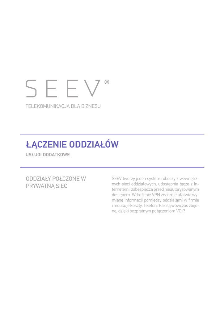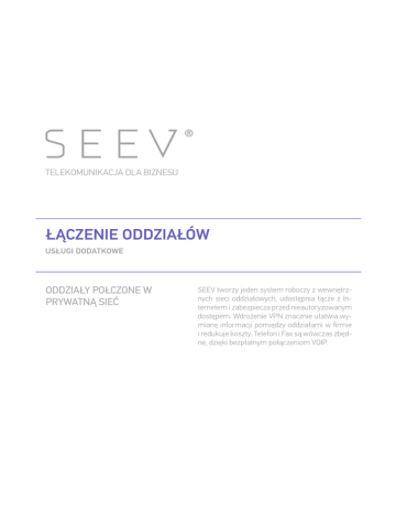 ® TELEKOMUNIKACJA DLA BIZNESU ŁĄCZENIE ODDZIAŁÓW USŁUGI DODATKOWE ODDZIAŁY POŁCZONE W PRYWATNĄ SIEĆ SEEV tworzy jeden system roboczy z wewnętrznych sieci oddziałowych, udostępnia łącze z Internetem i zabezpiecza przed nieautoryzowanym dostępem. Wdrożenie VPN znacznie ułatwia wymianę informacji pomiędzy oddziałami w firmie i redukuje koszty. Telefon i Fax są wówczas zbędne, dzięki bezpłatnym połączeniom VOIP. ® TELEKOMUNIKACJA DLA BIZNESU ŁĄCZENIE ODDZIAŁÓW USŁUGI DODATKOWE SZCZEGÓŁY USŁUGI WYKORZYSTANIE SIECI SEEV VPN oparty na sieci światłowodowej SEEV w topologii MESH o 50krotnym zwielokrotnieniu, skalowalnej przepływności nx10Gb/s i bezpośrednim punktom styku ze wszystkimi sieciami na świecie. Dzięki zastosowanym rozwiązaniom łącze 10Mb/s w sieci światłowodowej SEEV jest bardziej wydajne od łącza 1Gb/s w zwykłej sieci asymetrycznej. Parametry sieci są dostosowywane do potrzeb Klienta. - Dodatkowo - FTTB. Sieć doprowadzona bezpośrednio do budynku firmy - VPN oparty jest na łączach dedykowanych BEZPIECZEŃSTWO DANYCH SEEV stosuje system szyfrowania informacji wewnątrz sieci kluczami 1024 lub 2048 bitowymi w technologii SSL. Pakiety przechwycone w sieci udostępnionej lub publicznej są nierozpoznawalne bez kluczy szyfrowania. Prywatne dane są hermetyzowane i szyfrowane oraz chronione przed możliwością podsłuchu. ELASTYCZNOŚĆ - Sieć VPN dopasowana do unikalnej sytuacji i potrzeb Klienta - Łatwość wdrożenia, - Pełna kontrola nad trasą transmisji, - Zarządzania dostępem (np. przez wprowadzanie haseł) - Swoboda adresacji, pod pełną kontrolą Abonenta, - Możliwość korzystania z intranetu w ramach VPN, - Możliwość dostępu do zasobów sieci poza budynkiem firmy – VPN Mobilny, - VPN warstwy drugiej i trzeciej (L2, L3) GWARANCJA SLA DLA INTERNETU ŚWIATŁOWODOWEGO SEEV umożliwia również dostęp do zasobów innych sieci na zasadzie tranzytu. Warunki umowy ustalane są indywidualnie. - Dostępność usługi dla łączy bez protekcji * : 99,90% w trybie rocznym - Dostępność usługi dla łączy z protekcją : 99,98% w trybie rocznym - Czas reakcji : 30 min - Konsultacje techniczne : 2h miesięcznie w ramach usługi - Kary umowne: 200% opłat za każdy okres awarii po przekroczeniu gwarancji dostępności ® TELEKOMUNIKACJA DLA BIZNESU VPN MOBILNY W przypadku użytkowników korzystających z VPN mobilnie i systememu Windows, instalowane jest dodatkowe oprogramowanie, a autoryzacja odbywa sie za pomocą certyfikatu znajdującego się na zaszyfrowanym PenDrive’ie. W przypadku kradzieży certyfikatu, jest on anulowany i wygenerowany na nowo. TRZY KLASY VPN IP VPN PRO Jeśli firma nie posiada danych priorytetowych i wymaga, aby wszystkie dane: e-mail, bazy danych na dyskach sieciowych, Intranet, przeglądanie WWW były traktowane jednakowo, SEEV oferuje mu prosty, jednoklasowy VPN bez priorytetyzacji ruchu. IP VPN MAX Jeśli firma posiada krytyczne dane biznesowe jak np. bazy CRM, których działanie w ramach sieci jest kwestią strategiczną, SEEV oferuje wdrożenie VPNu dwu-klasowego z priorytetyzacją ruchu. Pozwoli to uniknąć jakichkolwiek opóźnień i strat w ramach kluczowych danych firmy. IP VPN MAXVOICE Jeśli w firmie oprócz danych priorytetowych istnieje potrzeba wdrożenia wewnętrznego systemu telefonicznego w technologii VoIP, SEEV oferuje VPN trzy-klasowy z priorytetyzacją ruchu. Wówczas możliwe jest zachowanie priorytetowego ruchu na niezmiennym poziomie i prowadzenie bezpłatnych rozmów telefonicznych w firmie. INTERNET SEEV® W RAMACH SIECI VPN W SEEV przewidziane są 3 możliwości dostępu do Internetu w ramach sieci VPN LOKALNY DOSTĘP DO INTERNETU_IPVPN – zestawiany w lokalizacji głównej (w centrali) Klienta. Rozwiązanie najczęściej stosowane: Klient posiada w centrali własny Firewall, więc wszystkie dane Internetowe przeprowadzane są przez ten Firewall. CENTRALNY DOSTĘP DO INTERNETU_IPVPN – zestawiany z sieci SEEV, z wirtualnym Firewall’em. INDYWIDUALNY DOSTĘP DO INTERNETU IPVPN