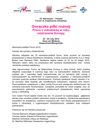 19. Niemiecko – Polskie Forum nt. kształcenia młodzieży Gorączka piłki nożnej Praca z młodzieżą w roku mistrzostw Europy 22 - 24 Luty 2012 Haus am Maiberg Heppenheim/Bergstraße Niemiecko-polskie Forum 2012 Impulsy dla wymiany młodzieżowej Wkrótce odbędzie się 19 niemiecko-polskie forum, które pozwoli na wymianę doświadczeń w sferze kształcenia młodzieży, a które zrzesza partnerów m.in z Hesji, Baden oraz Reinland Pfalz. Spotkanie będzie trwało od 22 do 24 lutego 2012. Głównym celem, który mu przyświeca jest wymiana doświadczenia oraz rozwój niemiecko-polskiej współpracy. Ideą tegorocznego Forum są Mistrzostwa Europy w piłce nożnej, które zostaną oficjalnie rozpoczęte 8 czerwca tego roku na warszawskim stadionie. Zarówno wykłady jak i warsztaty będą koncentrowały sie na tematyce piłki nożnej z wykorzystaniem jej elementów w organizowaniu projektów z niemiecko-polskimi uczniami podczas spotkań młodzieżowych. Podczas spotkania chodzi również o to, by poruszyć takie aspekty, jak: kształtowanie tożsamości, migracje oraz rasizm. Poza kwestiami związanymi z piłką nożną Forum jest okazją aby doinformować się odnośnie warunków finansowania, rozwijania pomysłów na nowe projekty oraz do poszukiwania partnerów i wymiany praktycznych doświadczeń, które usprawnią pracę z młodzieżą. Tym razem Forum będzie trwało trzy dni. To pozwoli na wystarczające zgłębienie tematu oraz umożliwi polskim partnerom udział w spotkaniu. Serdecznie zapraszamy wszystkich do współpracy, zarówno nowicjuszy jak i tych dłużej zaangażowanych w pracę z młodzieżą, z organizacjami młodzieżowymi, szkołami oraz miastami partnerskimi. Cieszymy się na Państwa przybycie! Thomas Bartosch (Regierungspräsidium Kassel) Thomas Hetzer (Deutsch-Polnisches Jugendwerk) Stephan Schwieren (Haus am Maiberg) Dr. Manfred Wittmeier (Hessischer Jugendring) Program: Środa, 22 luty 2012 14.00h Zakwaterowanie oraz powitalna kawa 15.00h Wzajemne poznanie się oraz zapoznanie z programem, wymiana doświadczeń 16.30h Plenum z wykładem: Z kim właściwie mamy do czynienia? Młodzi – Jugend 2011. Prezentacja i dyskusja nad sprawozdaniem polskiego rządu 2011 Referentka: Agnieszka Lada, ISP Warszawa 18.30h Kolacja – bufet odewaldzki 19.30h Polska przed ME 2012. Podroż śladami nowo wybudowanych stadionów. Wieczorny program autorski Mathias Kneip, Regensburg Czwartek, 23 luty 9.00h Animacja językowa 9.30h I Faza pracy grupowej Warsztat I.1: Piłka nożna pomiędzy integracja i wrogością. Możliwości włączenia antyrasistowskich elementów pracy z fanami i młodzieżą Referentka: Gerd Wagner, Koordynator Fanprojekte Deutsche Sportjugend, Frankfurt/M. Warsztat I.2: Kraj goszczący Ukraina – Trójjęzyczne projekty. DMK w Gdansku - na polu edukacji obywatelskiej Referent: Nedim Uselinov, DMK, Gdansk Thomas Müller-Boehr, Fundacja Renovabis München Warsztat I.3: Drużyny narodowe z legionistami i imigrantami – związek migracji z piłką nożną jako szansa dla polsko-niemieckich projektów młodzieżowych. Referentka: Zuzanna Krzysztofik, DJO-Deutsche Jugend in Europa, Berlin 12.30h Obiad 14.00h Animacja językowa 14.30h OASE – Wprowadzenie w nową możliwość składania wniosków online do DPJW, Thomas Hetzer, DPJW 15.00h Praca grupowa II Warsztat II.1 Składanie wniosku. Wytyczne DPJW oraz wsparcie w landu Hesja. Referent: Thomas Bartosch, Thomas Hetzer, DPJW Warsztat II.2 Ewaluacja jako wytyczna dla jakości spotkań młodzieżowych. Referentka: Verena Henkel, freelancerka, Berlin Warsztat II.3 Prawa człowieka jako temat polsko-niemieckiej współpracy młodzieżowej. Referentka: Magdalena Kaj, Jeden Świat Poznań 17.30h Rynek wymiany doświadczeń – Czas na przeprowadzone projekty 18.30h Kolacja 20.00h Przekraczanie polsko-niemieckich granic za pomocą piłki nożnej – wieczór z Eugenem Polanskim z Mainz05, polski gracz narodowy Piatek, 24 luty 2012 9.00h Animacja językowa 9.30h Warsztaty o praktycznym wymiarze na następujące tematy: – Jak powstaje dobre spotkanie? Aspekty dobrego ułożenia programu – Jakie tematy są ważne na przyszłość w niemiecko-polskiej wymianie – Kontakt Hesja-Wielkopolska np. planowanie 20 Forum 2013 w Polsce Poradnictwo: T. Hetzer, T. Bartosch, Ole Jantschek, Manfred Wittmeier 12.30h Obiad 13.30h Prezentacja wyników poszczególnych warsztatów 14.00h Ewaluacja 15.00h Kawa pożegnalna Informacje ogólne Zameldowanie Zameldować można się drogą e-mailową na adres: [email protected] albo poprzez fax.: 0049 (0)6252 9306-17 Ostateczny termin zameldowania to 10 luty 2012 Przy zameldowaniu proszę podać: od kiedy do kiedy mogą Państwo wziąć udział oraz które z grup roboczych Państwa interesują Oplata seminaryjna - 60 euro (nocleg 3 dni \wyżywienie) - 40 euro (nocleg 2 dni \wyżywienie) - 20 euro dla gości konferencji bez noclegu - dodatkowa dopłata 10 euro za pokój jednoosobowy Krąg uczestników - Szkoła - Kształcenie młodzieży i dorosłych - Miasta i regiony partnerskie Zwrot kosztów podroży Uczestnicy z Polski mogą starać sie o zwrot części kosztów według danych zawartych w tabeli (www.dpjw.de) Język Wedle zapotrzebowania konferencja może zostać przetłumaczona na język polski Proszę zaznaczyć przy zameldowaniu czy jest potrzebne. Organizator - Haus am Maiberg (www.haus-am-maiberg.de) - Deutsch-Polnisches Jugendwerk (www.dpjw.de) - Hessischer Jugendring (www.hessischer-jugendring.de) - Regierungspräsidium Kassel Koordynator Stephan Schwieren (Referent Internationale Jugendarbeit) Tel.: 06252 9306-30 E-Mail: [email protected] Tak Państwo nas znajdą Do Haus am Maiberg można łatwo dojechać zarówno komunikacją publiczną jak i samochodem osobowym Dojazd pociągiem Regularne połączenia z Mannheim, Frankfurtu, Moguncji, Darmstadt oraz Heidelbergu. Dworzec Heppenheim. Mając za sobą zablokowaną część drogi, proszę kierować sie na prawo od budynku d