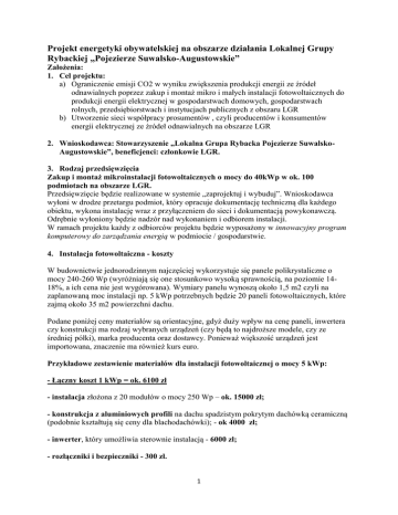 Projekt energetyki obywatelskiej na obszarze działania Lokalnej Grupy Rybackiej „Pojezierze Suwalsko-Augustowskie” Założenia: 1. Cel projektu: a) Ograniczenie emisji CO2 w wyniku zwiększenia produkcji energii ze źródeł odnawialnych poprzez zakup i montaż mikro i małych instalacji fotowoltaicznych do produkcji energii elektrycznej w gospodarstwach domowych, gospodarstwach rolnych, przedsiębiorstwach i instytucjach publicznych z obszaru LGR b) Utworzenie sieci współpracy prosumentów , czyli producentów i konsumentów energii elektrycznej ze źródeł odnawialnych na obszarze LGR 2. Wnioskodawca: Stowarzyszenie „Lokalna Grupa Rybacka Pojezierze SuwalskoAugustowskie”, beneficjenci: członkowie LGR. 3. Rodzaj przedsięwzięcia Zakup i montaż mikroinstalacji fotowoltaicznych o mocy do 40kWp w ok. 100 podmiotach na obszarze LGR. Przedsięwzięcie będzie realizowane w systemie „zaprojektuj i wybuduj”. Wnioskodawca wyłoni w drodze przetargu podmiot, który opracuje dokumentację techniczną dla każdego obiektu, wykona instalację wraz z przyłączeniem do sieci i dokumentacją powykonawczą. Odrębnie wyłoniony będzie nadzór nad wykonaniem i odbiorem instalacji. W ramach projektu każdy z odbiorców projektu będzie wyposażony w innowacyjny program komputerowy do zarządzania energią w podmiocie / gospodarstwie. 4. Instalacja fotowoltaiczna - koszty W budownictwie jednorodzinnym najczęściej wykorzystuje się panele polikrystaliczne o mocy 240-260 Wp (wyróżniają się one stosunkowo wysoką sprawnością, na poziomie 1418%, a ich cena nie jest wygórowana). Wymiary panelu wynoszą około 1,5 m2 czyli na zaplanowaną moc instalacji np. 5 kWp potrzebnych będzie 20 paneli fotowoltaicznych, które zajmą około 35 m2 powierzchni dachu. Podane poniżej ceny materiałów są orientacyjne, gdyż duży wpływ na cenę paneli, inwertera czy konstrukcji ma rodzaj wybranych urządzeń (czy będą to najdroższe modele, czy ze średniej półki), marka producenta oraz dostawcy. Ponieważ większość urządzeń jest importowana, znaczenie ma również kurs euro. Przykładowe zestawienie materiałów dla instalacji fotowoltaicznej o mocy 5 kWp: - Łączny koszt 1 kWp = ok. 6100 zł - instalacja złożona z 20 modułów o mocy 250 Wp – ok. 15000 zł; - konstrukcja z aluminiowych profili na dachu spadzistym pokrytym dachówką ceramiczną (podobnie kształtują się ceny dla blachodachówki); - ok 4000 zł; - inwerter, który umożliwia sterownie instalacją - 6000 zł; - rozłączniki i bezpieczniki - 300 zł. 1 - montaż instalacji - 4000 zł; - koszty pracy elektryka wyniosą - 400 zł - nadzór – 200 zł - przygotowanie projektu, studium wykonalności, koncepcji – 300 zł - zarządzanie projektem – 300 zł - Razem = ok. 30500 zł za instalację 5 kWp - Przy łącznej wielkości zamontowanych instalacji na poziomie 500 kW koszt projektu wyniósłby ok. 3 050 000 zł Uwaga! W zestawieniu tym nie uwzględniono na przykład kosztu akumulatorów, gdyż w instalacji fotowoltaicznej on-grid stanowią one opcję dodatkową. Natomiast instalacja off-grid dla naszego przykładowego domu, ze względu na konieczność magazynowania prądu, inny rodzaj inwertera oraz większą liczbę paneli, będzie droższa co najmniej 50%. Uwaga: Ostateczny koszt instalacji będzie ustalony w wyniku przetargu ! 6. Źródła finansowania projektu Projekt zostanie złożony do Regionalnego Programu Operacyjnego Województwa Podlaskiego, Działanie 5.1. Energetyka oparta na odnawialnych źródłach energii. Dotacja wyniesie do 80 % wartości kosztów kwalifikowalnych projektu. Wkład własny beneficjenta wyniesie 20% kosztów kwalifikowalnych i uzależniony będzie od wielkości instalacji fotowoltaicznej. 7. Korzyści z instalacji fotowoltaicznej Instalacja o mocy 5 kWp wyprodukuje ona rocznie 4750 kWh prądu. Odpowiada to przeciętnemu zapotrzebowaniu na prąd przez 4-osobową rodzinę. Zatem, jeśli za prąd płacimy 0,65 zł za kWh (wraz ze wszystkimi opłatami stałymi), to zaoszczędzimy około 3090 zł. Daje to nam zwrot poniesionych kosztów po około 10 latach (bez dotacji UE) Z dotacją UE 80% nasz koszt wyniesie 20% (30500 x 20% = 6100) i można oszacować, że zwrot nastąpi w ciągu dwóch lat. Zgodnie z ustawą o OZE zakład energetyczny będzie miał obowiązek odkupować od nas wyprodukowaną energię po ustalonych cenach gwarantowanych (może ulec zmianie!) W obiekcie zostanie zainstalowany tzw licznik dwustronny energii elektrycznej, a rozliczanie energii sprzedanej i nabytej następować będzie w okresach półrocznych. 8. Czynności formalnoprawne: a) Deklaracja udziału w projekcie łącznie z opisem planowanej instalacji i lokalizacją instalacji 2 b) Umowa pomiędzy Wnioskodawcą a uczestnikami projektu, określająca zasady współpracy i obowiązki stron. c) Zgłoszenie planowanego przyłączenia instalacji do sieci energetycznej w przypadku jeżeli moc zainstalowana nie przekroczy mocy przyłączeniowej (pełnomocnictwo do czynności dla Wnioskodawcy) d) Uzyskanie warunków przyłączenia instalacji jeżeli moc instalacji przekracza dotychczasową moc przyłączeniową. e) Nie jest wymagana decyzja budowlana ani zgłoszenie zamiaru budowy instalacji do starostwa. (art. 29 ust 2 pkt 16 w związku z art. 30 ust 1 ustawy Prawo Budowlane) f) Nie jest również wymagana decyzja środowiskowa. Sporządził: Cezary Cieślukowski 23.04.2016r. 3