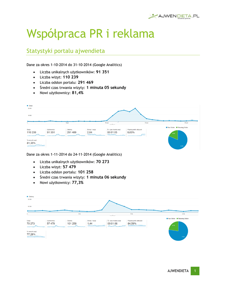 Współpraca PR i reklama Statystyki portalu ajwendieta Dane za okres 1-10-2014 do 31-10-2014 (Google Analitics) Liczba unikalnych użytkowników: 91 351 Liczba wizyt: 110 239 Liczba odsłon portalu: 291 469 Średni czas trwania wizyty: 1 minuta 05 sekundy Nowi użytkownicy: 81,4% Dane za okres 1-11-2014 do 24-11-2014 (Google Analitics) Liczba unikalnych użytkowników: 70 273 Liczba wizyt: 57 479 Liczba odsłon portalu: 101 258 Średni czas trwania wizyty: 1 minuta 06 sekundy Nowi użytkownicy: 77,3% AJWENDIETA 1 Statystyki postów portalu ajwendieta Na dzień 25-11-2014 – ostatnie 30 dni Na dzień 25-11-2014 – od września 2014 (start bloga) AJWENDIETA 2 Pozostałe dane liczbowe dla portalu ajwendieta Dane demograficzne: 56% 21% 14% 77% osoby w wieku 24-35 lat osoby w wieku 35-44 lat osoby w wieku 18-24 lat odwiedzających to kobiety Na portalu ajwendieta znajduje się: 461 wpisów 405 komentarzy 208 subskrybentów newslettera Pozostałe kanały informacyjne 5631 fanów na Facebook: https://www.facebook.com/Ajwen.Dietetyk.Trener.Personalny 1359 fanów na profilu z naszymi szkoleniami: https://www.facebook.com/ajwen.pl.szkolenia 4146 członków zamkniętej grupy wsparcia dla autorskiego programu 10 zasad w 30 dni: https://www.facebook.com/groups/30.dniowe.wyzwanie/ 3332 subskrybentów i 631 701 odtworzeń filmów na kanale youtube: https://www.youtube.com/user/GabinetDietetyczny/ Nowy kanał na youtube: https://www.youtube.com/user/AjwenVlog/ 10 644 wyświetleń kanału youtube: https://www.youtube.com/user/projektminus40 AJWENDIETA 3 Słów kilka o projekcie Portal ajwendieta to miejsce gdzie można znaleźć informacje dotyczące diety, suplementacji, zdrowej żywności, aktywności fizycznej i szeroko pojętego life style – jak żyć w świecie chemii, przetworzonej żywności, w czasach gdy nie ma na nic czasu, jak jeść, jak trenować, co suplementować, gdzie kupować, jakich sportowych akcesoriów i ciuchów używać (rower, wspinaczka, czas wolnym, narty, góry, biwak). Blog został podzielony na kilka części: Ajwen na tropie – gdzie analizuję etykiety produktów. Ajwen poleca – tu polecam różnego rodzaju produkty, sklepy, strony, publikacje. Ajwen testuje – opowiadam o tym co spróbowałam, przetestowałam i jakie były wrażenia. Dieta – posty dotyczące diety, ciekawostek dietetycznych, składników odżywczych. Dziennik Ajwen – to blog osobisty, gdzie codziennie umieszczam wpisy dotyczące mojego dnia, moich posiłków, moich suplementów, aktywności fizycznej, tego co próbowałam, testowałam, gdzie byłam, opisuję moje subiektywne wrażenia i przemyślenia dotyczące różnych sytuacji życiowych czy związanych z tym co testuję. Kulinaria – tu znajdują się zdjęcia i przepisy moich dań, ale również dań uczestników programu 30 dniowe wyzwanie oraz projektminus40. Podcast – nagrania w postaci mp3, które można odsłuchać lub ściągnąć na odtwarzacz. Nagrania są tematyczne, moje autorskie lub są zapisami audycji radiowych, w których wzięłam udział. Projektminus40 – działa z filmami, w których głównymi bohaterami są osoby odchudzające się, ich historie, ich zmagania, filmy edukują ale również motywują. Publikacje – to dział ze wszystkim co zostało przeze mnie napisane dla czasopism, gazet czy innych portali, obecnie: 64 pozycje. Suplementacja – posty dotyczące suplementów tych dostępnych na rynku ale również tych, które można zrobić samodzielnie. Sport – posty dotyczące aktywności fizycznej. Szkolenia – relacje z odbywających się szkoleń pod szyldem Ajwen. VLOG Ajwen – to osobisty vlog z filmami dotyczącymi mojego dnia, pożywienia, aktywności fizycznej. Trochę tu motywacji, czasami opowieści o diecie, czasami opis mojego dnia. W mediach – zbiór wszystkich materiałów, które są zapisem moich medialnych wystąpień, głównie telewizyjnych, obecnie: 57 pozycji. Ajwendieta to również: Filmy tematyczne (odpłatne) - AjwenTV Webinaria – spotkania z klientami/pacjentami/słuchaczami na wirtualnych wykładach w czasie rzeczywistym. Szkolenia – cyklicznie oferujemy szkolenia stacjonarne z tematów: dieta inne podejście, dieta dzieci, dieta przyszłych mam, dietetyka kliniczna, chemia w żywności, paleodieta i produkty superfoods, dietetyka sportowa, dietetyka (teoria i praktyka) dla trenerów i dietetyków. Aktualny grafik szkoleń dostępny jest: http://www.ajwendieta.pl/blog/zapowiedzi/ajwenszkolenia-2015-terminy/ Średnio na szkolenie przyjeżdża 20 osób z całej Polski, natomiast na dietetykę kliniczną 50 osób. AJWENDIETA 4 Autorka ajwendieta i ajwen Iwona Wierzbicka jest dietetykiem klinicznym i trenerem personalnym (więcej o: http://www.ajwen.pl/o-mnie/) prowadzi swoją poradnię dietetyczną w Opolu (www.ajwen.pl), ponadto stworzyła portal ajwendieta dla tych wszystkich, którzy chcą więcej oraz dla tych którzy nie mogą dotrzeć osobiście. Iwona Wierzbicka jest również pomysłodawczynią 10 zasad skutecznego odchudzania, które mają swój film w internecie (206tys. odtworzeń), powstały zasady oraz grupa wsparcia (4146 członków). Docelowo program zostanie zaadresowany do fitness clubów w Polsce. Iwona Wierzbicka stworzyła również swoją własną piramidę żywieniową dla dzieci i dorosłych. http://www.ajwendieta.pl/blog/dieta/piramida-zywienia-wg-ajwen-iwona-wierzbicka/ http://www.ajwendieta.pl/blog/dieta/piramida-zywienia-dziecka-wg-ajwen-iwonawierzbicka/ Formy współpracy Formy współpracy mogą być bardzo szerokie. Możemy łączyć kilka form, tworząc kampanie czy programy, artykuły, podcasty, nagrania video, konkursy. Jestem otwarta na nowe pomysły. Jednakże kampania nie może naruszać mojego dobrego imienia oraz zaufania do mojej osoby, jak również tego co publikuję. Staram się być obiektywna, piszę co myślę, staram się nie ulegać wpływom, jestem zwolennikiem naturalnej żywności i naturalnych suplementów. Zatem jeśli widz