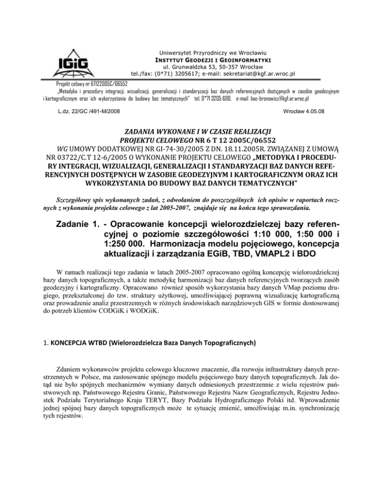 Uniwersytet Przyrodniczy we Wrocławiu I NSTYTUT G EODEZJI I G EOINFORMATYKI ul. Grunwaldzka 53, 50-357 Wrocław tel./fax: (0*71) 3205617; e-mail: [email protected] Projekt celowy nr 6T122005C/06552 „Metodyka i procedury integracji, wizualizacji, generalizacji i standaryzacji baz danych referencyjnych dostępnych w zasobie geodezyjnym i kartograficznym oraz ich wykorzystania do budowy baz tematycznych” tel. 0*71 3205 690, e-mail [email protected] L.dz. 22/GC /491-M/2008 Wrocław 4.05.08 ZADANIA WYKONANE I W CZASIE REALIZACJI PROJEKTU CELOWEGO NR 6 T 12 2005C/06552 WG UMOWY DODATKOWEJ NR GI-74-30/2005 Z DN. 18.11.2005R. ZWIĄZANEJ Z UMOWĄ NR 03722/C.T 12-6/2005 O WYKONANIE PROJEKTU CELOWEGO „METODYKA I PROCEDURY INTEGRACJI, WIZUALIZACJI, GENERALIZACJI I STANDARYZACJI BAZ DANYCH REFERENCYJNYCH DOSTĘPNYCH W ZASOBIE GEODEZYJNYM I KARTOGRAFICZNYM ORAZ ICH WYKORZYSTANIA DO BUDOWY BAZ DANYCH TEMATYCZNYCH” Szczegółowy spis wykonanych zadań, z odwołaniem do poszczególnych ich opisów w raportach rocznych z wykonania projektu celowego z lat 2005-2007, znajduje się na końcu tego sprawozdania. Zadanie 1. - Opracowanie koncepcji wielorozdzielczej bazy referencyjnej o poziomie szczegółowości 1:10 000, 1:50 000 i 1:250 000. Harmonizacja modelu pojęciowego, koncepcja aktualizacji i zarządzania EGiB, TBD, VMAPL2 i BDO W ramach realizacji tego zadania w latach 2005-2007 opracowano ogólną koncepcję wielorozdzielczej bazy danych topograficznych, a także metodykę harmonizacji baz danych referencyjnych tworzących zasób geodezyjny i kartograficzny. Opracowano również sposób wykorzystania bazy danych VMap poziomu drugiego, przekształconej do tzw. struktury użytkowej, umożliwiającej poprawną wizualizację kartograficzną oraz prowadzenie analiz przestrzennych w różnych środowiskach narzędziowych GIS w formie dostosowanej do potrzeb klientów CODGiK i WODGiK. 1. KONCEPCJA WTBD (Wielorozdzielcza Baza Danych Topograficznych) Zdaniem wykonawców projektu celowego kluczowe znaczenie, dla rozwoju infrastruktury danych przestrzennych w Polsce, ma zastosowanie spójnego modelu pojęciowego bazy danych topograficznych. Jak dotąd nie było spójnych mechanizmów wymiany danych odniesionych przestrzennie z wielu rejestrów państwowych np. Państwowego Rejestru Granic, Państwowego Rejestru Nazw Geograficznych, Rejestru Jednostek Podziału Terytorialnego Kraju TERYT, Bazy Podziału Hydrograficznego Polski itd. Wprowadzenie jednej spójnej bazy danych topograficznych może te sytuację zmienić, umożliwiając m.in. synchronizację tych rejestrów. Rysunek ilustrujący ogólną ideę wielorozdzielczej bazy danych W wybranych obszarach dane szczegółowe, w innych dane bardzie uogólnione, ale z zachowaniem spójnego modelu całości opracowania. Możliwość „zagęszczania” danych w wybranych obszarach Ogólne założenia koncepcyjne WBDT Jako najważniejsze cele budowy WBDT przyjmuje się: umożliwienie integracji różnych zasobów informacyjnych podczas tworzenia różnych systemów GIS, usystematyzowanie procesów integracji różnych danych w państwowym zasobie geodezyjnym i kartograficznym (PRG, PRNG, TBD, EGIB), opracowanie metodyki przepływu danych pomiędzy PRNG, PRG a WBDT. umożliwienie realizacji sieciowych usług geoinformacyjnych opartych o różne zasoby danych znajdujące się w państwowym zasobie geodezyjnym i kartograficznym oraz innych państwowych zasobach geoinformacyjnych, ograniczenie wielokrotnego pozyskiwania danych przez różnych producentów map: Vmap drugiego poziomu nowej edycji i TBD (źródłem pozyskania danych jest ta sama ortofotomapa), wykorzystanie TBD w bazach SOZO, HYDRO, SNML (System Numerycznej Mapy Leśnej), PIG itp., ułatwienie procesów pozyskiwania i aktualizacji danych TBD przez pozyskiwanie danych z bazy Ewidencji Gruntów i Budynków i Leśnej Mapy Numerycznej, przyspieszenie opracowywania TBD na obszarze Polski przez wprowadzenie kompletnego modelu pojęciowego Bazy Danych Topograficznych z uogólnionym zakresem danych TBD (TBD2) i zasilaniem niektórych grup obiektów z innych baz, możliwość produkcji na podstawie WBDT map topograficznych w skali 1:50 000 i mniejszych. Proponowana koncepcja bazuje na dwóch zasadniczych założeniach: 1) Konieczność maksymalnego wykorzystania istniejących zasobów danych. 2) Umożliwienie zachowania pewnej autonomiczności poszczególnych baz danych i możliwości etapowego ich rozwoju zsynchronizowanego z pozostałymi bazami. Koncepcja WBDT nie zakładała natychmiastowego rozpoczęcia budowy jednej zintegrowanej bazy danych przestrzennych w Polsce, ale systemu baz danych w centrum którego funkcjonować będzie Wielorozdzielcza Baza Danych Topograficznych (WBDT). Niestety z przyczyn organizacyjnych, a zwłaszcza finansowych nie jest na razie możliwe utworzenie dla całego terytorium Polski i utrzymanie w aktualności Bazy Danych Topograficznych o największym zaprojektowanym obecnie poziomie dokładności (analogiczny do map topograficznych 1:10000). Dlatego wychodząc naprzeciw zadaniom kierownictwa Głównego Urzędu Geodezji i Kartografii, co do utrzymania zasobów urzędowych na poziomie innych państwowych służb kartograficznych w Europie, zaproponowano rozwiązanie, które pozwoli na skrócenie czasu pozyskiwania danych dla całego obszaru kraju, jednocześnie wykorzystując możliwości aktualizacji WBDT na podstawie pozyskanych szczegółowych danych na terenach, gdzie jest to wymagane np. tereny przyszłych inwestycji czy tereny zagrożone powodzią. W celu określenia zawartości urzędowych baz topograficznych w Europie i Ameryce Północnej sporządzono szczegółowe porówna- nie baz na poziomie informacyjnym 1: 10 000. W Polsce przyjęto, że w Bazie Danych Topograficznych (TBD) będą gromadzone dane opisujące wszystkie elementy treści cywilnej mapy topograficznej w skali 1:10 000. Celem niniejszego opracowania było porównanie zakresu tematycznego baz danych topo