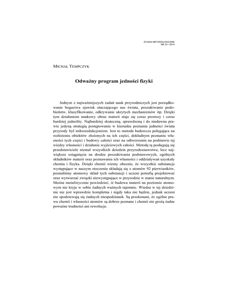 STUDIA METODOLOGICZNE NR 33 • 2014 MICHAŁ TEMPCZYK Odważny program jedności fizyki Jednym z najważniejszych zadań nauk przyrodniczych jest porządkowanie bogactwa zjawisk otaczającego nas świata, poszukiwanie podobieństw, klasyfikowanie, odkrywanie ukrytych mechanizmów itp. Dzięki tym działaniom naukowy obraz materii staje się coraz prostszy i coraz bardziej jednolity. Najbardziej skuteczną, sprawdzoną i do niedawna prawie jedyną strategią postępowania w kierunku poznania jedności świata przyrody był mikroredukcjonizm. Jest to metoda badawcza polegająca na rozłożeniu obiektów złożonych na ich części, dokładnym poznaniu własności tych części i budowy całości oraz na odtworzeniu na podstawie tej wiedzy własności i działania wyjściowych całości. Metodą tą posługują się przedstawiciele niemal wszystkich dziedzin przyrodoznawstwa, lecz największe osiągnięcia na drodze poszukiwania podstawowych, ogólnych składników materii oraz poznawania ich własności i oddziaływań uzyskały chemia i fizyka. Dzięki chemii wiemy obecnie, że wszystkie substancje występujące w naszym otoczeniu składają się z atomów 92 pierwiastków, poznaliśmy atomowy skład tych substancji i uczeni potrafią projektować oraz wytwarzać związki niewystępujące w przyrodzie w stanie naturalnym. Można metaforycznie powiedzieć, iż budowa materii na poziomie atomowym nie kryje w sobie żadnych ważnych tajemnic. Wiedza w tej dziedzinie nie jest wprawdzie kompletna i nigdy taka nie będzie, jednak uczeni nie spodziewają się żadnych niespodzianek. Są przekonani, że ogólne prawa chemii i własności atomów są dobrze poznane i chemii nie grożą żadne poważne trudności ani rewolucje. 12 MICHAŁ TEMPCZYK Starożytni atomiści byli przekonani, iż na atomach wiedza o budowie materii się kończy, ponieważ są one niepodzielne, niezniszczalne i nie mają części. Pogląd ten okazał się fałszywy i dzięki rozwojowi fizyki w ostatnich stu latach uczeni poznali budowę atomów, jąder atomowych, cząstek elementarnych i ich składników, dlatego obecnie są pewni, że droga schodzenia na coraz niższe poziomy budowy materii już się skończyła, ponieważ te najmniejsze cegiełki materii, które są przedmiotem ich badań, nie posiadają części i dzięki temu tworzą najniższy możliwy poziom struktury całego świata przyrody. Dzięki temu mikroredukcjonistyczna metoda poznawania świata doszła do swojego kresu, dlatego warto zastanowić się nad tym, jaki obraz świata powstał w efekcie jej zastosowania i zadać pytanie, czy i w jaki sposób nauka może poszukiwać jeszcze ogólniejszej i głębszej jedności materii. Jest to pytanie niezwykle ważne, ponieważ świat podstawowych składników materii, ich własności i oddziaływań, nie jest wcale prosty ani jednolity. Aby się o tym przekonać, przyjrzymy się pod tym kątem najważniejszym założeniom powszechnie obecnie akceptowanej teorii cząstek elementarnych, nazywanej Modelem Standardowym [Perkins, 2004]. Zaczniemy od pytania o liczbę rodzajów cząstek elementarnych, które dzielą się na kilka grup. Najważniejsze są dwie grupy – leptony i kwarki. Leptonów jest sześć: elektron i neutrino elektronowe, mion i neutrino mionowe oraz taon i jego neutrino. Tak naprawdę jest ich dwanaście, ponieważ każda z tych cząstek ma swoją antycząstkę; na przykład antycząstką elektronu jest pozyton. Kwarków także jest sześć i mają one swoje antycząstki. Do tych rodzin należy dodać grupę ośmiu gluonów, które są nośnikami oddziaływań kolorowych zachodzących między kwarkami. W rezultacie składników tych trzech podstawowych rodzin i ich antycząstek jest czterdzieści, lecz na tym nie koniec, ponieważ do tych cząstek należy jeszcze dodać foton, który jest nośnikiem sił elektromagnetycznych, oraz postulowany przez kwantową teorię grawitacji grawiton, którego dotychczas nie zaobserwowano. Teoria oddziaływań elektrosłabych, która stanowi ważny składnik Modelu Standardowego i o której będzie mowa poniżej, jest oparta na bozonach pośredniczących W+, W- i Z0, które są niezależnymi cząstkami elementarnymi. W sumie Model Standardowy zakłada istnienie Odważny program jedności fizyki 13 czterdziestu pięciu rodzajów podstawowych składników materii, z których są zbudowane wszystkie pozostałe ciała fizyczne lub które są nośnikami wszystkich sił przyrody. Istnienie tych cząstek jest dobrze potwierdzone, lecz na tym sprawa się nie kończy, ponieważ fizykom bardzo potrzebny jest bozon Higgsa, którego poszukują już 50 lat. Niedawny eksperyment przeprowadzony w CERN, o którym będzie dalej mowa, pozwala wierzyć, że bozon ten rzeczywiście istnieje. Jednorazowy rezultat nie wystarcza do uznania istnienia poszukiwanej cząstki, dlatego fizycy rozpoczęli przebudowę akceleratora w CERN, prowadzącą do zwiększenia jego mocy. Dzięki temu będzie można przeprowadzić eksperyment dla większego przedziału energii zderzeń. Mają oni nadzieję na pozytywny wynik. Brak takiego wyniku byłby powodem ogromnego zamieszania i podstawowych wątpliwości dotyczących Modelu Standardowego. Na podaną powyżej liczbę można spojrzeć dwojako. Z jednej strony jest to mało w porównaniu z bogactwem atomów, związków chemicznych i rodzajów ciał znanych nam z codziennego doświadczenia, dlatego fizycy mogą być zadowoleni, że udało im się poznać i opisać w jednolity, spójny sposób podstawową warstwę budowy świata fizycznego. Jednak z drugiej strony ten obraz daleki jest od jedności, gdy przez jedność rozumiemy ideał odkrycia i zbadania jednakowej natury tych wszystkich cząstek. Kwarki, gluony, leptony, bozony pośredniczące i fotony to zbiór obiektów bardzo różniących się pod względem mas, spinów, ładunków elektrycznych i rodzajów oddziaływań, w których biorą udział. Można zatem powiedzieć, że materia na tym pod