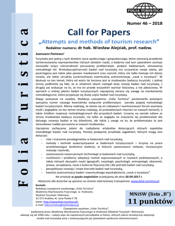 Fo li a Tu r i s ti c a Numer 46 – 2018 Call for Papers „Attempts and methods of tourism research” Redaktor numeru: dr hab. Wiesław Alejziak, prof. nadzw. Szanowni Paostwo! Turystyka jest jedną z tych dziedzin życia społecznego i gospodarczego, które stanowią przedmiot zainteresowania reprezentantów różnych dziedzin nauki, a badania nad tym zjawiskiem cechuje niezwykła wręcz różnorodnośd poruszanej problematyki, podjeśd badawczych, stosowanej metodologii itd. Wielodyscyplinarnośd badao nad turystyką ma oczywiście swoje zalety, ale postrzegana jest także jako pewien mankament oraz czynnik, który nie tylko hamuje ich dalszy rozwój, ale także utrudnia (uniemożliwia) ewentualną autonomizację „nauk o turystyce”. W dyskusji na ten temat, która od wielu lat toczona jest w środowisku badaczy turystyki, z jednej strony podkreśla się fakt, że w ostatnich latach nastąpił duży rozwój badao nad turystyką, z drugiej zaś wskazuje na to, że ma on przede wszystkim wymiar ilościowy, a nie jakościowy. W opiniach o niskiej jakości badao turystycznych najczęściej zwraca się uwagę na mankamenty metodologiczne, które przypisuje się dużej części badao nad turystyką. Mając powyższe na uwadze, Redakcja czasopisma „Folia Turistica” postanowiła poświęcid specjalny numer naszego kwartalnika wyłącznie problematyce szeroko pojętej metodologii badao turystycznych. Mamy nadzieję, że stanie się on ciekawym i wartościowym forum wymiany myśli i poglądów na ten temat (mamy nadzieję, że prowadzonych również na naszych łamach), a także źródłem inspiracji metodologicznych dla przyszłych badao. Liczymy na szeroki odzew ze strony środowiska badaczy turystyki, nie tylko ze względu na znaczenie tej problematyki dla dalszego rozwoju badao w tej dziedzinie, ale także z uwagi na to, że problematyka ta jest stosunkowo rzadko poruszana w naszym środowisku. Uprzejmie zachęcamy zatem do nadsyłania artykułów dotyczących różnych aspektów metodologii badao nad turystyką. Poniżej podajemy przykłady zagadnieo, których mogą one dotyczyd: rola i znaczenie paradygmatów w badaniach nad turystyką, metody i techniki wykorzystywane w badaniach turystycznych – liczymy na prace przedstawiające konkretne badania, w których zastosowano ciekawe, innowacyjne metody i techniki, zastosowanie nowoczesnych technologii w badaniach nad turystyką, możliwości i problemy adaptacji metod wypracowanych w naukach podstawowych, a także różnych dyscyplin nauki (geografii, socjologii, psychologii, antropologii, ekonomii, prawa, zarządzania, nauk o kulturze fizycznej itd.) dla potrzeb badao nad turystyką, perspektywy rozwoju i nowe kierunki badao nad turystyką, kwestia autonomizacji badao i ewentualnego wyodrębnienia „nauk o turystyce” Na artykuły w języku angielskim oczekujemy do dnia 30.09.2017 r. Wytyczne dla Autorów są opisane na stronie internetowej Czasopisma: www.folia-turistica.pl. Kontakt: Redakcja czasopisma naukowego „Folia Turistica” Akademia Wychowania Fizycznego w Krakowie, Wydział Turystyki i Rekreacji 31-571 Kraków, Al. Jana Pawła II 78 www: http://www.folia-turistica.pl/, e-mail: [email protected] Czasopismo naukowe „Folia Turistica”, wydawane przez Akademię Wychowania Fizycznego w Krakowie (Wydział Turystyki i Rekreacji), ukazuje się od 1990 roku – należy więc do najstarszych periodyków w Polsce, których zakres tematyczny obejmuje studia nad turystyką wraz z towarzyszącymi jej zjawiskami społeczno-ekonomicznymi. MNiSW (lista „B”) 11 punktów