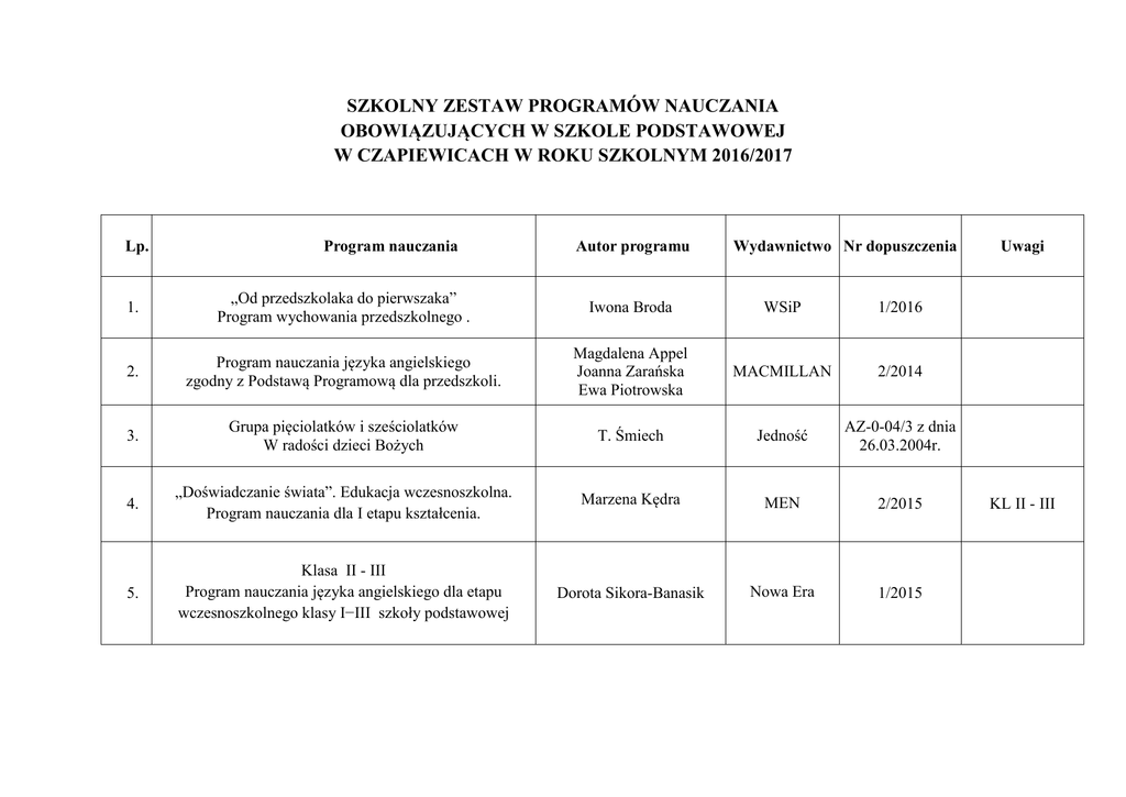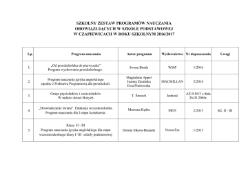 SZKOLNY ZESTAW PROGRAMÓW NAUCZANIA OBOWIĄZUJĄCYCH W SZKOLE PODSTAWOWEJ W CZAPIEWICACH W ROKU SZKOLNYM 2016/2017 Lp. Program nauczania Autor programu Wydawnictwo Nr dopuszczenia 1. „Od przedszkolaka do pierwszaka” Program wychowania przedszkolnego . Iwona Broda WSiP 1/2016 2. Program nauczania języka angielskiego zgodny z Podstawą Programową dla przedszkoli. Magdalena Appel Joanna Zarańska Ewa Piotrowska MACMILLAN 2/2014 3. Grupa pięciolatków i sześciolatków W radości dzieci Bożych T. Śmiech Jedność AZ-0-04/3 z dnia 26.03.2004r. 4. „Doświadczanie świata”. Edukacja wczesnoszkolna. Program nauczania dla I etapu kształcenia. Marzena Kędra MEN 2/2015 5. Klasa II - III Program nauczania języka angielskiego dla etapu wczesnoszkolnego klasy I−III szkoły podstawowej Dorota Sikora-Banasik Nowa Era 1/2015 Uwagi KL II - III 6. Klasa II-III Program nauczania religii W rodzinie dzieci Bożych ks. T. Śmiech, E. Kondrak, B. Nosek Jedność AZ-1-01/12 z dnia 4.01.2012r. 7. Między nami. Program nauczania języka polskiego dla drugiego etapu edukacyjnego klasy IV -VI szkoły podstawowej (dla nowej podstawy programowej) Agnieszka Łuczak Anna Murdzek GWO 2/2012 8. Klasa IV – V Program nauczania języka angielskiego dla II etapu kształcenia w klasach IV–VI szkoły podstawowej Dorota Wosińska Nowa Era 3/2015 9. „Wczoraj i dziś” Program nauczania ogólnego historii i społeczeństwa w klasach IV- VI szkoły podstawowej dr Tomasz Maćkowski Nowa Era 3/2012 10. „Do dzieła!” Program nauczania ogólnego plastyki w klasach IV-VI szkoły podstawowej J. Lukas K. Onak Nowa Era 6/2012 11. „I gra muzyka” Program nauczania ogólnego muzyki w klasach IV-VI szkoły podstawowej M. Gromek G. Kilbach Nowa Era 7/2012 12. Program wychowania fizycznego dla II etapu edukacyjnego „Ruch to życie” A. Tywoniuk-Małysz R. Małysz Bea - Bleja 9/2012 13. Matematyka z plusem. Program nauczania matematyki dla drugiego etapu edukacyjnego (klasy IV -VI szkoły podstawowej) Zgodny z podstawą programową z grudnia 2008r. M. Jucewicz M.Karpiński J. Lech GWO 10/2012 14. Klasa IV – V „Lubię to” – Program nauczania zajęć komputerowych dla klas 4 – 6 szkoły podstawowej Michał Kęska Nowa Era 5/2015 15. „Jak to działa” Program nauczania zajęć technicznych w klasach IV-VI szkoły podstawowej L. Łabecki Nowa Era 12/2012 16. Klasa IV – V Program nauczania przyrody w klasach 4–6 szkoły podstawowej „Na tropach przyrody” Barbara Dziedzic Nowa Era 5/2015 17. Klasy IV-VI Program nauczania religii Odkrywamy tajemnice Bożego świata ks K. Mielnicki, E. Kondrak, B. Nosek Jedność AZ-2-02/12 z dnia 30.05.2012r. 18. Klasy VI Program nauczania języka angielskiego zgodny z nową podstawą programową dla II etapu edukacyjnego. Ewa Piotrowska Tomasz Sztyber MACMILLAN 1/2012 19. Program nauczania przyrody w szkole podstawowej „Przyrodo, witaj!” Ewa Gromek, Ewa Kłos Wawrzyniec Kofta Ewa Laskowska Andrzej Melson WSiP 20. Odkrywamy na nowo. „Zajęcia komputerowe” Program nauczania dla szkoły podstawowej klas IV-VI dla II etapu edukacyjnego. W. Hermanowski OPERON 4/2012 Kl. VI 11/2012 KL. VI "Własna historia i kultura (Kaszubów)" Program nauczania przedmiotu w klasie V szkoły podstawowej 21. (II etap edukacyjny) 22. „Z kaszebsczim w szkole” Program nauczania języka kaszubskiego z elementami wiedzy o Kaszubach w klasach I –VI Katarzyna Olszewska Magdalena Rudnik --- 2/2013 Teresa Czerwińska Aleksandra Pająk Lucyna Sorn Zrzeszenie KaszubskoPomorskie Gdańsk 8/2012