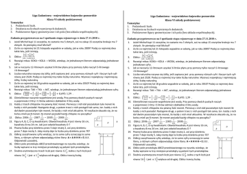 Liga Zadaniowa - województwo kujawsko-pomorskie Klasa VI szkoły podstawowej Tematyka: 1. Podzielność liczb. 2. Działania na liczbach wymiernych dodatnich. 3. Podstawowe figury geometryczne i ich pola (bez układu współrzędnych). Zadania przygotowawcze na I spotkanie etapu rejonowego w dniu 27.11.2010 r. 1. Jeżeli Michał kupi 11 zeszytów, to zastanie mu 5 złotych, zaś na zakup 15 zeszytów brakuje mu 7 złotych. Ile pieniędzy miał Michał? 2. Za ile co najmniej lat 21 listopada wypadnie w sobotę, jak w roku 2009? Podaj co najmniej dwa takie lata, jeśli istnieją. ( Oblicz: 4. 8. Rozwiąż rebus: KOKA + KOLA = WODA, wiedząc, że jednakowym literom odpowiadają jednakowe cyfry. Jak w naczyniu 12-litrowym uzyskad 6 litrów płynu przy pomocy tylko naczyo 5-litrowego i 8-litrowego? Liczba naturalna nazywa się żółtą jeśli zapisana jest przy pomocy różnych cyfr i iloczyn tych cyfr równy jest 2520. Podaj co najmniej trzy takie liczby naturalne. Wyznacz największą i najmniejszą żółtą liczbę naturalną. Za ile co najmniej lat 18 grudnia wypadnie w sobotę, jak w roku 2010? Podaj co najmniej dwa takie lata, jeśli istnieją. Rozwiąż rebus: TAK + TKA = AKT, wiedząc, że jednakowym literom odpowiadają jednakowe cyfry. 9. Oblicz: ( 5. 6. 7. ) ) ( ) Zadania przygotowawcze na I spotkanie etapu rejonowego w dniu 27.11.2010 r. 1. Jeżeli Michał kupi 11 zeszytów, to zastanie mu 5 złotych, zaś na zakup 15 zeszytów brakuje mu 7 złotych. Ile pieniędzy miał Michał? 2. Za ile co najmniej lat 21 listopada wypadnie w sobotę, jak w roku 2009? Podaj co najmniej dwa takie lata, jeśli istnieją. i jest o większa od drugiej. Oblicz trzecią liczbę. ( ) 3. Oblicz: 4. Rozwiąż rebus: KOKA + KOLA = WODA, wiedząc, że jednakowym literom odpowiadają jednakowe cyfry. Jak w naczyniu 12-litrowym uzyskad 6 litrów płynu przy pomocy tylko naczyo 5-litrowego i 8-litrowego? Liczba naturalna nazywa się żółtą jeśli zapisana jest przy pomocy różnych cyfr i iloczyn tych cyfr równy jest 2520. Podaj co najmniej trzy takie liczby naturalne. Wyznacz największą i najmniejszą żółtą liczbę naturalną. Za ile co najmniej lat 18 grudnia wypadnie w sobotę, jak w roku 2010? Podaj co najmniej dwa takie lata, jeśli istnieją. Rozwiąż rebus: TAK + TKA = AKT, wiedząc, że jednakowym literom odpowiadają jednakowe cyfry. 5. 6. 7. 8. . 10. Ośmiolitrowe naczynie wypełnione jest wodą. Przy pomocy dwóch pustych naczyo o pojemności 3 litry i 5 litrów odmierz dokładnie 4 litry wody. 11. Każdy z trzech chłopców ma pewną ilośd monet. Pierwszy z nich dał pozostałym tyle monet ile każdy z nich posiadał. Następnie drugi, a potem trzeci z nich postąpili tak samo, tzn. każdy z nich dał dwóm pozostałym tyle monet, ile każdy z nich miał aktualnie. W rezultacie okazało się, że na koocu mieli po 8 monet. Ile monet posiadał każdy chłopiec na początku? 12. Oblicz: . 13. Figury A, B, C, D są kwadratami. Obwód kwadratu A jest równy 16 cm, a kwadratu B ma 24 cm. Jaki jest odwód kwadratu D ? 14. Pewna liczba przy dzieleniu przez 5 daje resztę 2, zaś przy dzieleniu przez 7 daje resztę 5. Jaką resztę daje ta liczba przy dzieleniu przez 70? 15. Odkryj zaszyfrowane cyfry wiedząc, że te same cyfry oznaczają te same litery, a różnym cyfrom odpowiadają różne litery: A + A H H H = E J J J . Odpowiedź uzasadnij. 16. Oblicz pole prostokąta ABCD przedstawionego na rysunku wiedząc, że liczby wpisane w trzy mniejsze prostokąty są polami tych prostokątów. 17. Średnia arytmetyczna trzech liczb jest równa . Jedna z tych liczb jest równa Klasa VI szkoły podstawowej Tematyka: 1. Podzielność liczb. 2. Działania na liczbach wymiernych dodatnich. 3. Podstawowe figury geometryczne i ich pola (bez układu współrzędnych). ) 3. ( Liga Zadaniowa - województwo kujawsko-pomorskie 9. ( ) Oblicz: ( ) ( ) . 10. Ośmiolitrowe naczynie wypełnione jest wodą. Przy pomocy dwóch pustych naczyo o pojemności 3 litry i 5 litrów odmierz dokładnie 4 litry wody. 11. Każdy z trzech chłopców ma pewną ilośd monet. Pierwszy z nich dał pozostałym tyle monet ile każdy z nich posiadał. Następnie drugi, a potem trzeci z nich postąpili tak samo, tzn. każdy z nich dał dwóm pozostałym tyle monet, ile każdy z nich miał aktualnie. W rezultacie okazało się, że na koocu mieli po 8 monet. Ile monet posiadał każdy chłopiec na początku? 12. Oblicz: . 13. Figury A, B, C, D są kwadratami. Obwód kwadratu A jest równy 16 cm, a kwadratu B ma 24 cm. Jaki jest odwód kwadratu D ? 14. Pewna liczba przy dzieleniu przez 5 daje resztę 2, zaś przy dzieleniu przez 7 daje resztę 5. Jaką resztę daje ta liczba przy dzieleniu przez 70? 15. Odkryj zaszyfrowane cyfry wiedząc, że te same cyfry oznaczają te same litery, a różnym cyfrom odpowiadają różne litery: A + A H H H = E J J J . Odpowiedź uzasadnij. 16. Oblicz pole prostokąta ABCD przedstawionego na rysunku wiedząc, że liczby wpisane w trzy mniejsze prostokąty są polami tych prostokątów. 17. Średnia arytmetyczna trzech liczb jest równa . Jedna z tych liczb jest równa i jest o większa od drugiej. Oblicz trzecią liczbę. 18. Odkryj zaszyfrowane cyfry w podanym działaniu wiedząc, że te same litery oznaczają te same cyfry, a różnym cyfrom odpowiadają różne litery: BIS + BIS + BIS + BIS = GIM. 18. Odkryj zaszyfrowane cyfry w podanym działaniu wiedząc, że te same litery oznaczają te same cyfry, a różnym cyfrom odpowiadają różne litery: BIS + BIS + BIS + BIS = GIM. 19. Oblicz: . 20. Liczba k przy dzieleniu przez 7 daje resztę 4. Liczba t przy dzieleniu przez 7 daje resztę 3. Wyznacz resztę z dzielenia przez 7 iloczynu tych liczb. 21. Uzasadnij, że każda z liczb 1007,10017,100117, . . . dzieli się przez 53. 22. Znajdź najmniejszą liczbę czterocyfrową SAAM taką, że MI + FUKO = SAAM. 23. Liczba naturalna nazywa się dobrą jeśli zapisana jest przy pomocy różnych cyfr i iloc