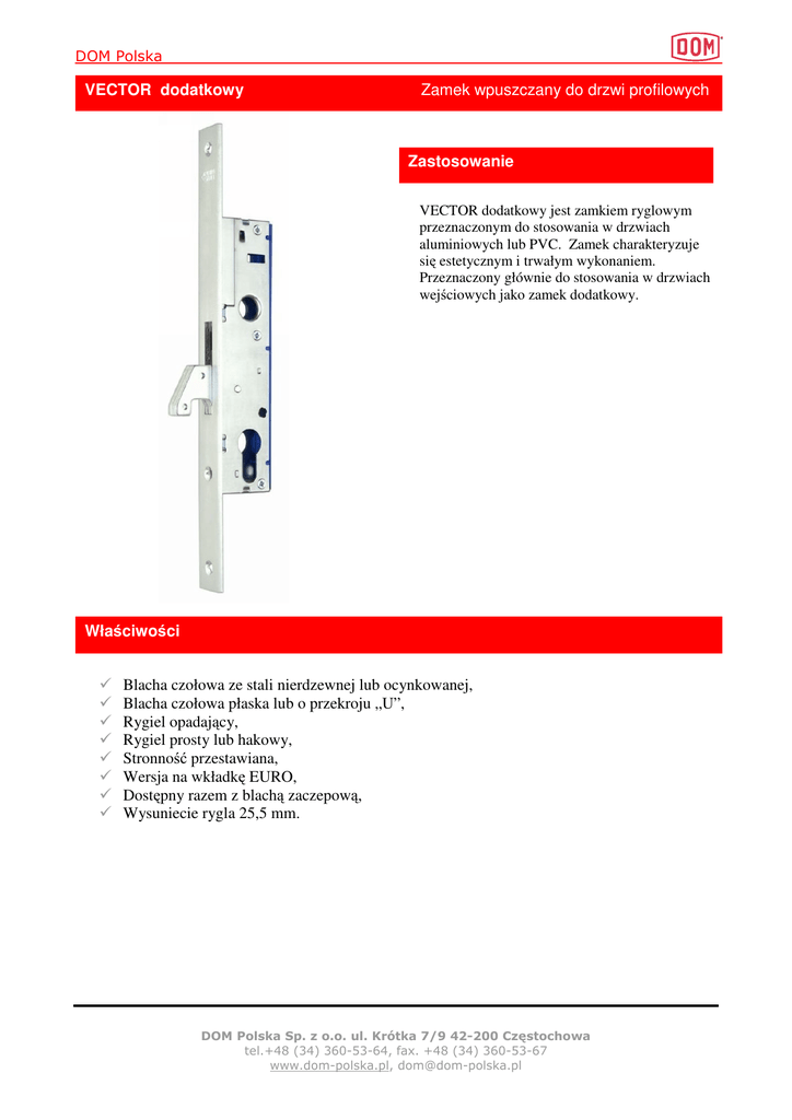 DOM Polska VECTOR dodatkowy Zamek wpuszczany do drzwi profilowych Zastosowanie VECTOR dodatkowy jest zamkiem ryglowym przeznaczonym do stosowania w drzwiach aluminiowych lub PVC. Zamek charakteryzuje się estetycznym i trwałym wykonaniem. Przeznaczony głównie do stosowania w drzwiach wejściowych jako zamek dodatkowy. Właściwości Blacha czołowa ze stali nierdzewnej lub ocynkowanej, Blacha czołowa płaska lub o przekroju „U”, Rygiel opadający, Rygiel prosty lub hakowy, Stronność przestawiana, Wersja na wkładkę EURO, Dostępny razem z blachą zaczepową, Wysuniecie rygla 25,5 mm. DOM Polska Sp. z o.o. ul. Krótka 7/9 42-200 Częstochowa tel.+48 (34) 360-53-64, fax. +48 (34) 360-53-67 www.dom-polska.pl, [email protected] DOM Polska VECTOR dodatkowy Zamek wpuszczany do drzwi profilowych Wymiary DOM Polska Sp. z o.o. ul. Krótka 7/9 42-200 Częstochowa tel.+48 (34) 360-53-64, fax. +48 (34) 360-53-67 www.dom-polska.pl, [email protected]