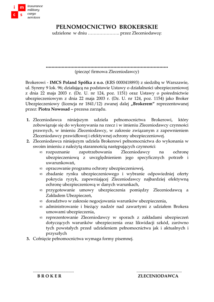 i m c s insurance military cargo services PEŁNOMOCNICTWO BROKERSKIE udzielone w dniu …………………. przez Zleceniodawcę: ..................................................................................... (pieczęć firmowa Zleceniodawcy) Brokerowi - IMCS Poland Spółka z o.o. (KRS 0000418893) z siedzibą w Warszawie, ul. Syreny 9 lok. 96; działającą na podstawie Ustawy o działalności ubezpieczeniowej z dnia 22 maja 2003 r. (Dz. U. nr 124, poz. 1151) oraz Ustawy o pośrednictwie ubezpieczeniowym z dnia 22 maja 2003 r. (Dz. U. nr 124, poz. 1154) jako Broker Ubezpieczeniowy (licencja nr 1841/12) zwanej dalej „Brokerem” reprezentowanej przez: Piotra Nowosad – prezesa zarządu. 1. Zleceniodawca niniejszym udziela pełnomocnictwa Brokerowi, który zobowiązuje się do wykonywania na rzecz i w imieniu Zleceniodawcy czynności prawnych, w imieniu Zleceniodawcy, w zakresie związanym z zapewnieniem Zleceniodawcy prawidłowej i efektywnej ochrony ubezpieczeniowej. 2. Zleceniodawca niniejszym udziela Brokerowi pełnomocnictwa do wykonania w swoim imieniu z należytą starannością następujących czynności: • rozpoznanie zapotrzebowania Zleceniodawcy na ochronę ubezpieczeniową z uwzględnieniem jego specyficznych potrzeb i uwarunkowań, • opracowanie programu ochrony ubezpieczeniowej, • zbadanie rynku ubezpieczeniowego i wybranie odpowiedniej oferty pokrycia ryzyk, zapewniającej Zleceniodawcy najbardziej efektywną ochronę ubezpieczeniową w danych warunkach, • przygotowanie umowy ubezpieczenia pomiędzy Zleceniodawcą a Zakładem Ubezpieczeń, • doradztwo w zakresie negocjowania warunków ubezpieczenia, • administrowanie i bieżący nadzór nad zawartymi z udziałem Brokera umowami ubezpieczenia, • reprezentowanie Zleceniodawcy w sporach z zakładami ubezpieczeń dotyczących warunków ubezpieczenia oraz likwidacji szkód, zarówno tych powstałych przed udzieleniem pełnomocnictwa jak i aktualnych i przyszłych 3. Cofnięcie pełnomocnictwa wymaga formy pisemnej. ...................................... BROKER .......................................... ZLECENIODAWCA